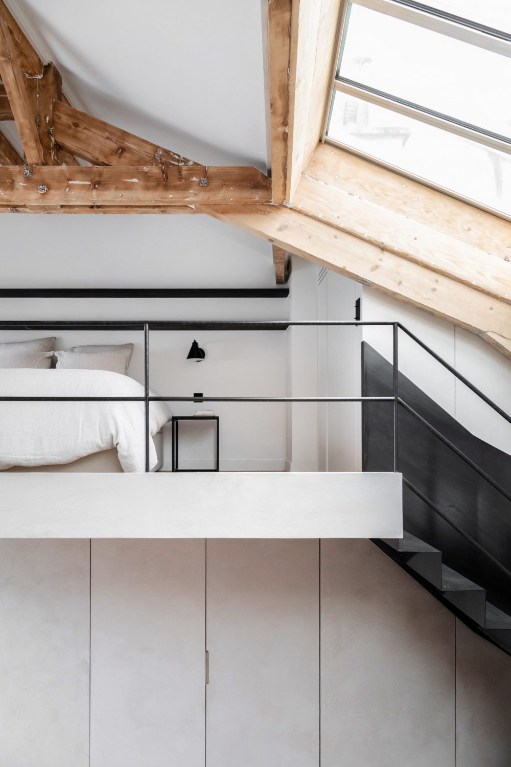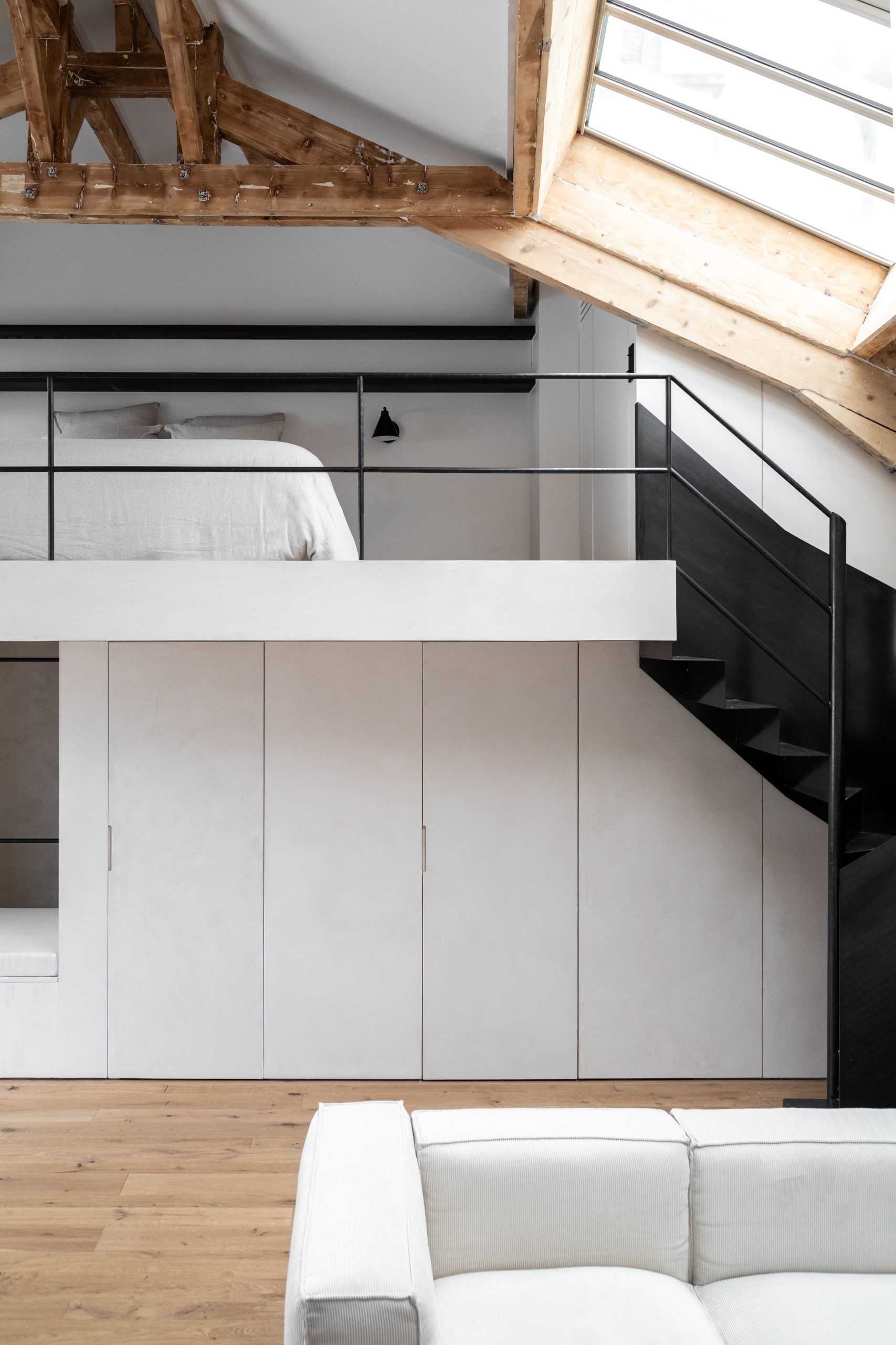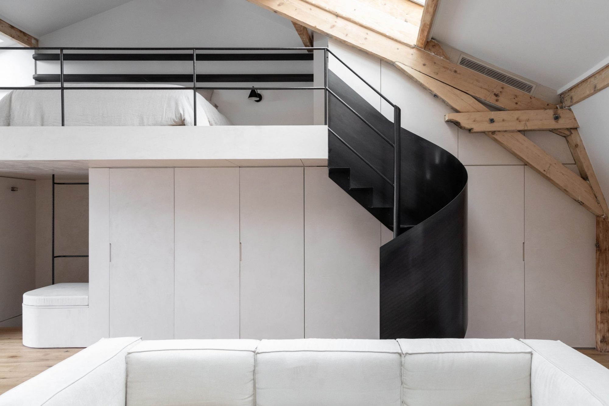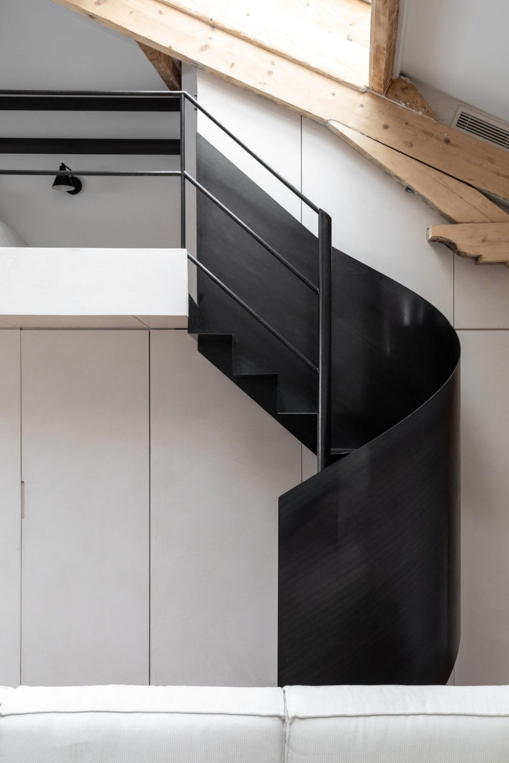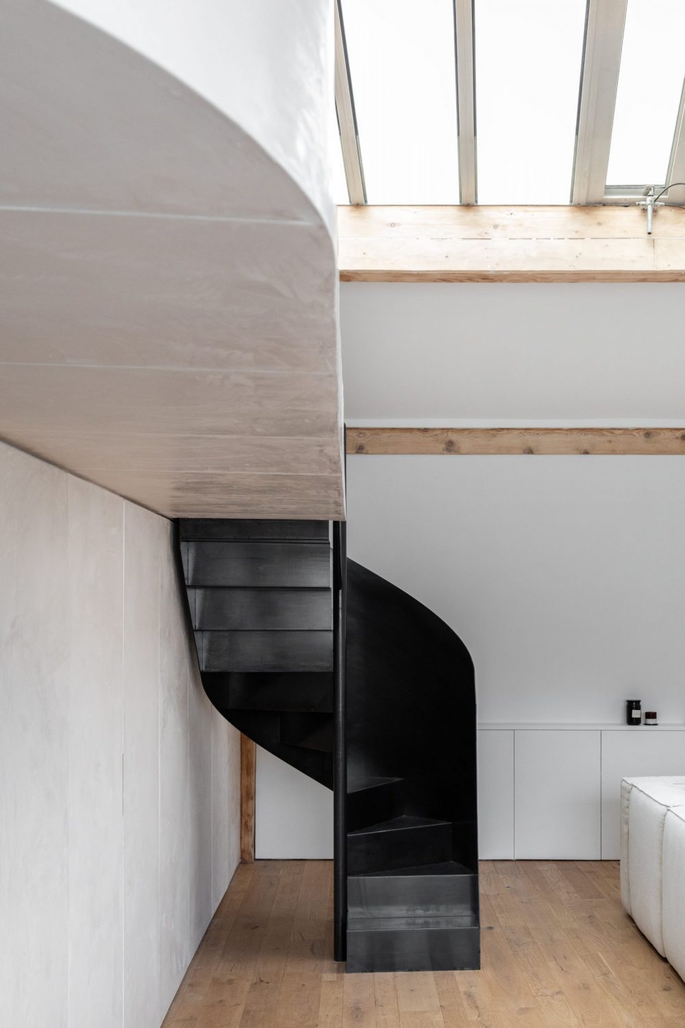 Saussure is a minimal space located in Paris, France, designed by Atelier Leymarie Gourdon. The agency works in a variety of fields, including new construction and renovations for both individual homes and small collectives, as well as public cultural facilities and hospitality venues. Structural choices and implementation are oriented towards simple and economical solutions, using durable and high quality materials. Passionate about detail, the agency develops architecture that explores the relationships between materials, textures, and finishing solutions, with the help of our artisan partners. Each architectural project is unique and finds meaning in the essentials. The gabled roof in this design was left exposed, creating extra vertical space for a lofted bedroom. Skylights bring in plenty of natural light from above, while a sculptural spiral metal staircase connects the ground floor to the loft.