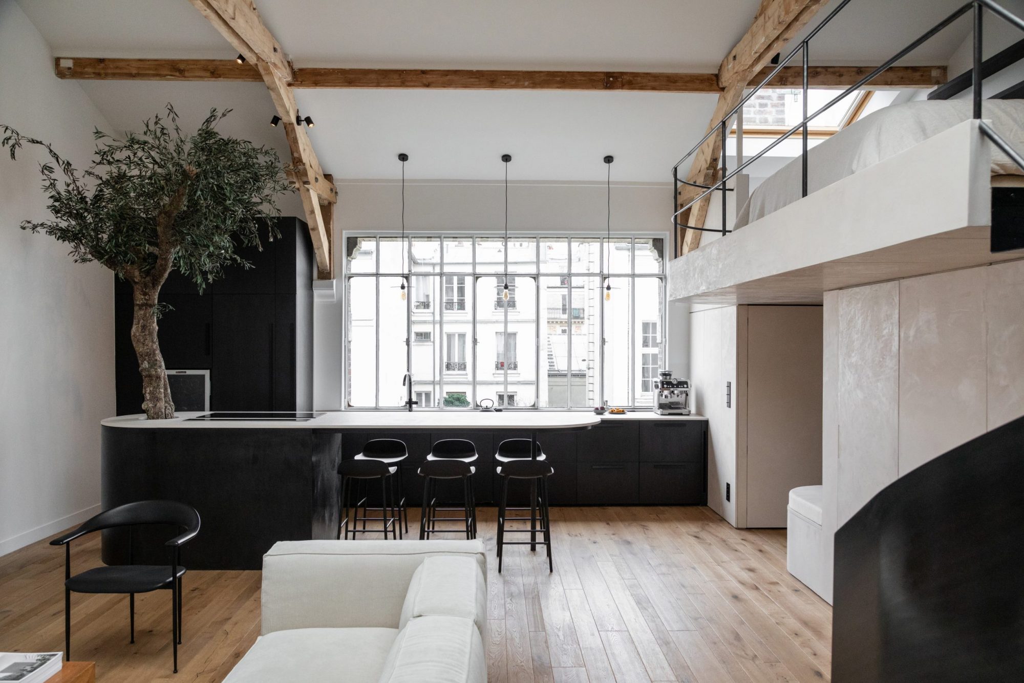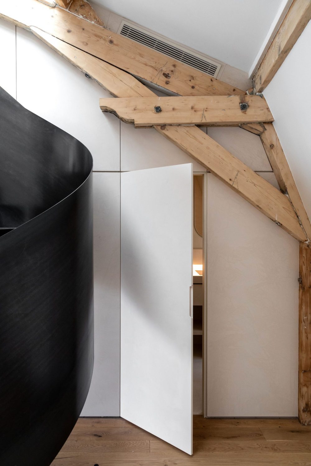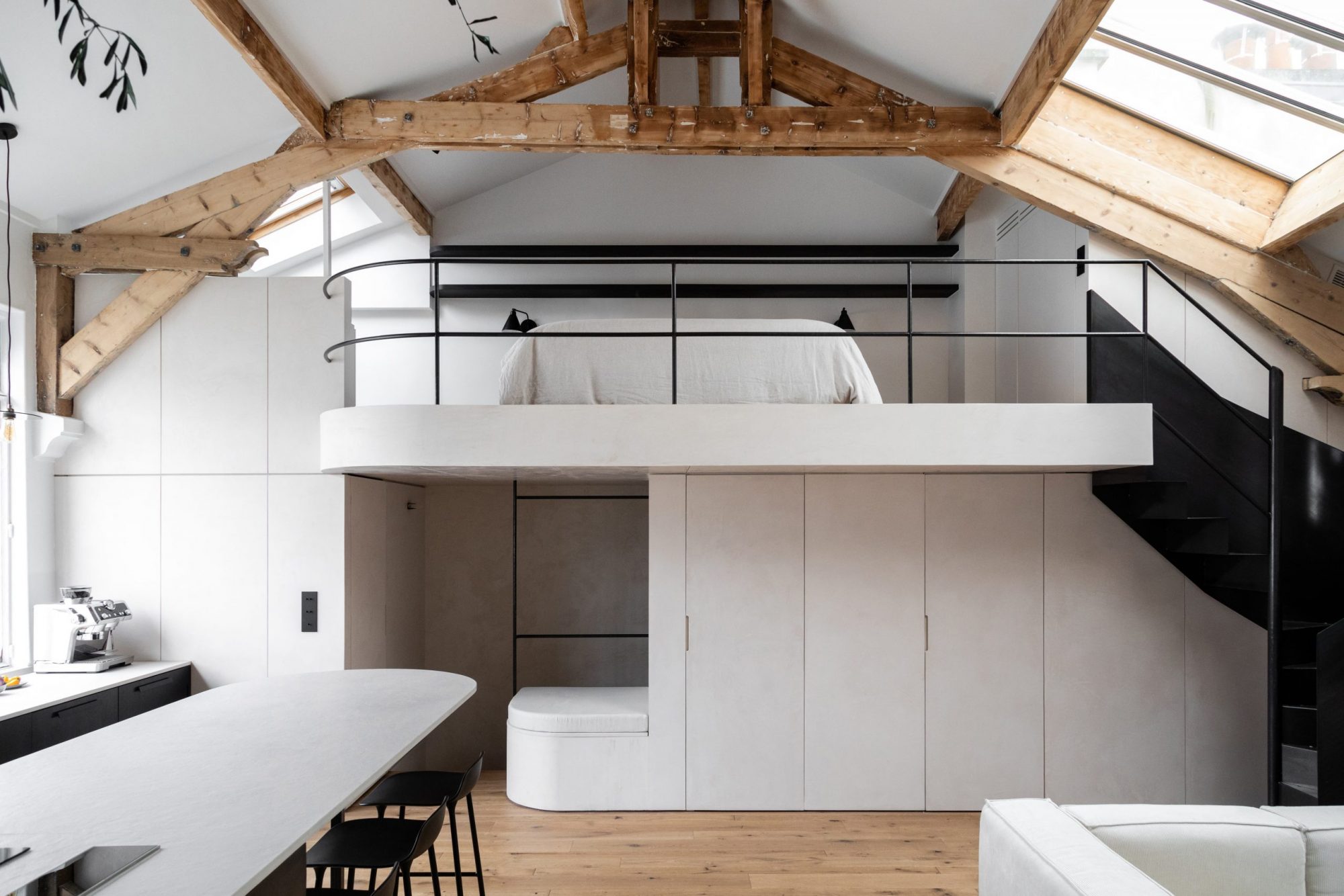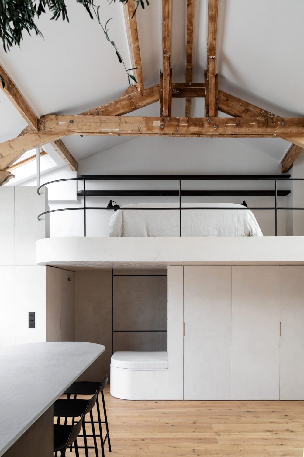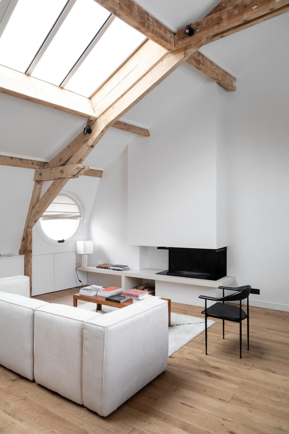 Saussure is a minimal space located in Paris, France, designed by Atelier Leymarie Gourdon. The agency works in a variety of fields, including new construction and renovations for both individual homes and small collectives, as well as public cultural facilities and hospitality venues. Structural choices and implementation are oriented towards simple and economical solutions, using durable and high quality materials. Passionate about detail, the agency develops architecture that explores the relationships between materials, textures, and finishing solutions, with the help of our artisan partners. Each architectural project is unique and finds meaning in the essentials. The gabled roof in this design was left exposed, creating extra vertical space for a lofted bedroom. Skylights bring in plenty of natural light from above, while a sculptural spiral metal staircase connects the ground floor to the loft.