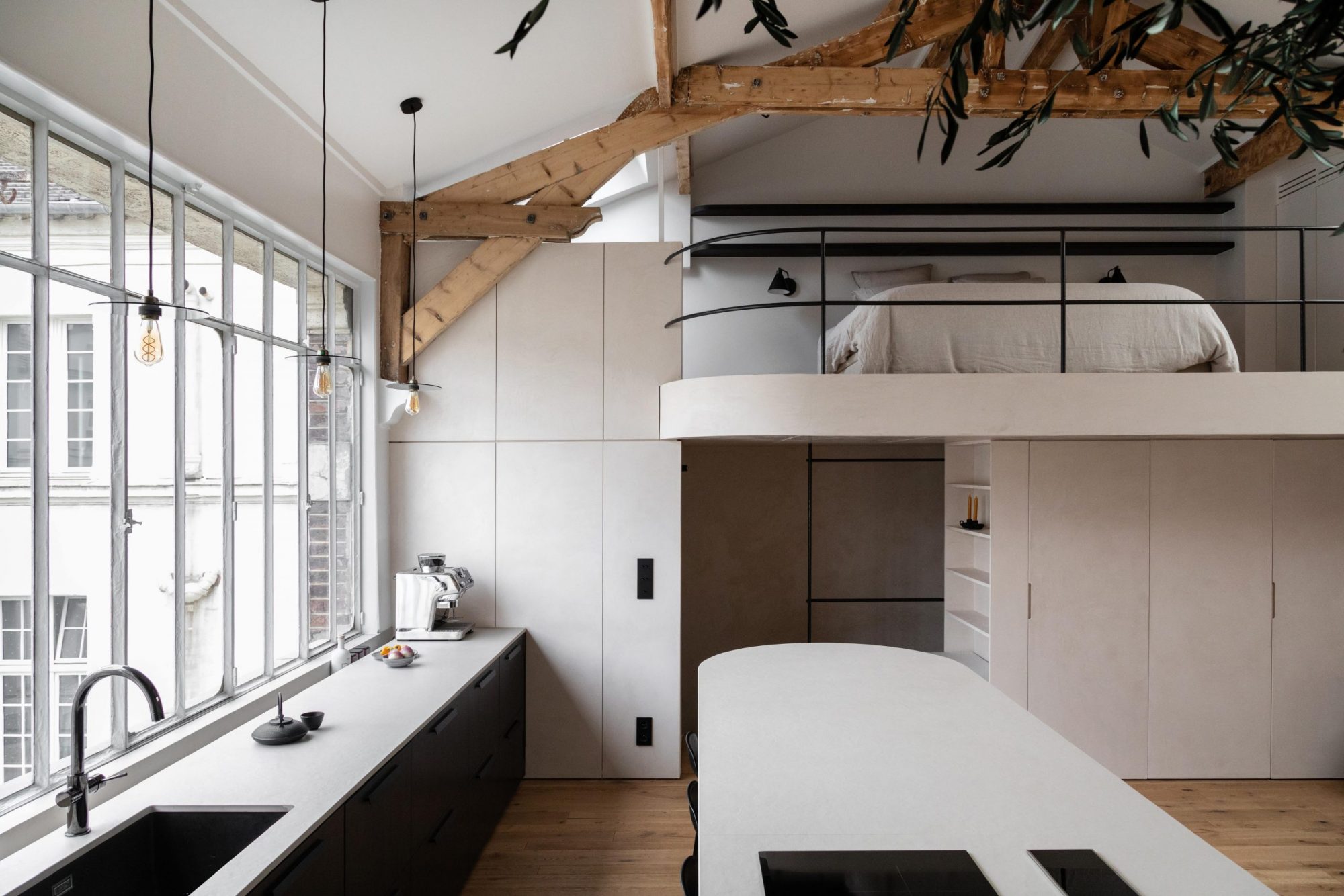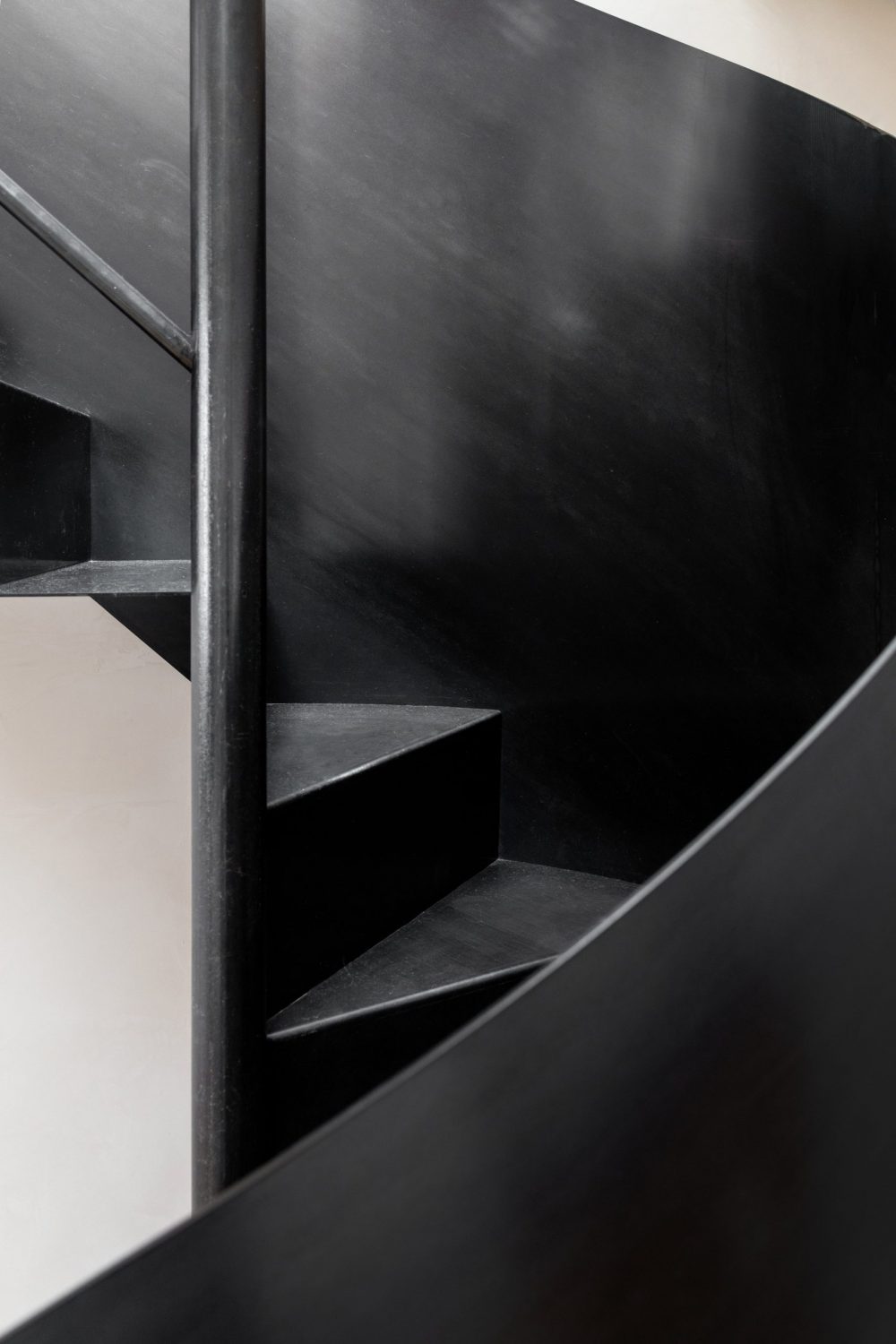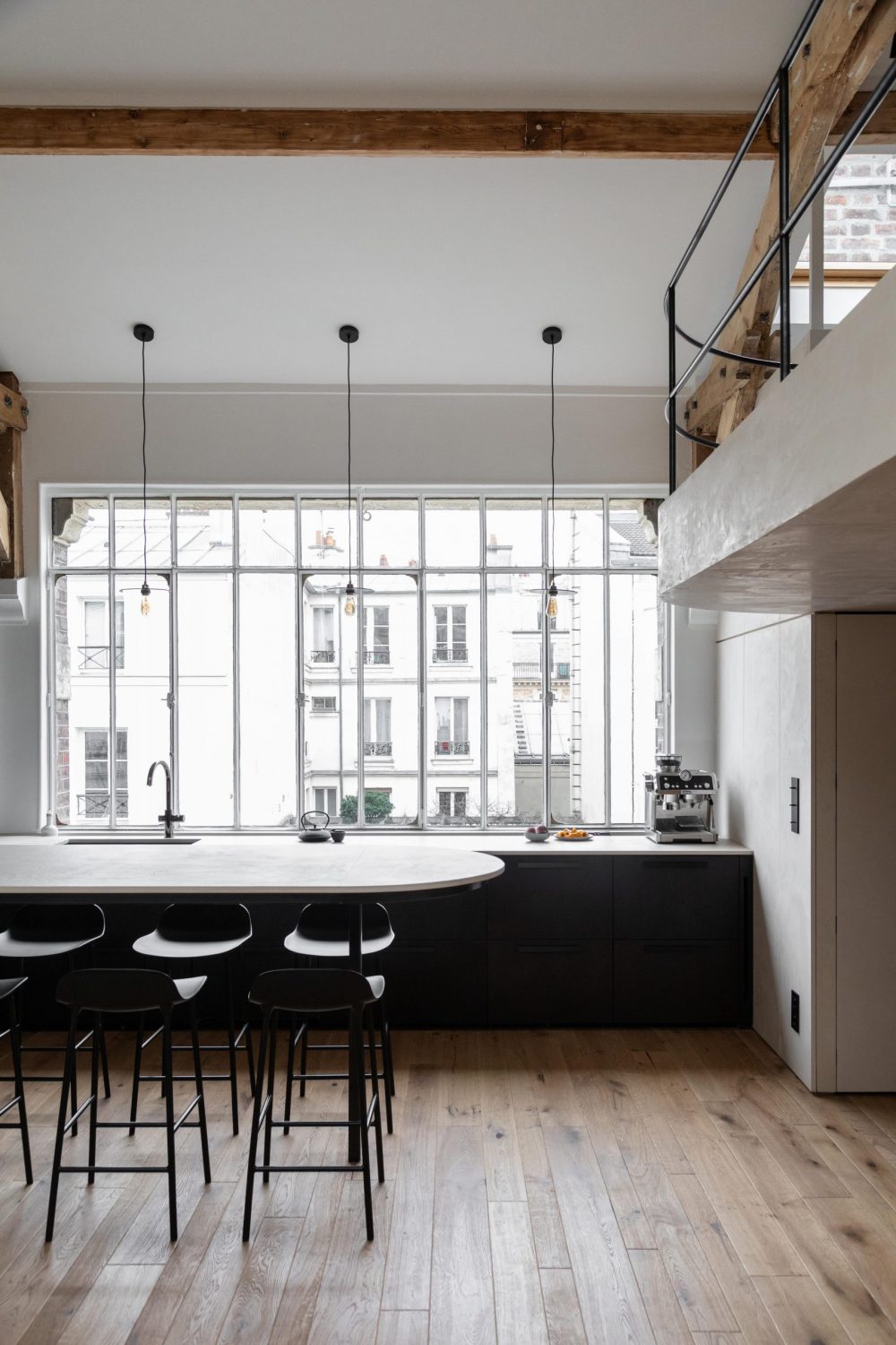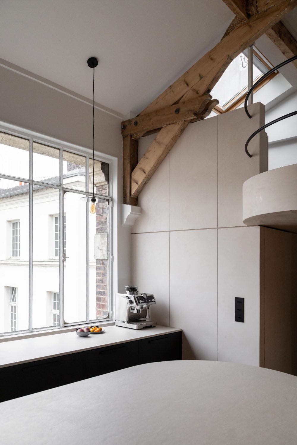 Saussure is a minimal space located in Paris, France, designed by Atelier Leymarie Gourdon. The agency works in a variety of fields, including new construction and renovations for both individual homes and small collectives, as well as public cultural facilities and hospitality venues. Structural choices and implementation are oriented towards simple and economical solutions, using durable and high quality materials. Passionate about detail, the agency develops architecture that explores the relationships between materials, textures, and finishing solutions, with the help of our artisan partners. Each architectural project is unique and finds meaning in the essentials. The gabled roof in this design was left exposed, creating extra vertical space for a lofted bedroom. Skylights bring in plenty of natural light from above, while a sculptural spiral metal staircase connects the ground floor to the loft.