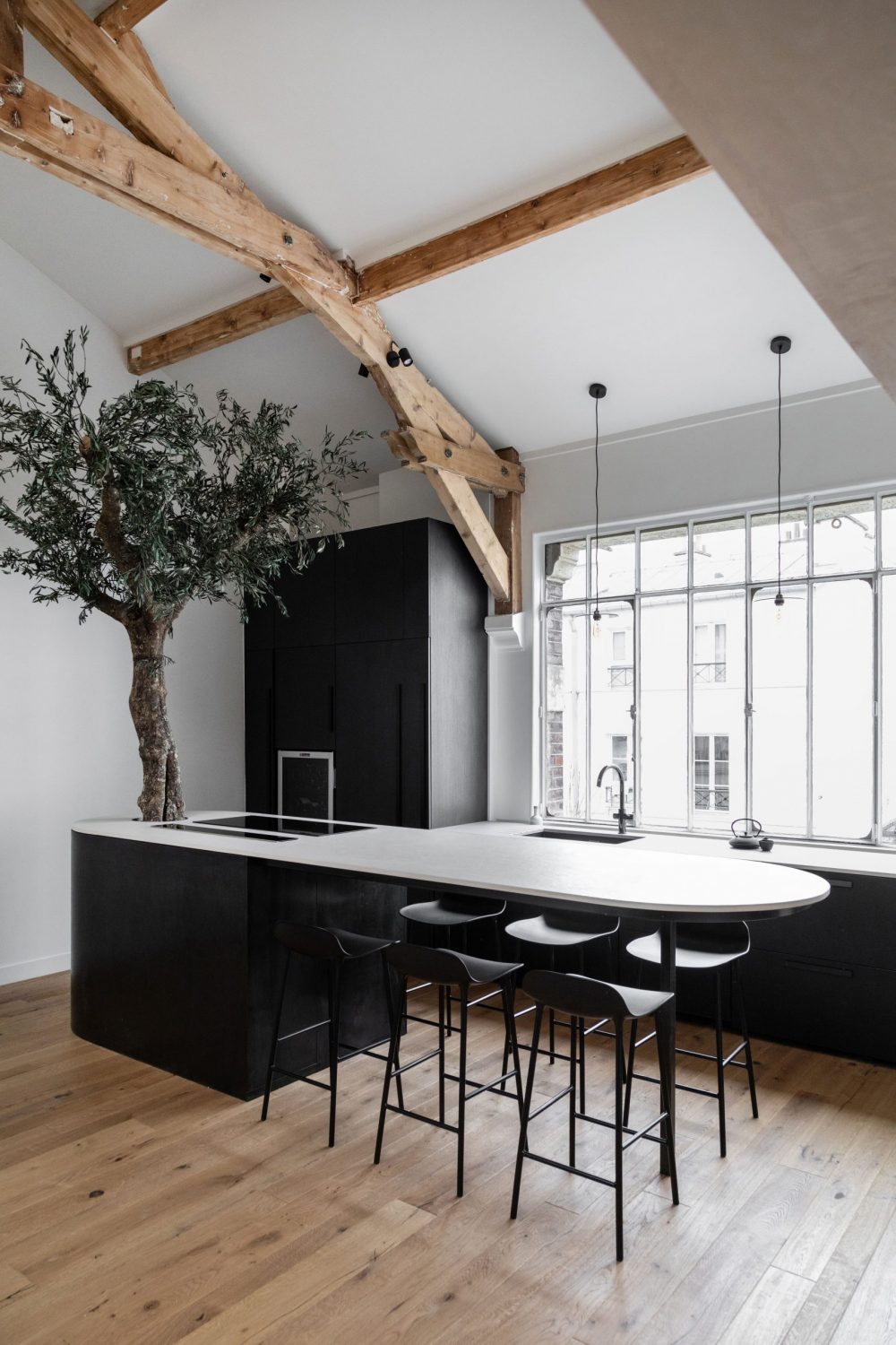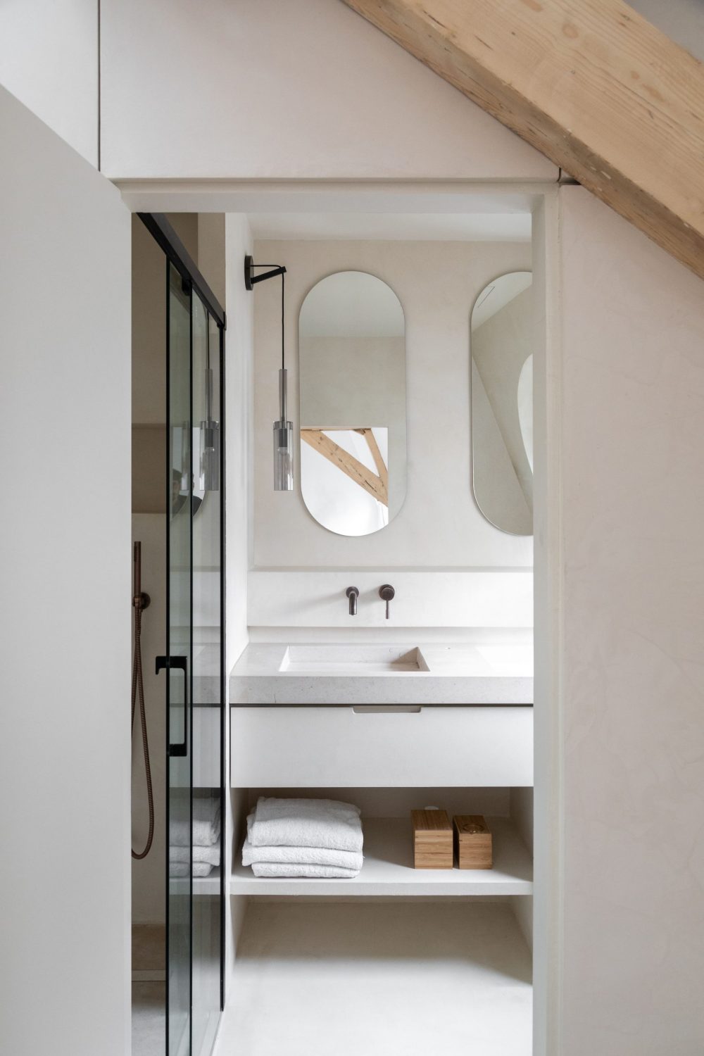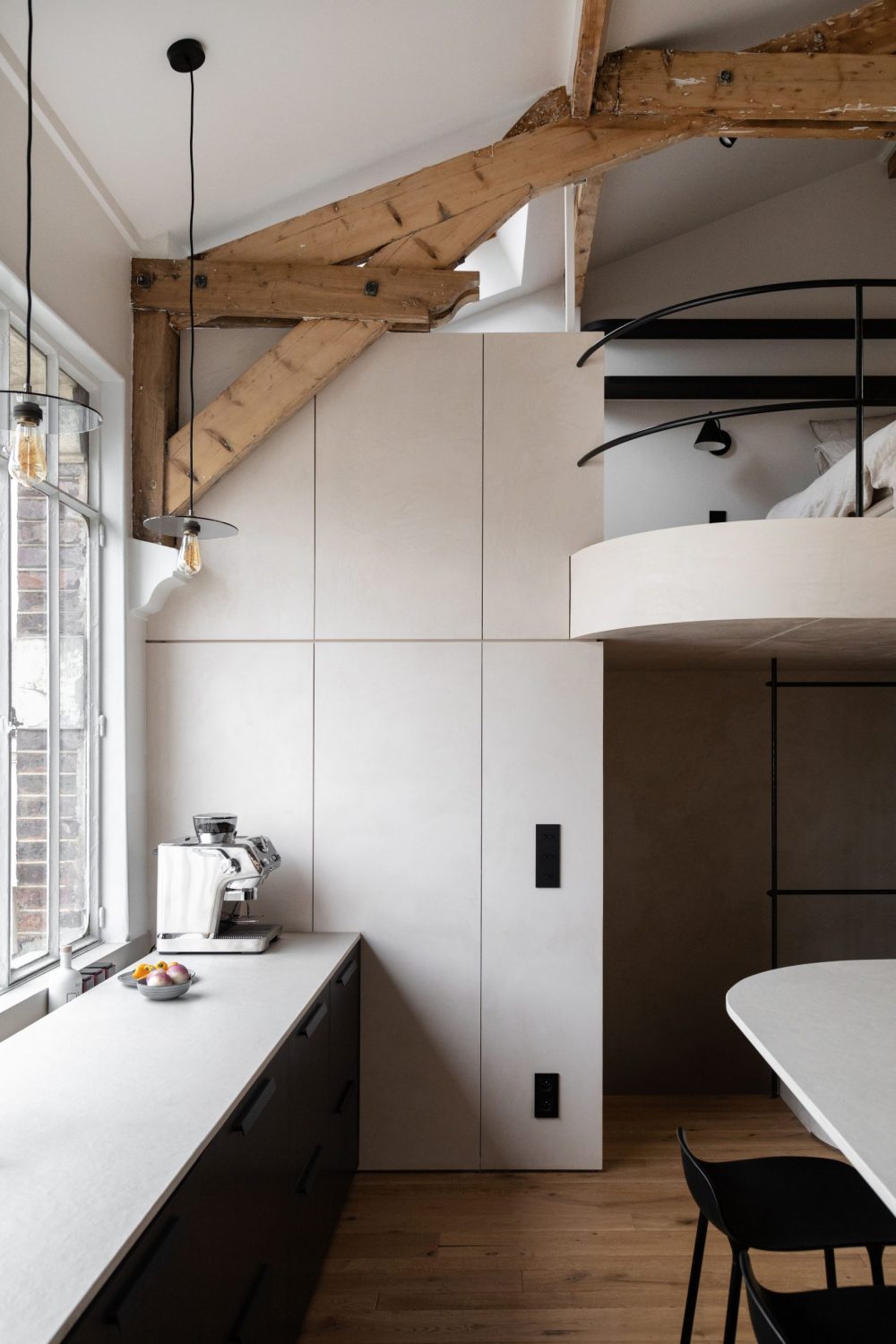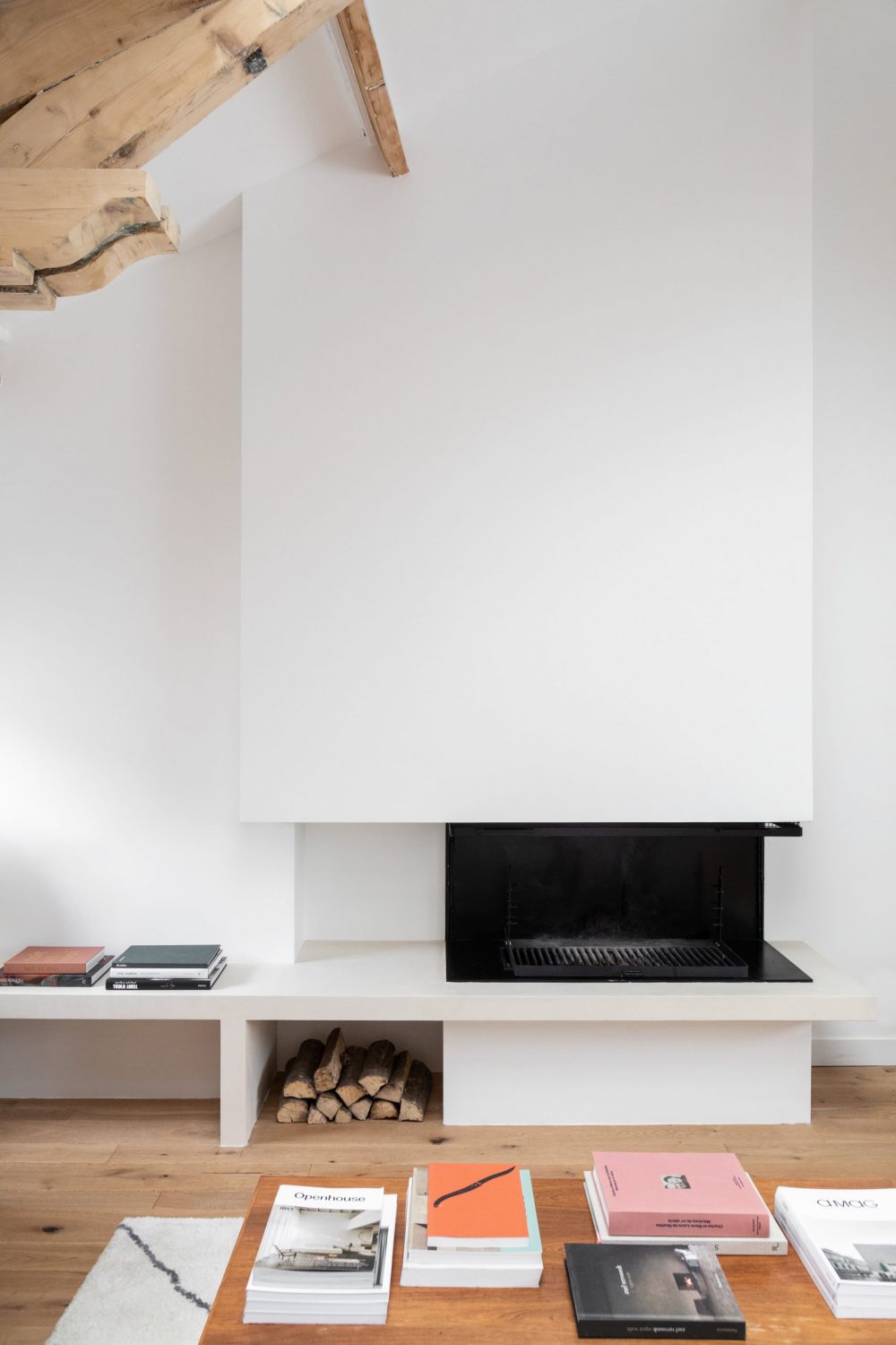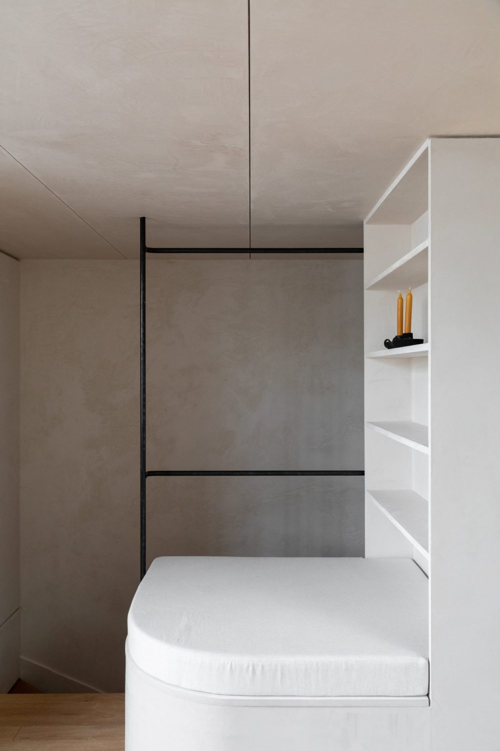 Saussure is a minimal space located in Paris, France, designed by Atelier Leymarie Gourdon. The agency works in a variety of fields, including new construction and renovations for both individual homes and small collectives, as well as public cultural facilities and hospitality venues. Structural choices and implementation are oriented towards simple and economical solutions, using durable and high quality materials. Passionate about detail, the agency develops architecture that explores the relationships between materials, textures, and finishing solutions, with the help of our artisan partners. Each architectural project is unique and finds meaning in the essentials. The gabled roof in this design was left exposed, creating extra vertical space for a lofted bedroom. Skylights bring in plenty of natural light from above, while a sculptural spiral metal staircase connects the ground floor to the loft.