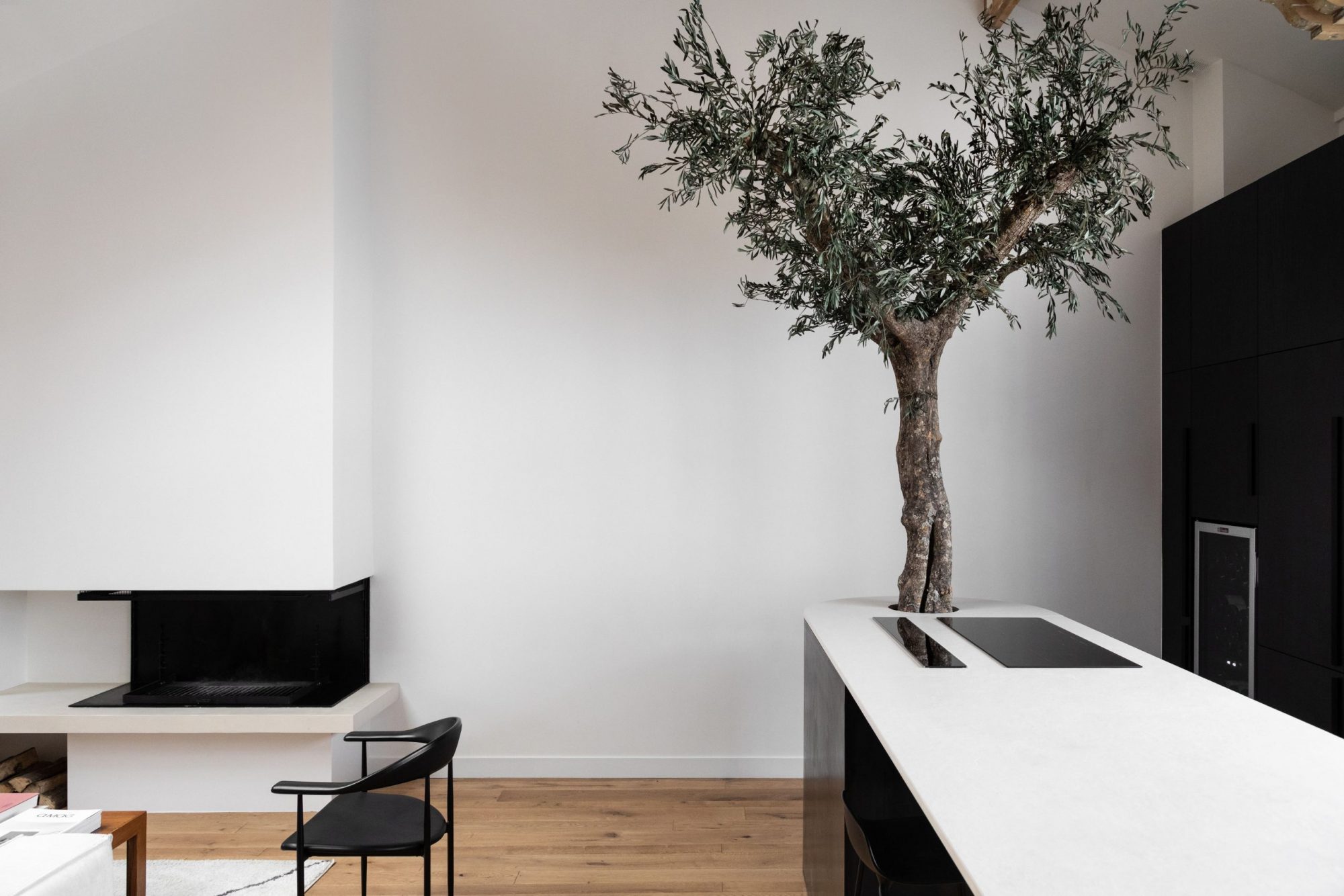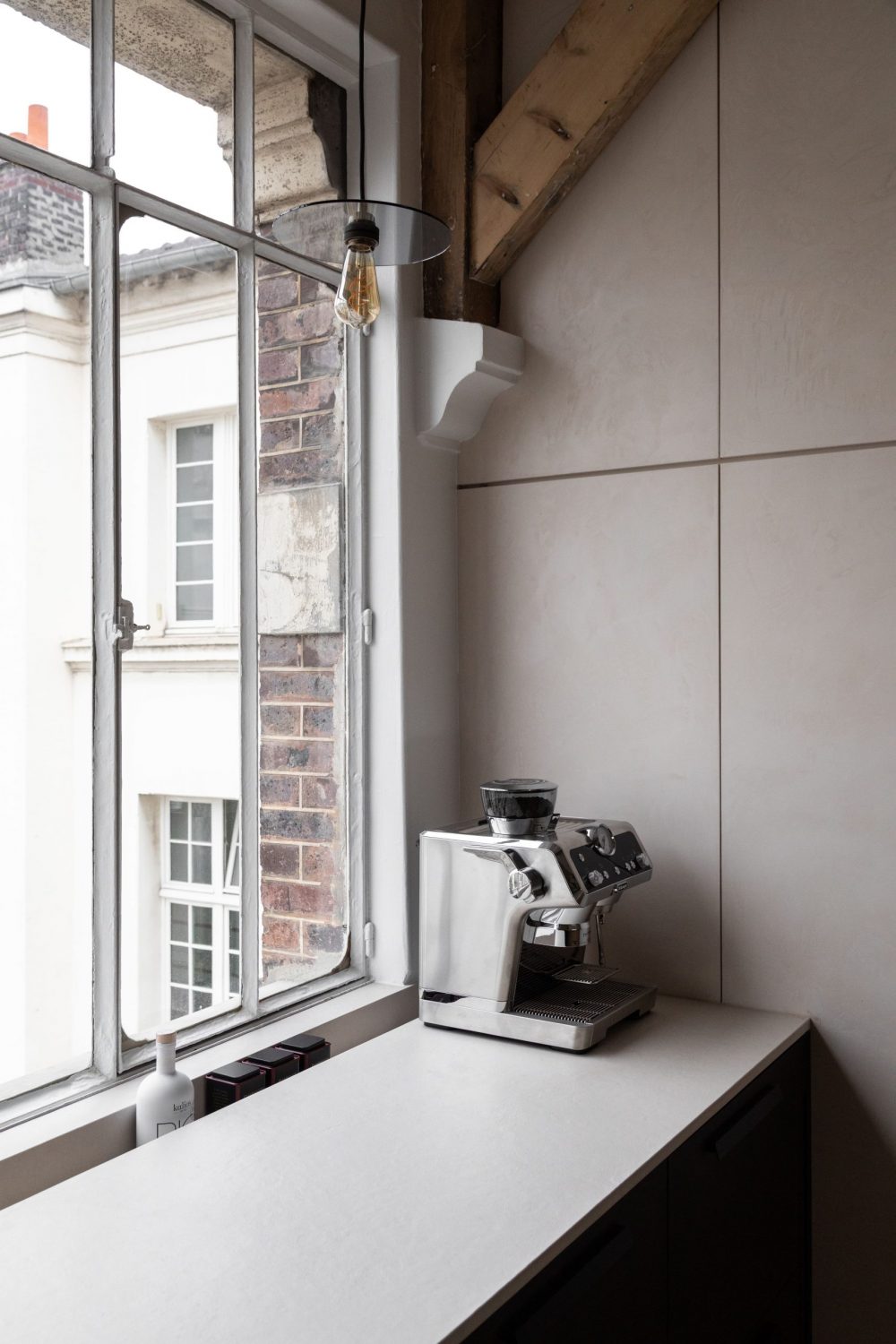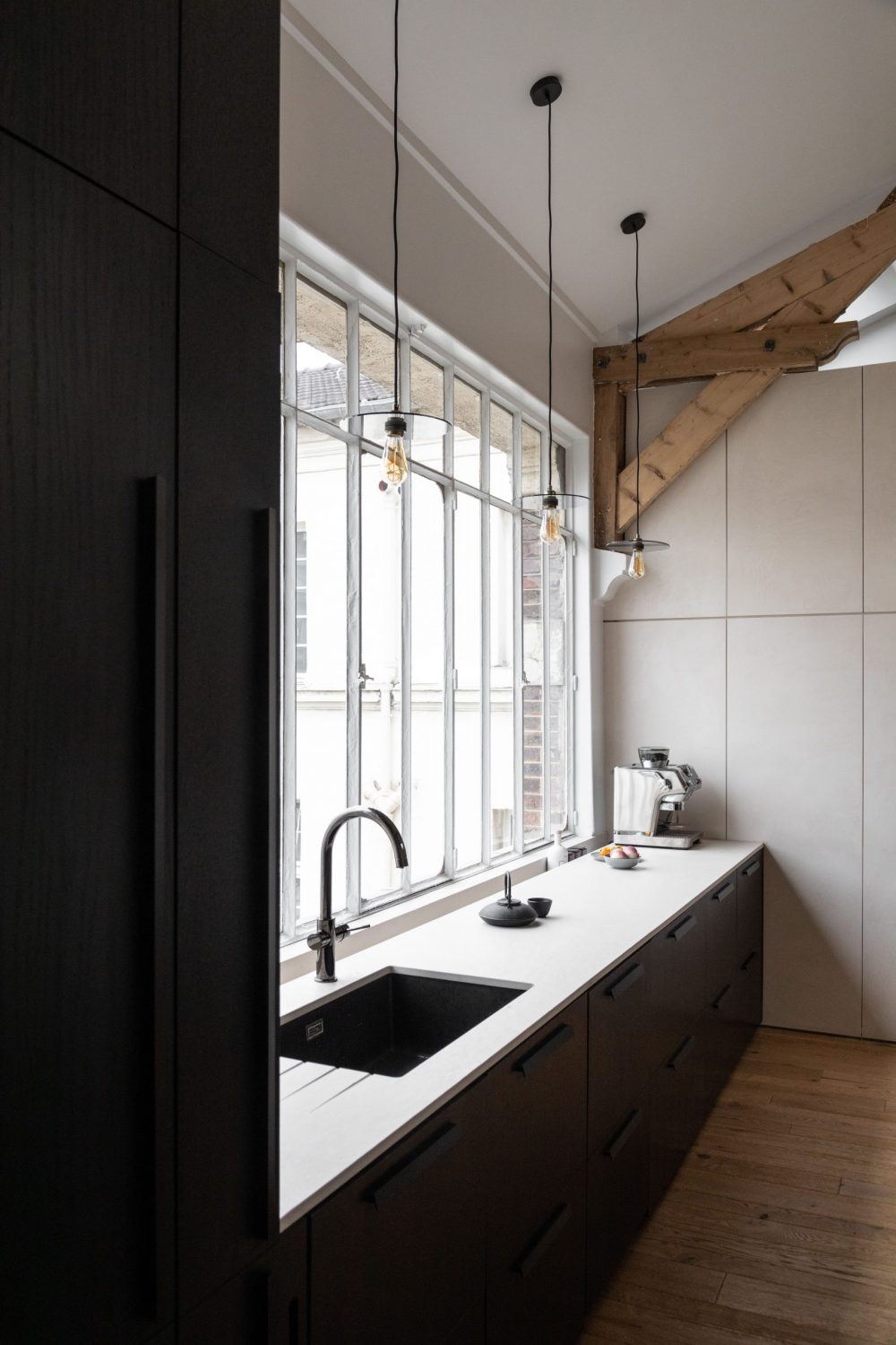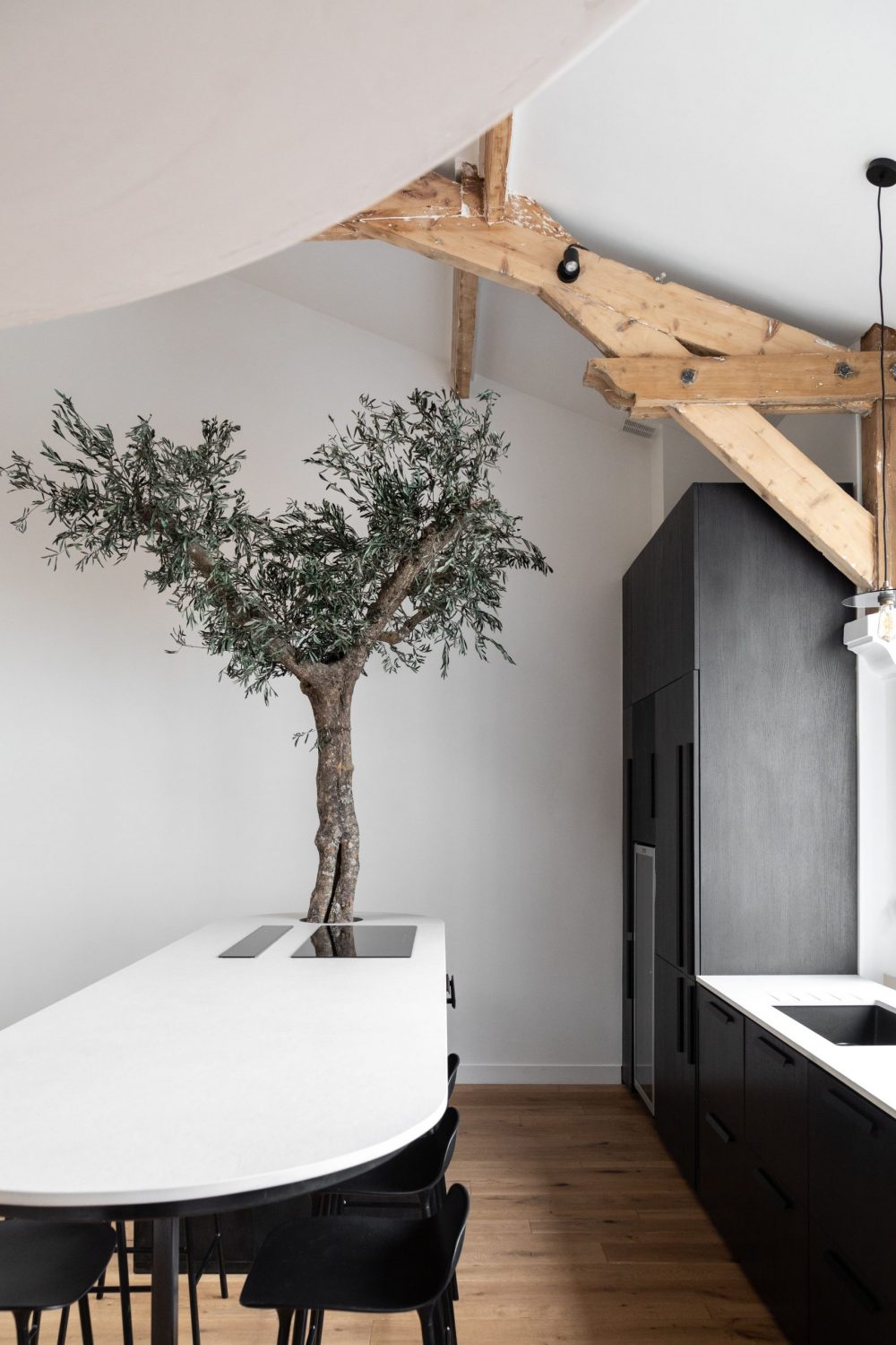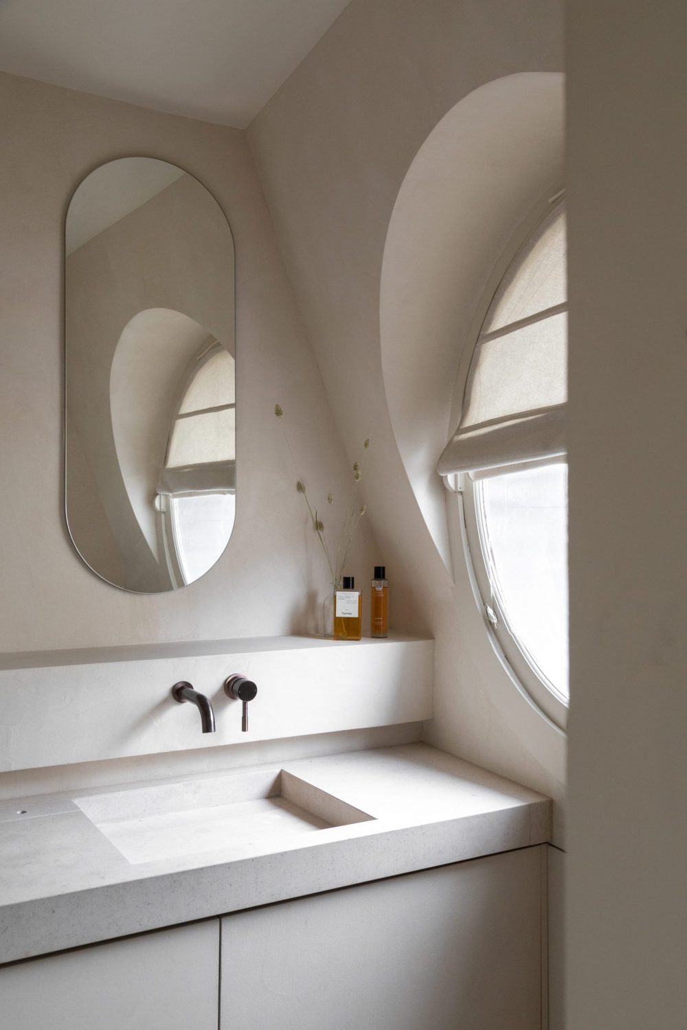 Saussure is a minimal space located in Paris, France, designed by Atelier Leymarie Gourdon. The agency works in a variety of fields, including new construction and renovations for both individual homes and small collectives, as well as public cultural facilities and hospitality venues. Structural choices and implementation are oriented towards simple and economical solutions, using durable and high quality materials. Passionate about detail, the agency develops architecture that explores the relationships between materials, textures, and finishing solutions, with the help of our artisan partners. Each architectural project is unique and finds meaning in the essentials. The gabled roof in this design was left exposed, creating extra vertical space for a lofted bedroom. Skylights bring in plenty of natural light from above, while a sculptural spiral metal staircase connects the ground floor to the loft.