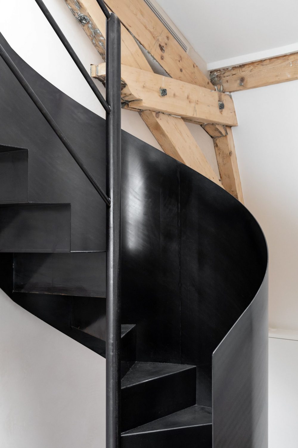 이번 프로젝트의 방향은 공간의 고유한 성격을 부여하는데 있다. 박공구조물이 그대로 노출된 상태로 남겨진 로프트 공간 안에 새로운 수직공간을 증축한다. 여기에 채광창을 추가로 설치, 내부 조도를 확보한다. 금속으로 만들어진 나선형 계단으로 위아래를 연결한다.
