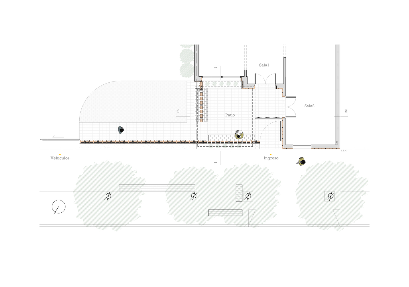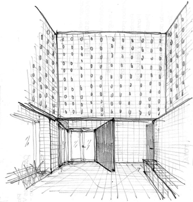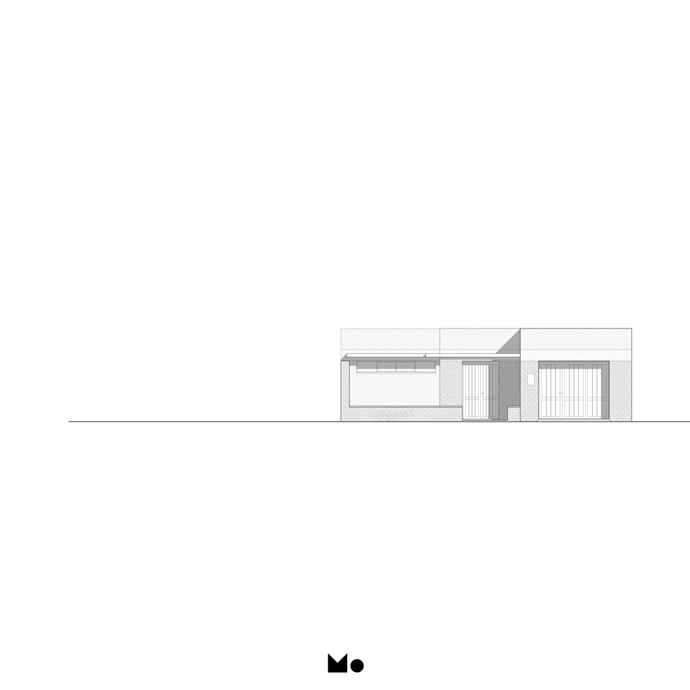 It is a very small intervention at the entry of Casa Velatoria, with the objective to generate a COURTYARD, which in addition to being a space of TRANSITION, forms a PLACE of accompaniment and reflection, in contact with the SKY. A space that provides a certain degree of intimacy to the street and with the intention that each visitor directs their gaze upwards almost inevitably, as when one enters the church. In this case not to see frescos and domes, but to notice the absence, the VOID.