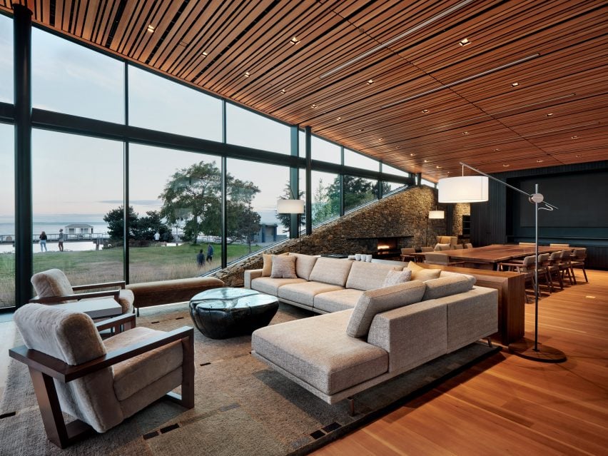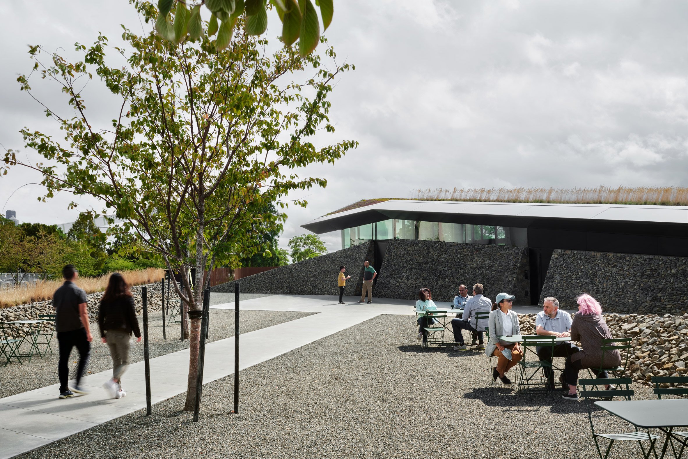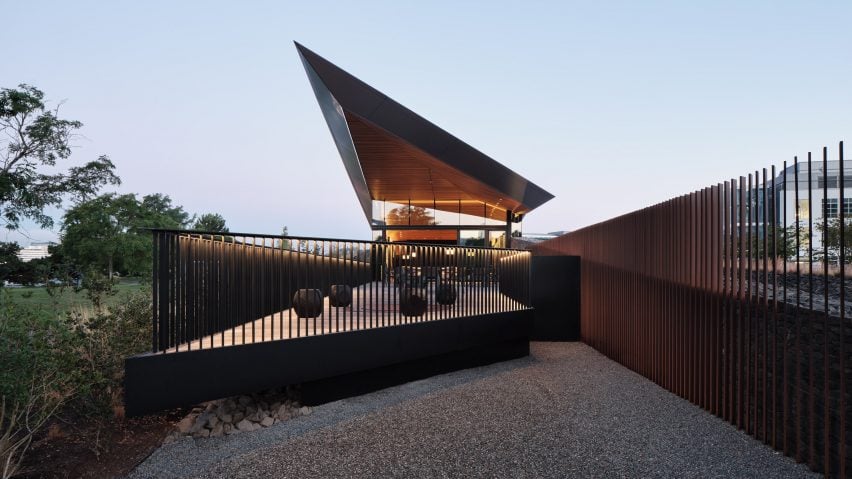 US studio Aidlin Darling Design has created a meeting facility for online travel company Expedia Group that features a wing-shaped green roof and walls made of stone and glass.