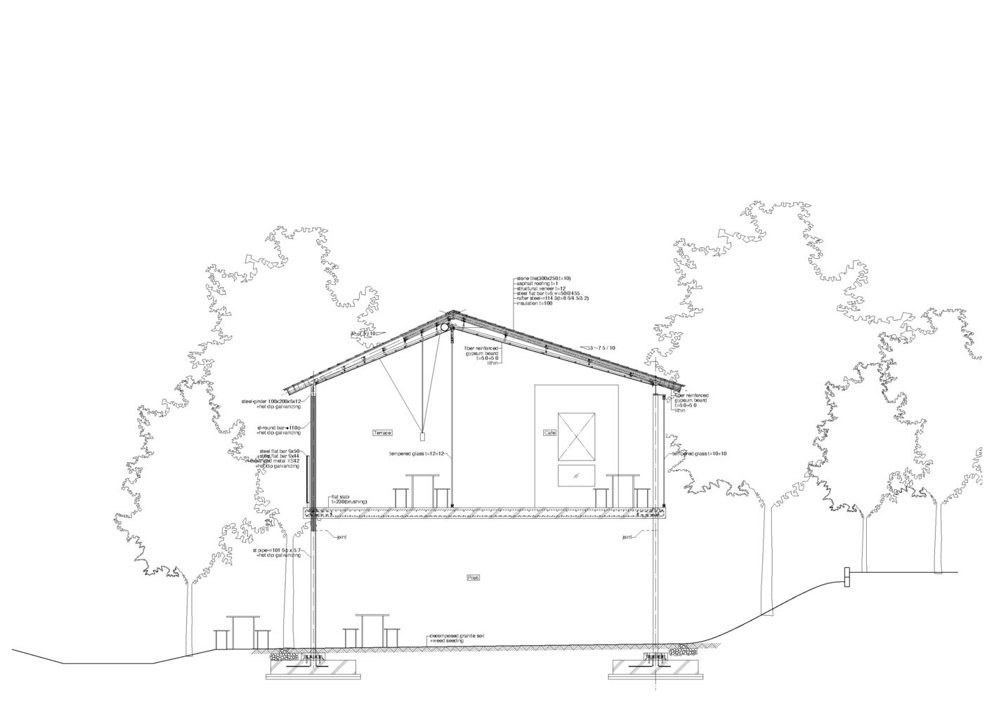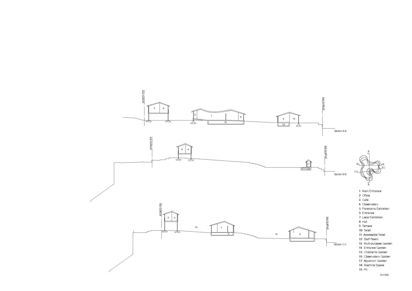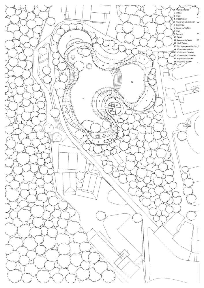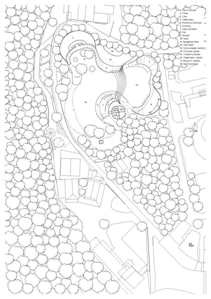In such an area, we planned this long building as a part of the park following the shapes and various levels of the site so that it flows in and out of the many different spaces that the site has in order to actualize its potential. As such, the three dimensional path building touches the ground and then jumps up according to the character of the space and its function. There will be seven small open spaces on the ground determining the shape of the building to make one big park. People don’t enter a building but a large open space walking through under the elevated part of the building. As people walk around the building, people will experience places like the viewing point, floating cafe in the trees, event space, and exhibition spaces.