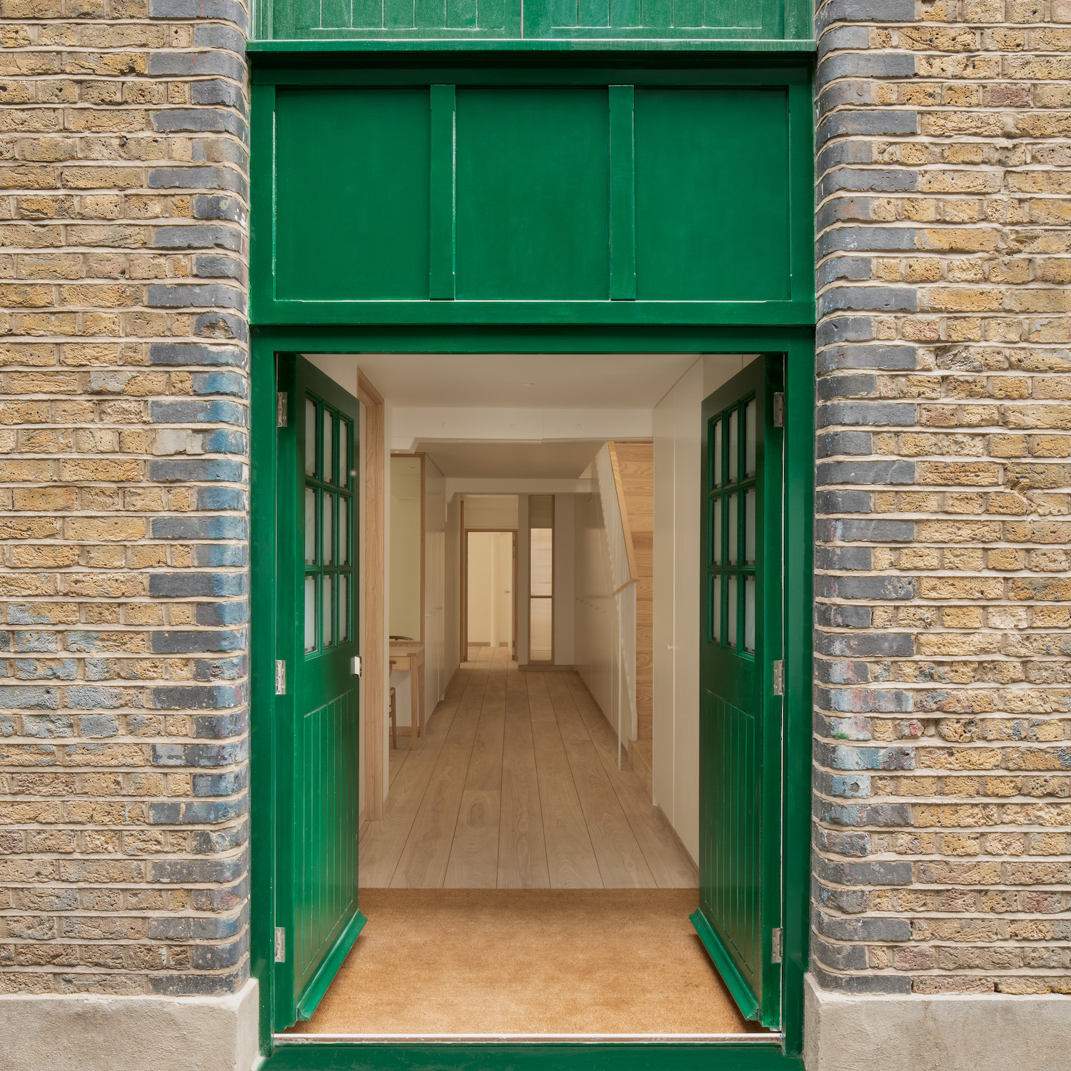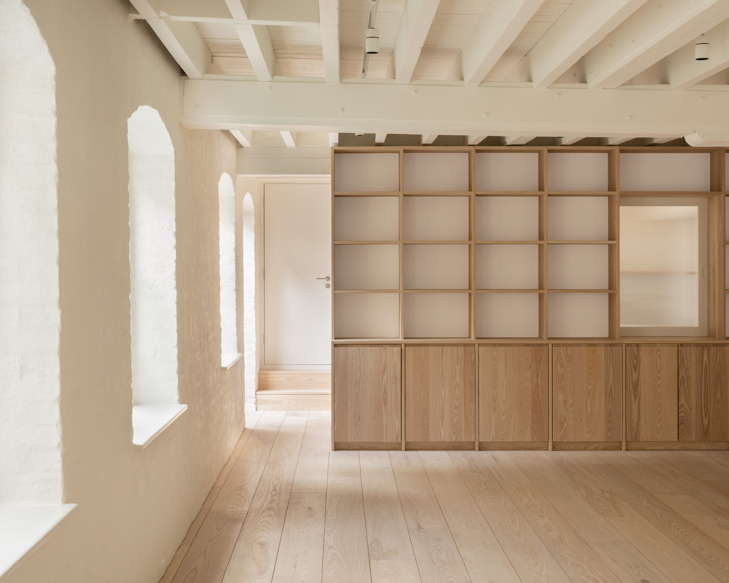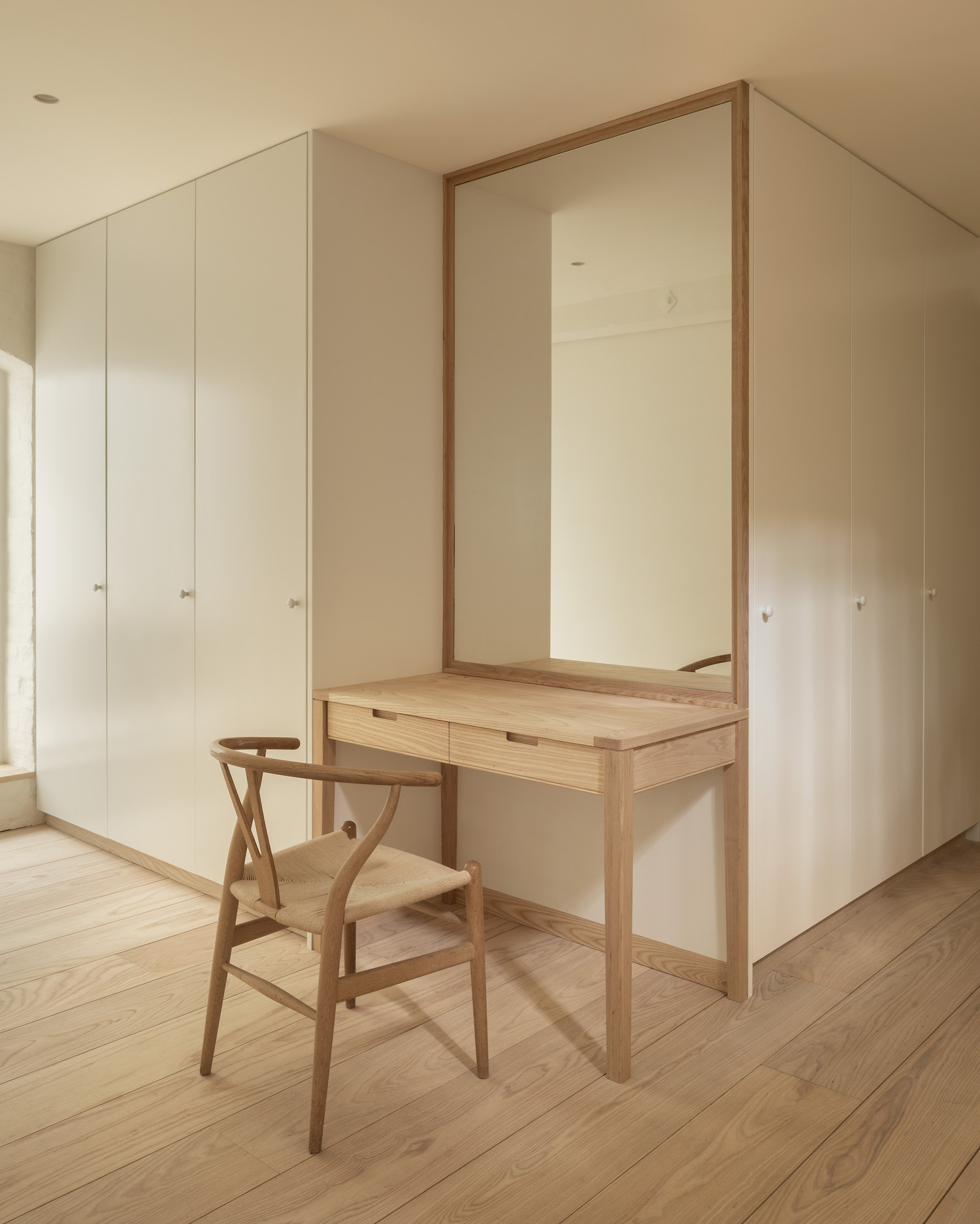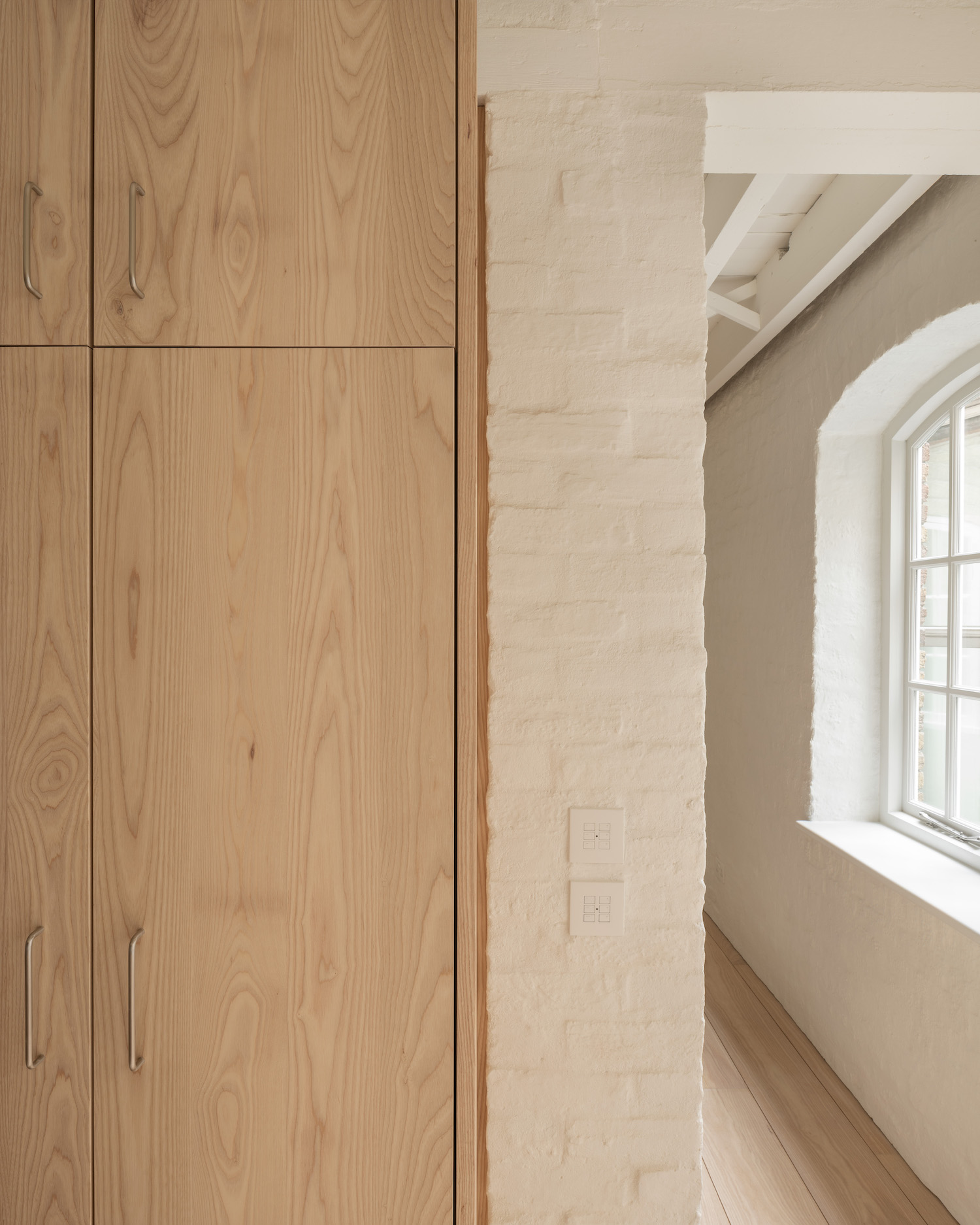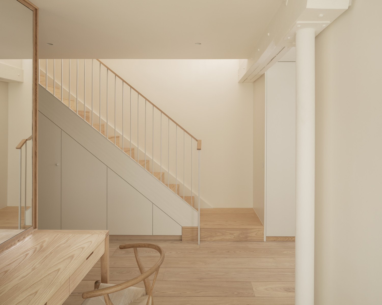 Coach House is a minimal residence located in London, United Kingdom, designed by Giles Reid Architects. The brief for the project was to convert two floors of an 18th century coach house in Bermondsey. The major constraint faced by the designer was a lack of direct sunlight due to the building being surrounded by new development. The designer came up with a solution by relocating the living room to the upper level where there was the best natural light. The kitchen was moved into a small back area to create the largest possible family space. All bedrooms were placed on the ground floor, facing a narrow courtyard that backs onto a neighbouring glass curtain wall, providing reflected light. To further enhance the light in the rooms, the internal brick walls were given a lime slurry and white paint finish, and exposed beams were upgraded with fire protection paint, also in white. Engineered English ash was used for flooring and solid ash for built-in joinery.