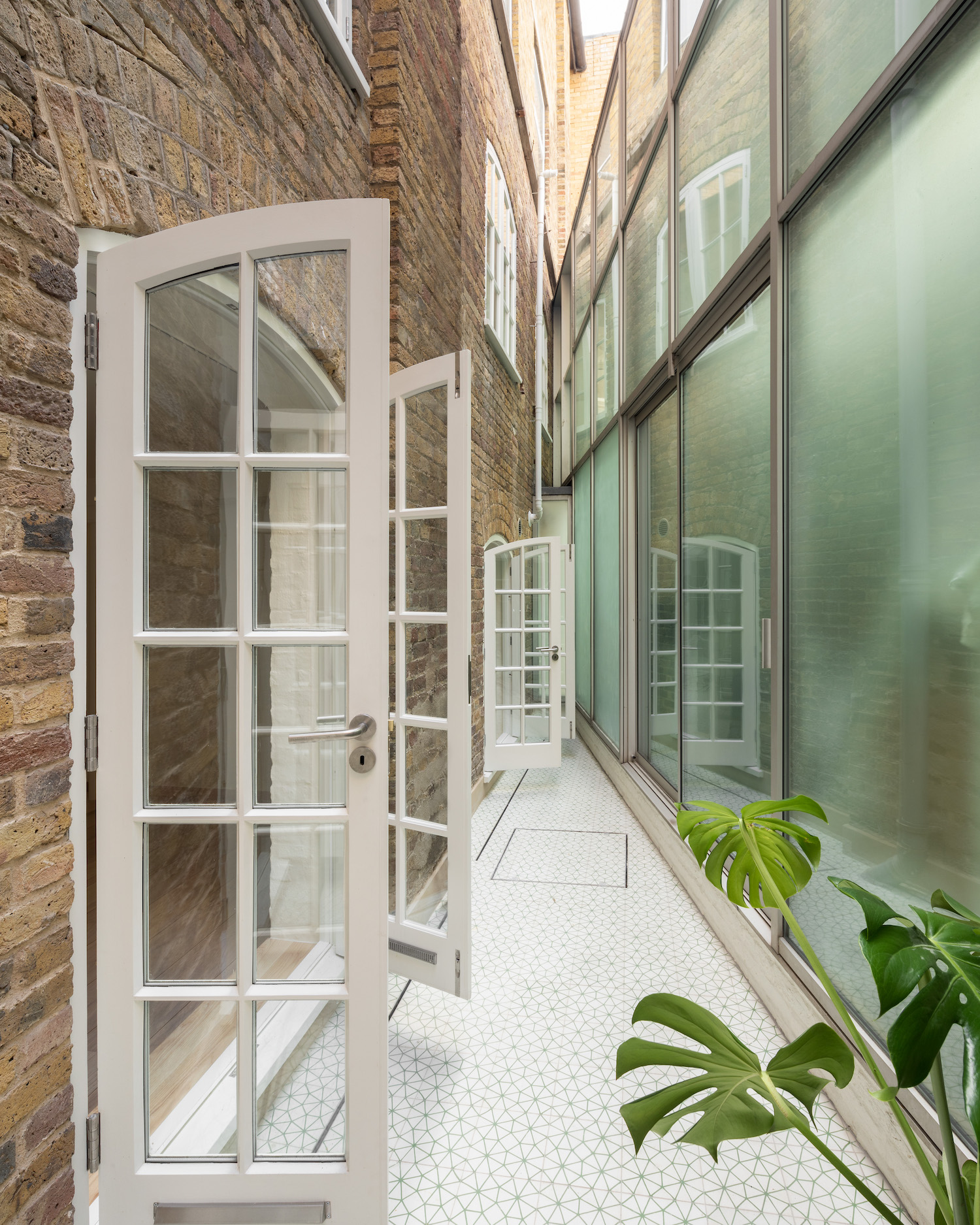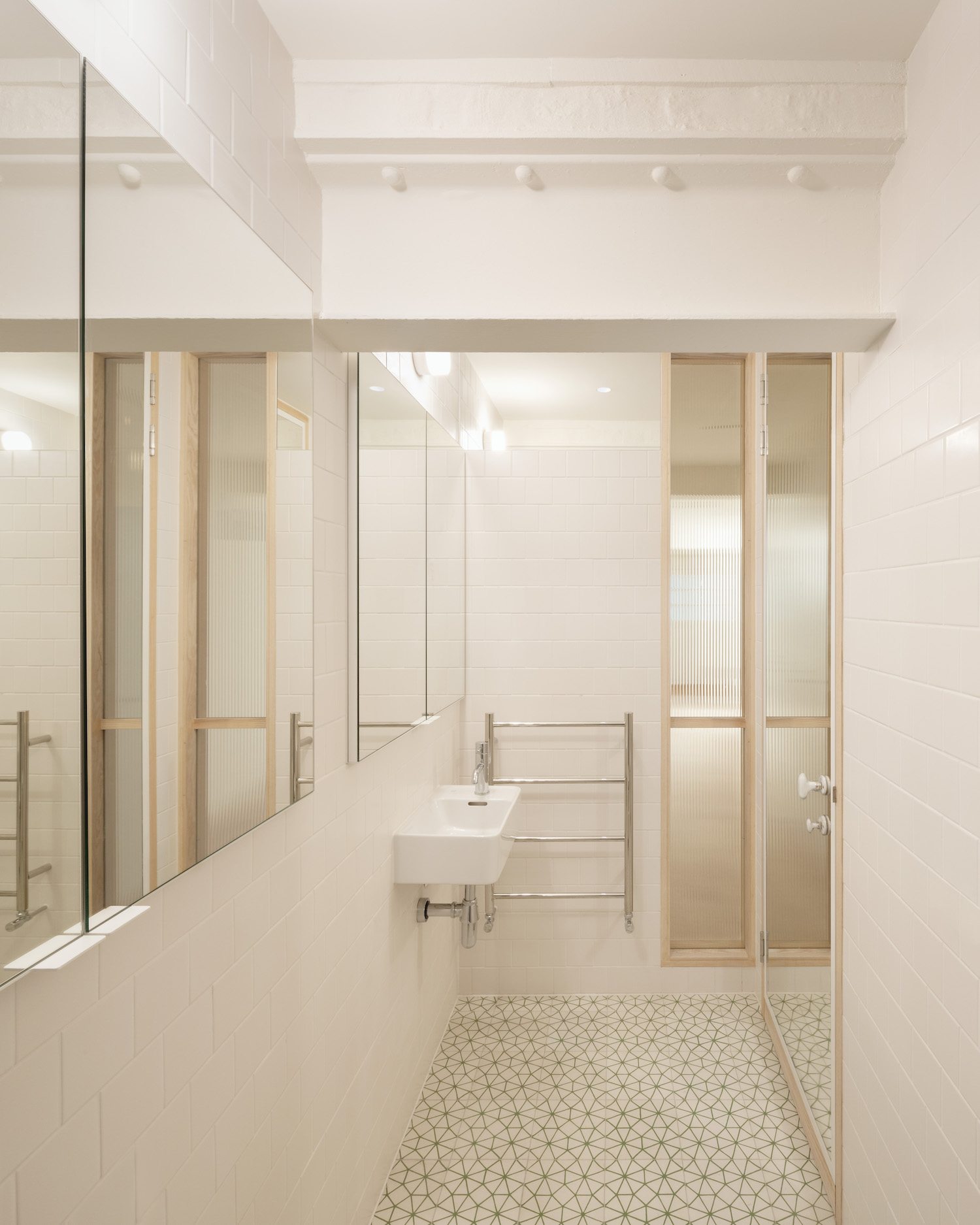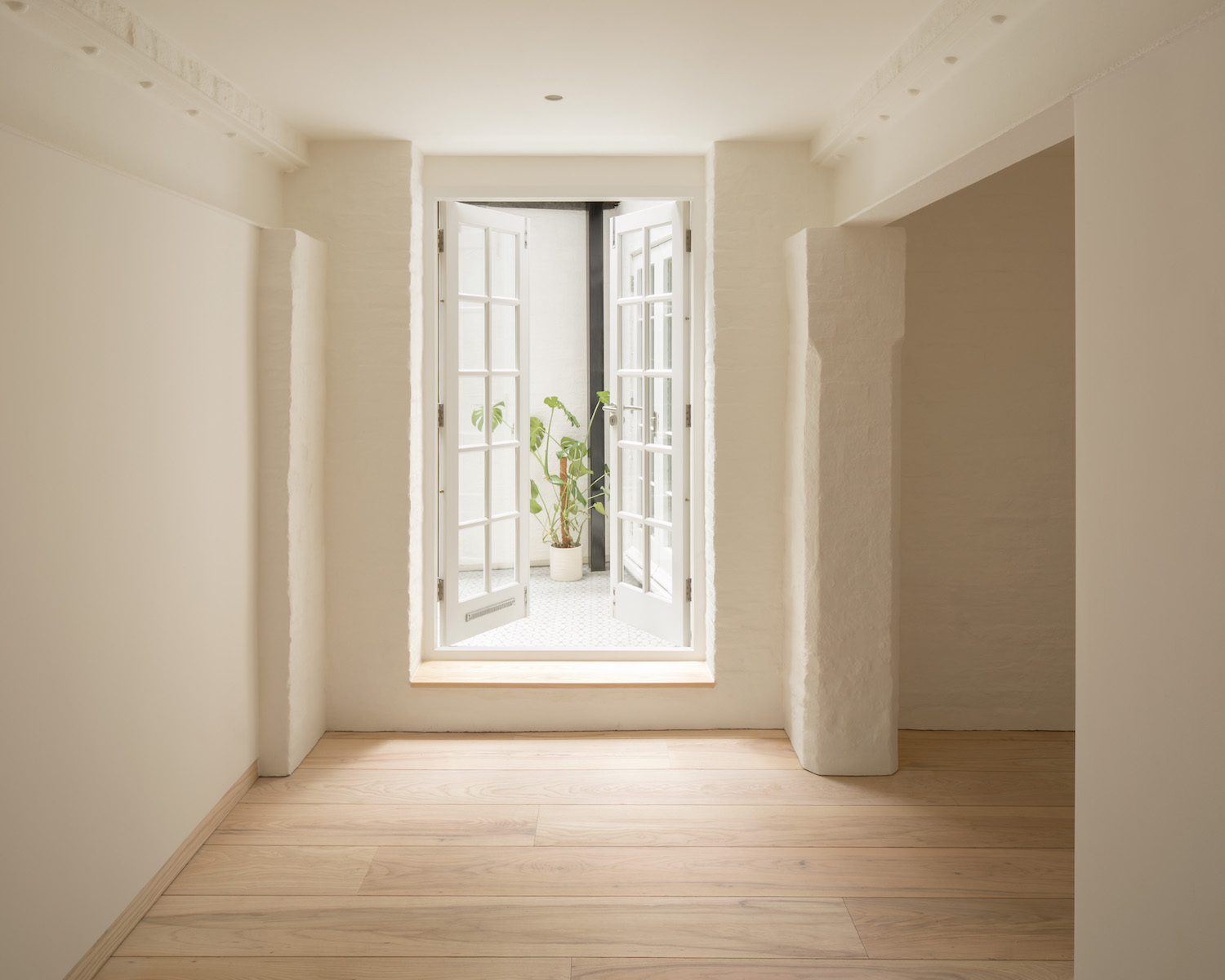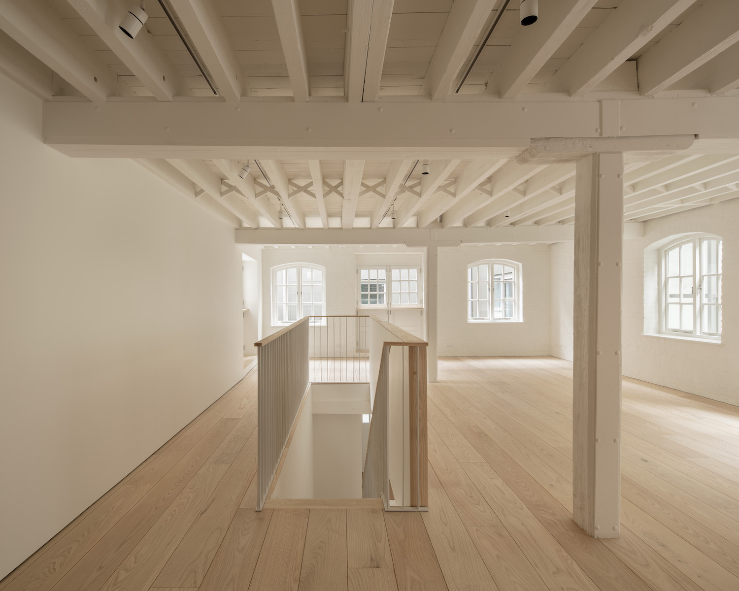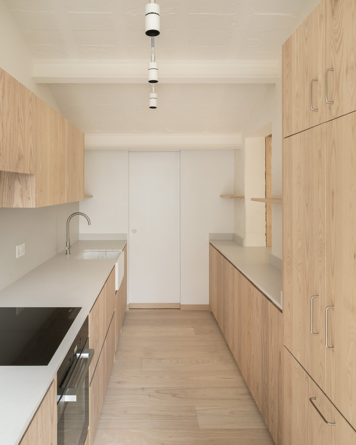 Coach House is a minimal residence located in London, United Kingdom, designed by Giles Reid Architects. The brief for the project was to convert two floors of an 18th century coach house in Bermondsey. The major constraint faced by the designer was a lack of direct sunlight due to the building being surrounded by new development. The designer came up with a solution by relocating the living room to the upper level where there was the best natural light. The kitchen was moved into a small back area to create the largest possible family space. All bedrooms were placed on the ground floor, facing a narrow courtyard that backs onto a neighbouring glass curtain wall, providing reflected light. To further enhance the light in the rooms, the internal brick walls were given a lime slurry and white paint finish, and exposed beams were upgraded with fire protection paint, also in white. Engineered English ash was used for flooring and solid ash for built-in joinery.