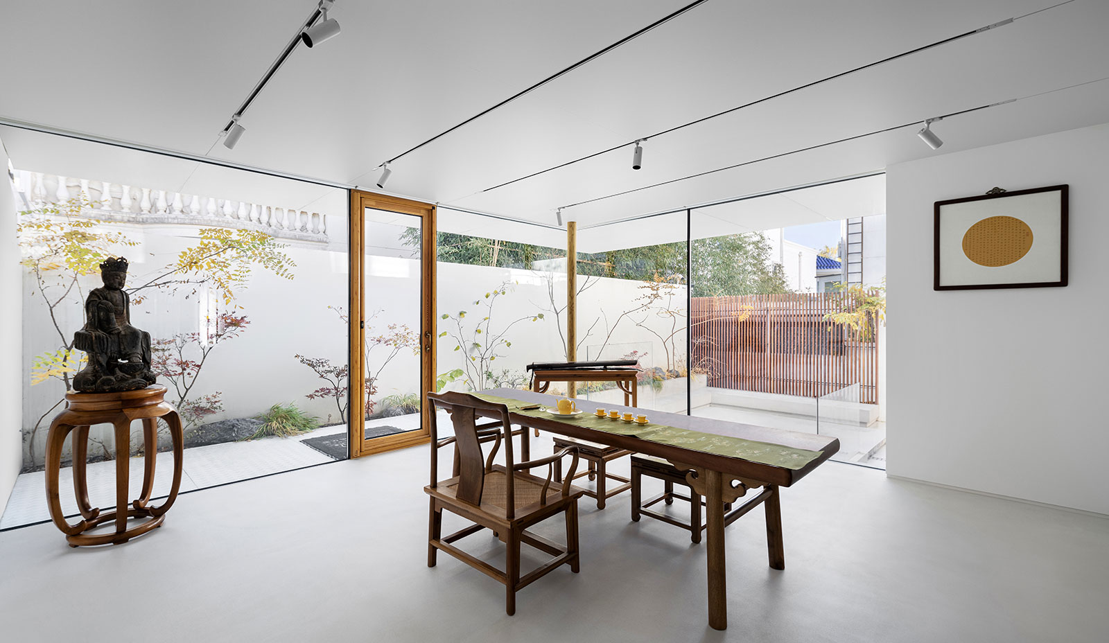 The house has a garden terrace, a basement, and two floors above ground with an attic. The key design part is the first floor, where the owner stays for the longest time in daily life. It includes the hallway, dining room, kitchen, tea room, outdoor courtyard, etc. The design theme is ‘Coexistence of Nanmu and Modern Life.’ The tone, light, and texture are the entry points to balance the relationship between nanmu furniture and the environment. The three colors of black, white, and gray are used in large quantities, corresponding to the scenes of ‘traditional,’ ‘modern,’ and ‘transition,’ respectively.