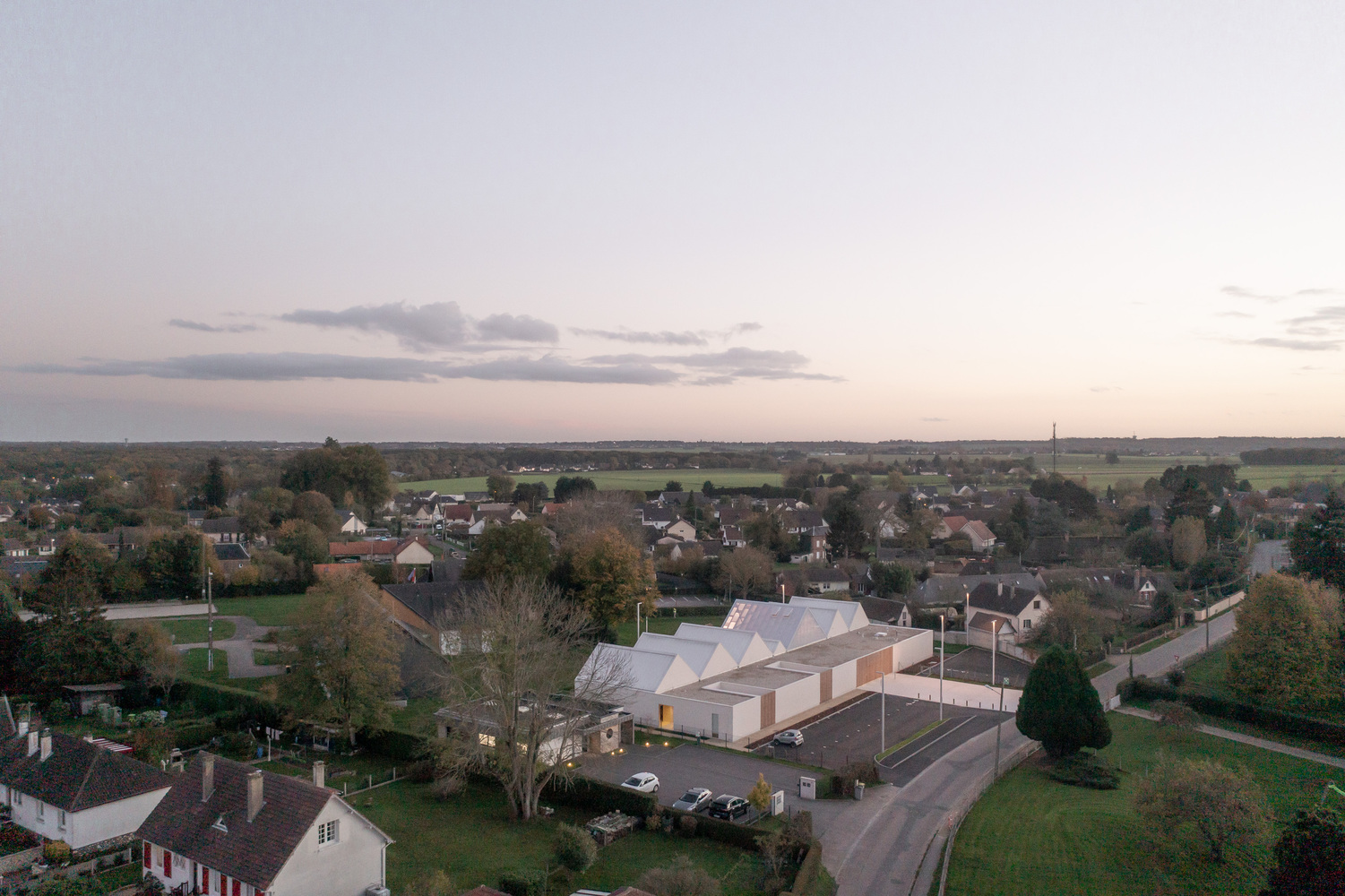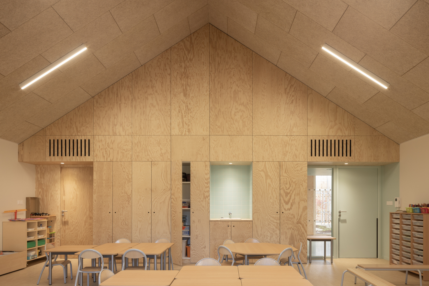 The new school takes place in the city center of Saint-Ouen-du Tilleul next to the town hall and the multipurpose hall. The equipment sets over the entire width of the plot, parallel to the street “Rue de l'Eglise”. This layout allows children's living spaces to be protected from external views, while opening generously onto the playground and the planted areas, offering users places for living and teaching in relation with nature.