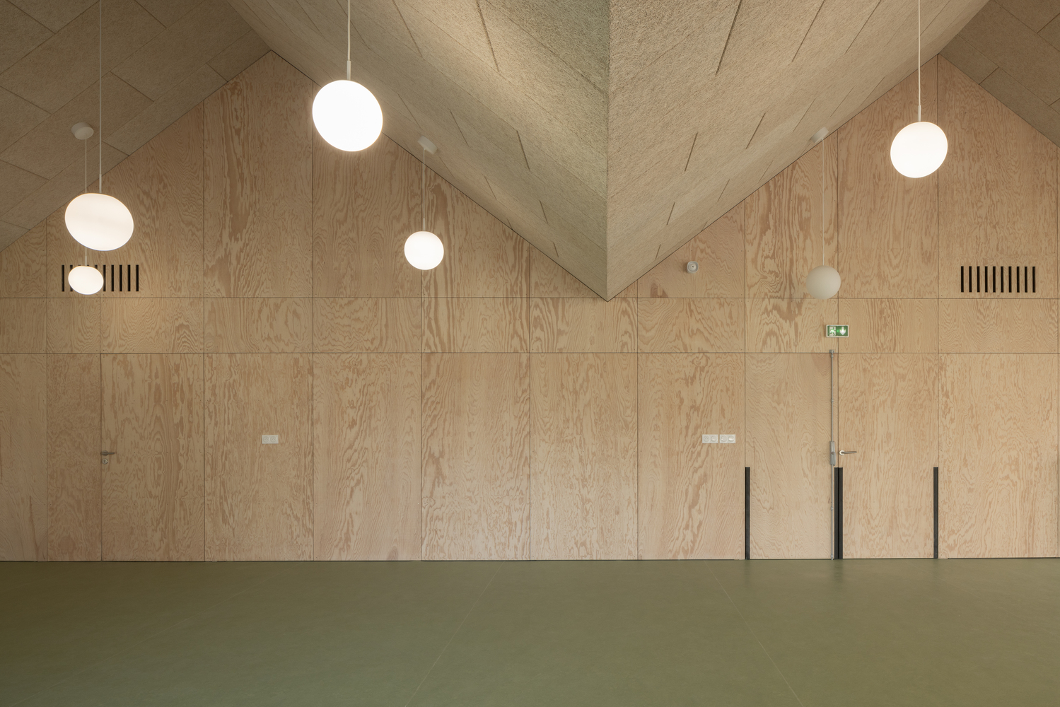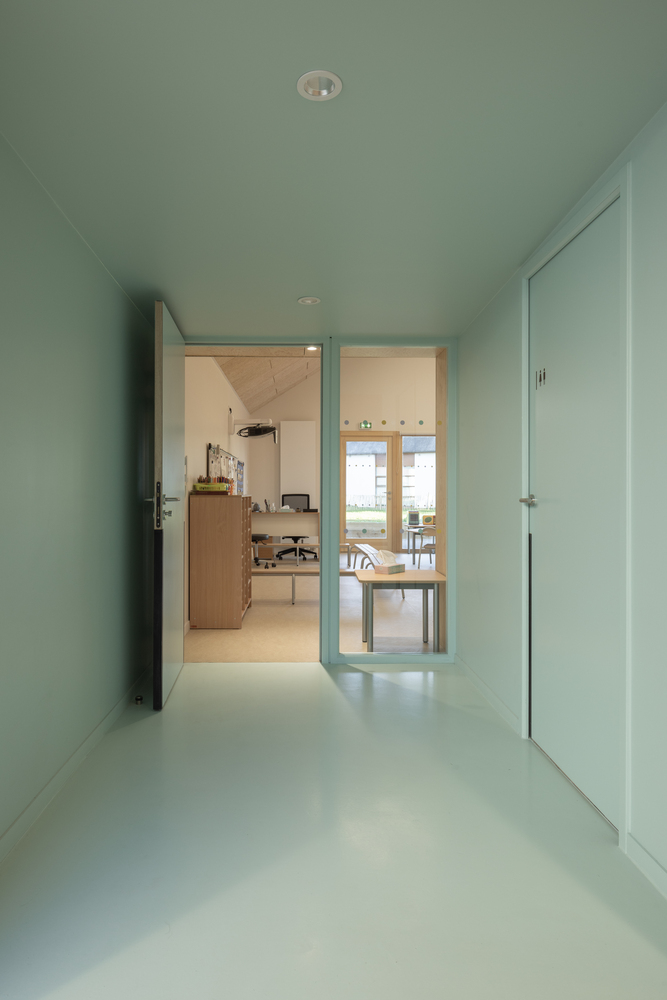 Double pitched roofs offer an analogy with the surrounding suburban houses. The project combines comfort, with integrated wooden furniture, architectural and functional quality with a light crossing corridor. The "winter garden" courtyard brings light and life to the heart of the project, in addition to a bioclimatic reflection. On the other hand, we can see the use of natural materials (wooden frame, wood wool insulation, fermacell natural lime plaster, coatings interiors in spruce wood panels, etc…) according to an eco-responsible approach.