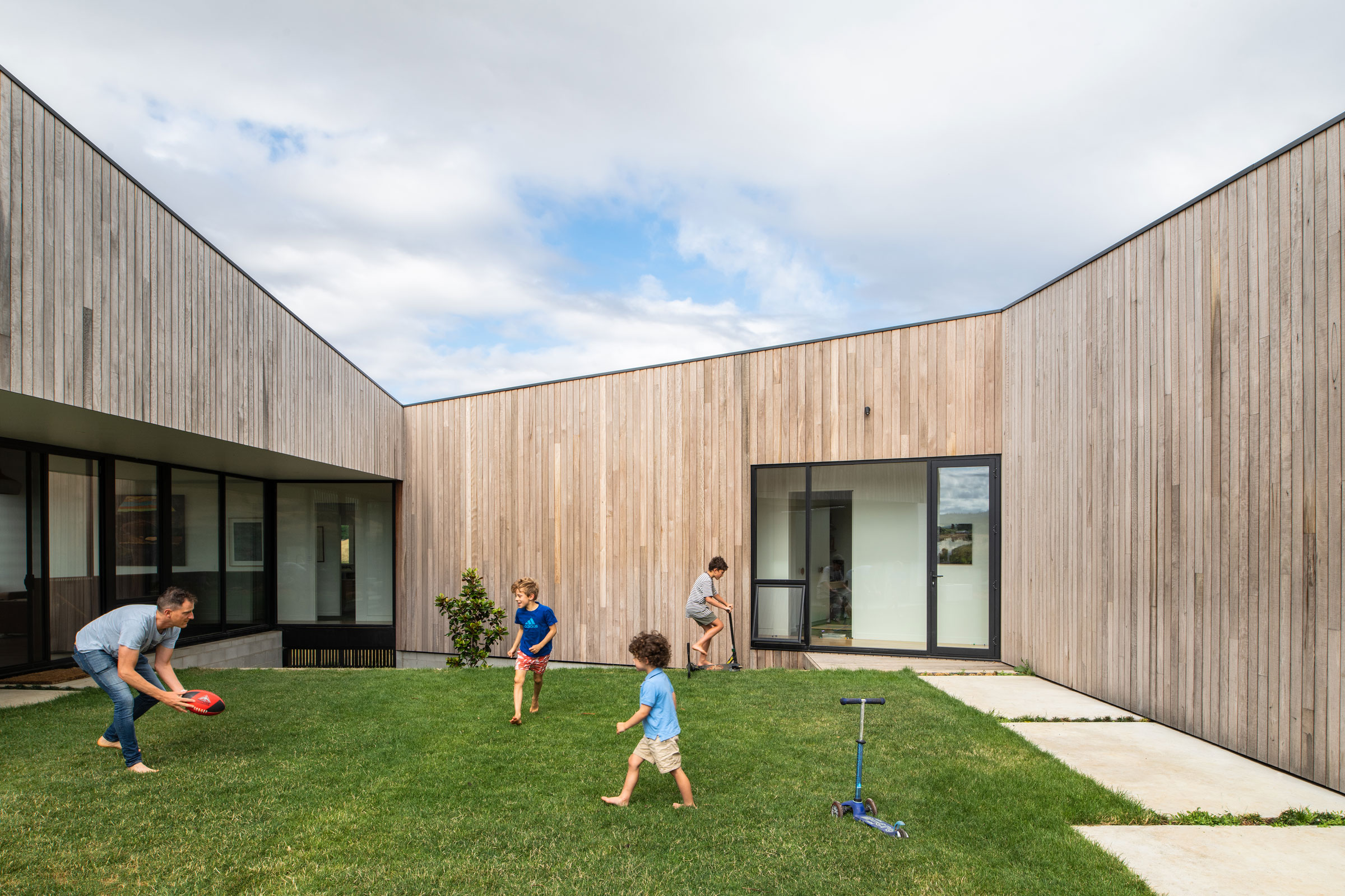 As the form sits elevated and vulnerable to impact from the natural elements, a considered approach sees the home wrap around a protected central courtyard. Ensuring a connection to place was key, Riverstone Residence balances a connection the surrounds with the need for protected living areas. Through the use of natural materiality – such as timber-lined boards with the intention to deliberately grey and showcase their ageing over time a visual reminder is experienced, anchoring the home to place whilst being a protective form.