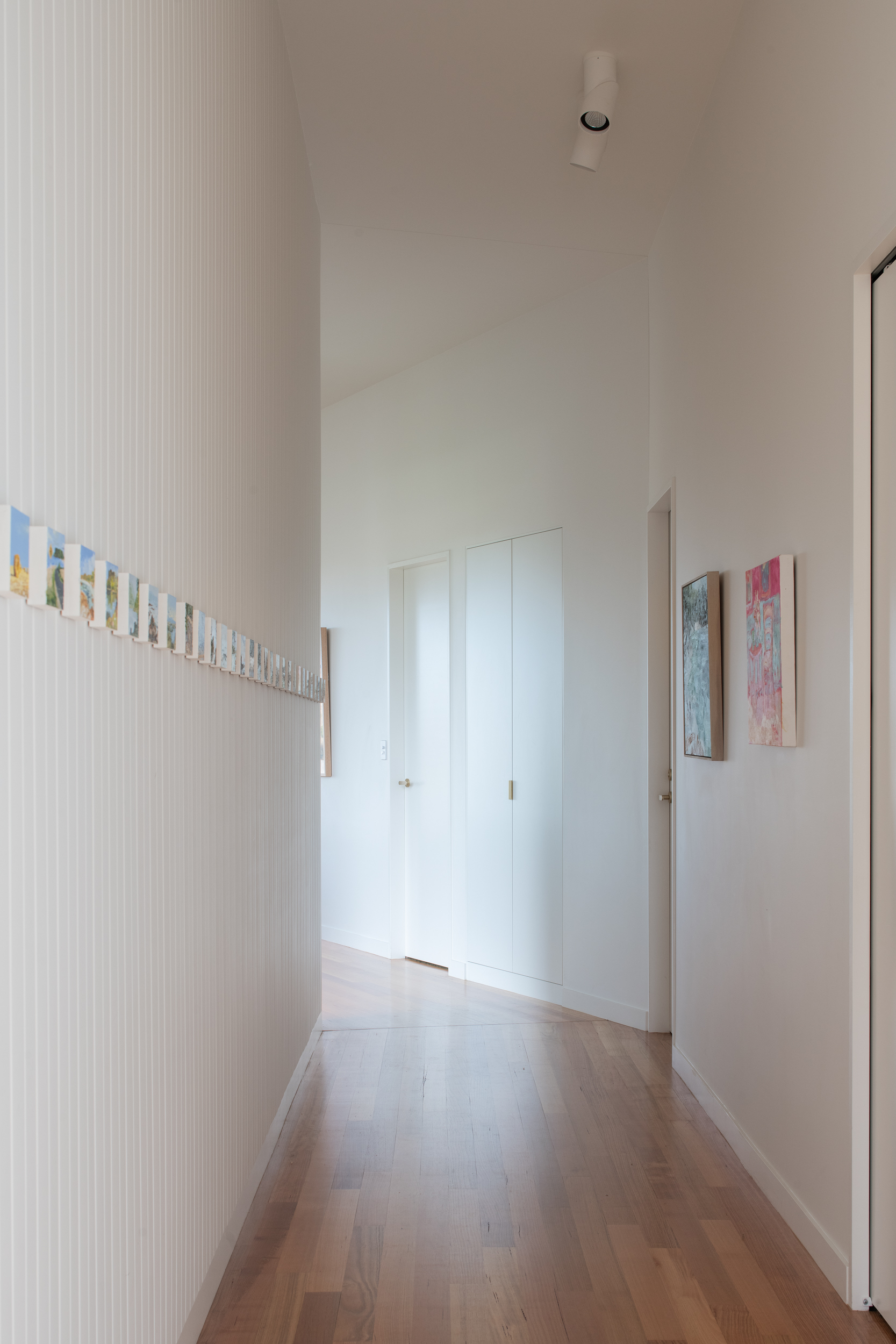 Located in Launceston, Riverstone Residence takes advantage of its expansive views. Aligned on one side to the steep hill below, select openings orient and frame views out to ensure a connection to the North Esk River in the distance. With no surrounding or nearby buildings to protect the home from the elements, the residence becomes a self protecting structure with its angled roof form and enclosed central courtyard. Cumulus Studio carefully positions the private rooms of the home within the more robust areas, whilst the living spaces open to the north to embrace the surrounds.