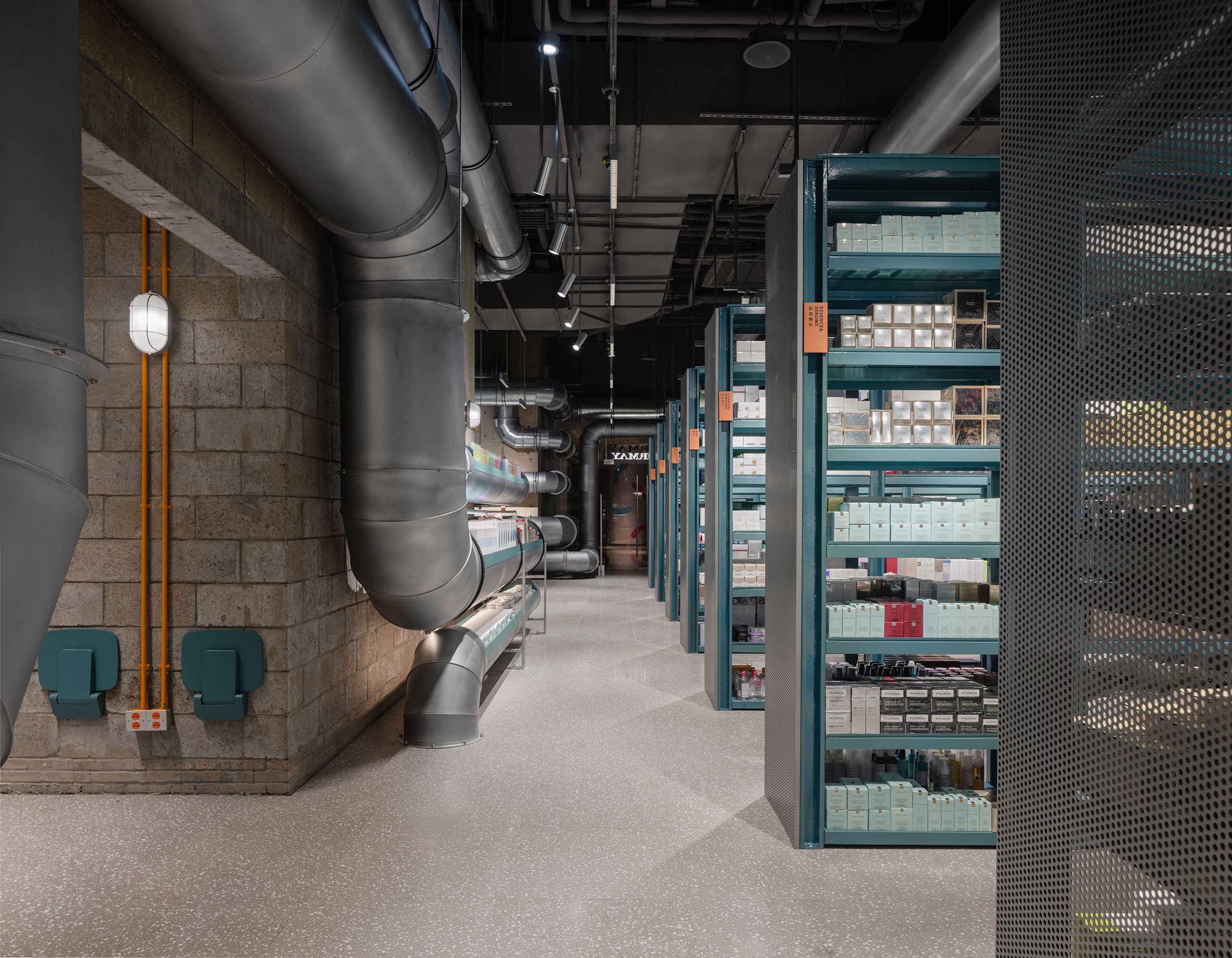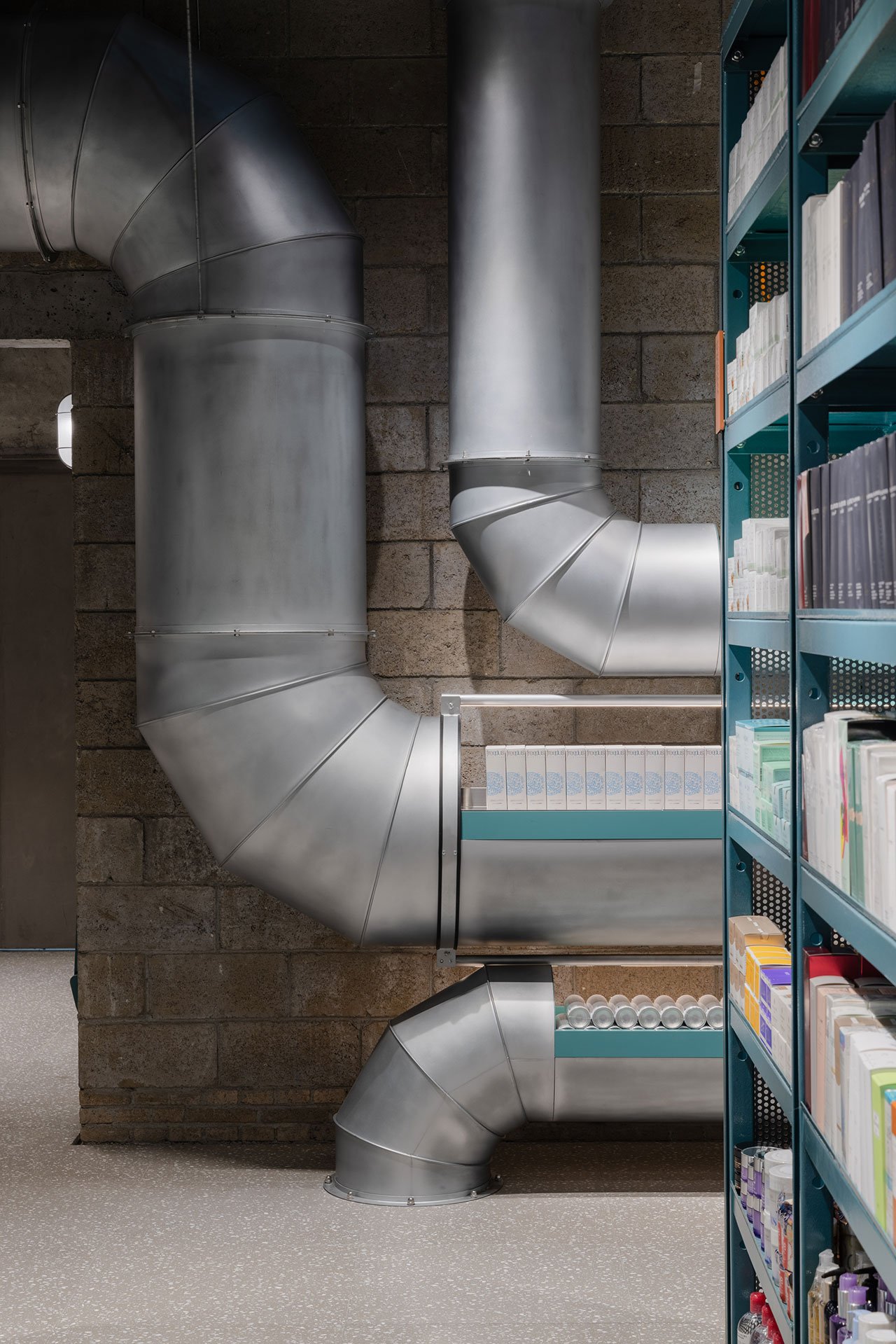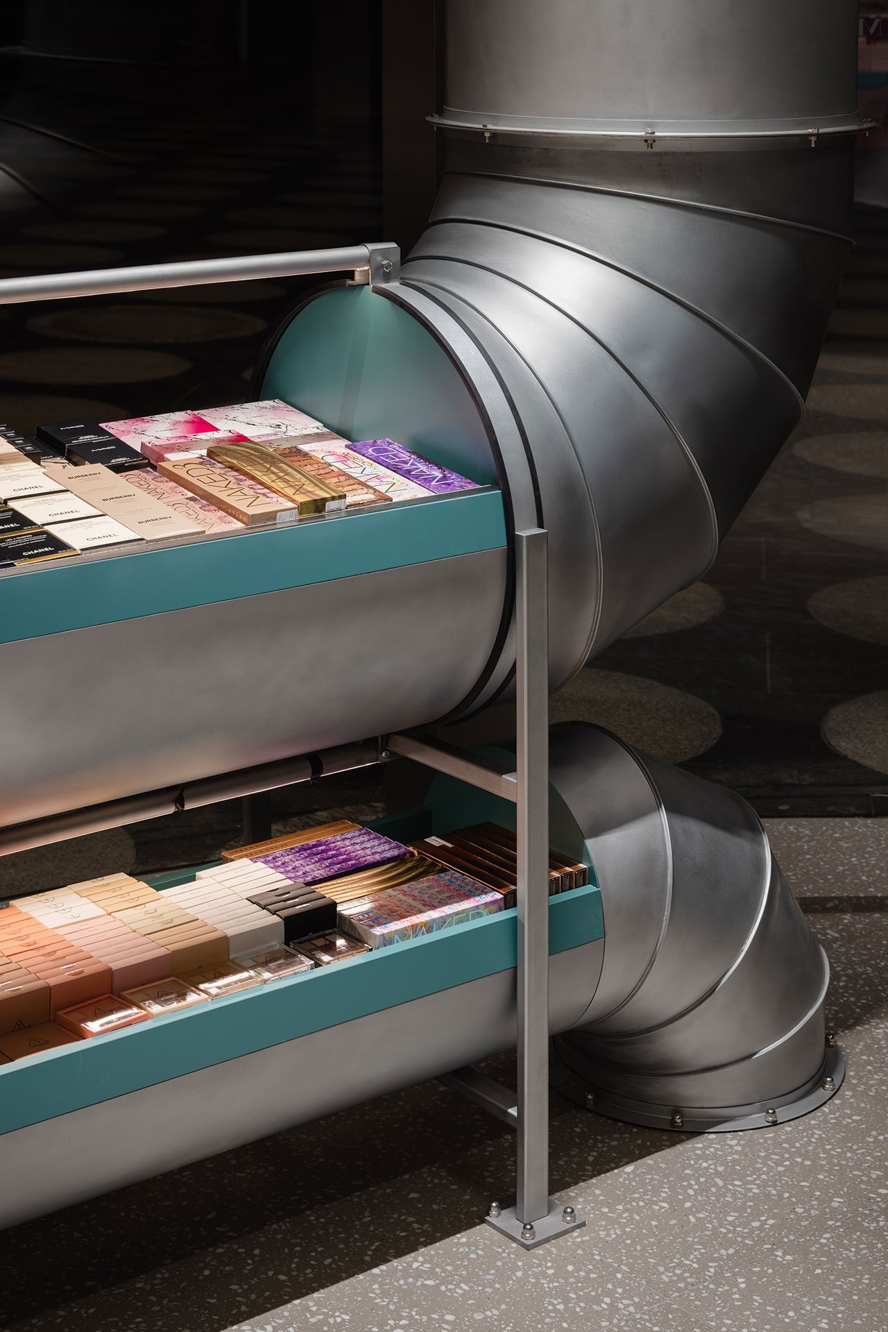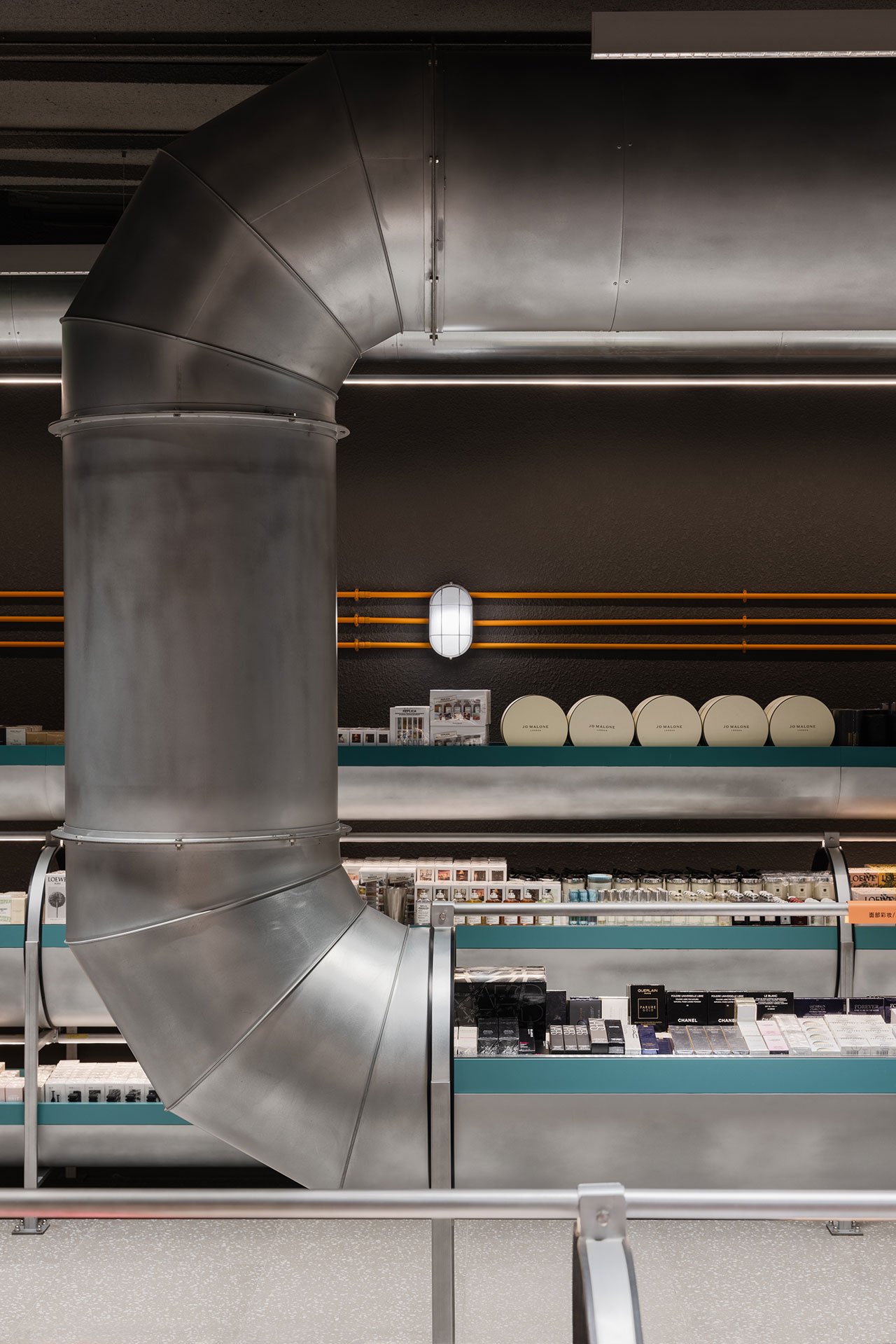 Commissioned to design the new store for Chinese cosmetics and fragrances retail brand HARMAY in Shenzhen, Shanghai-based practice AIM Architecture embraced an industrial-inspired, sci-fi inflected aesthetic that offers customers an immersive retail experience. Enveloped in a whimsical tangle of metal utility pipes that turn into product displays as they snake through the space, the store’s streamlined industrial language is a reflection of the brand’s “warehouse culture”, a commitment to clean-cut, muted and utilitarian retail environments in opposition to any sort of stylization or ornamentation, as well as a nod to Shenzhen’s industrial legacy which saw a sleepy market town exponentially grow into a megacity of more than 12 million people in the span of 50 years.