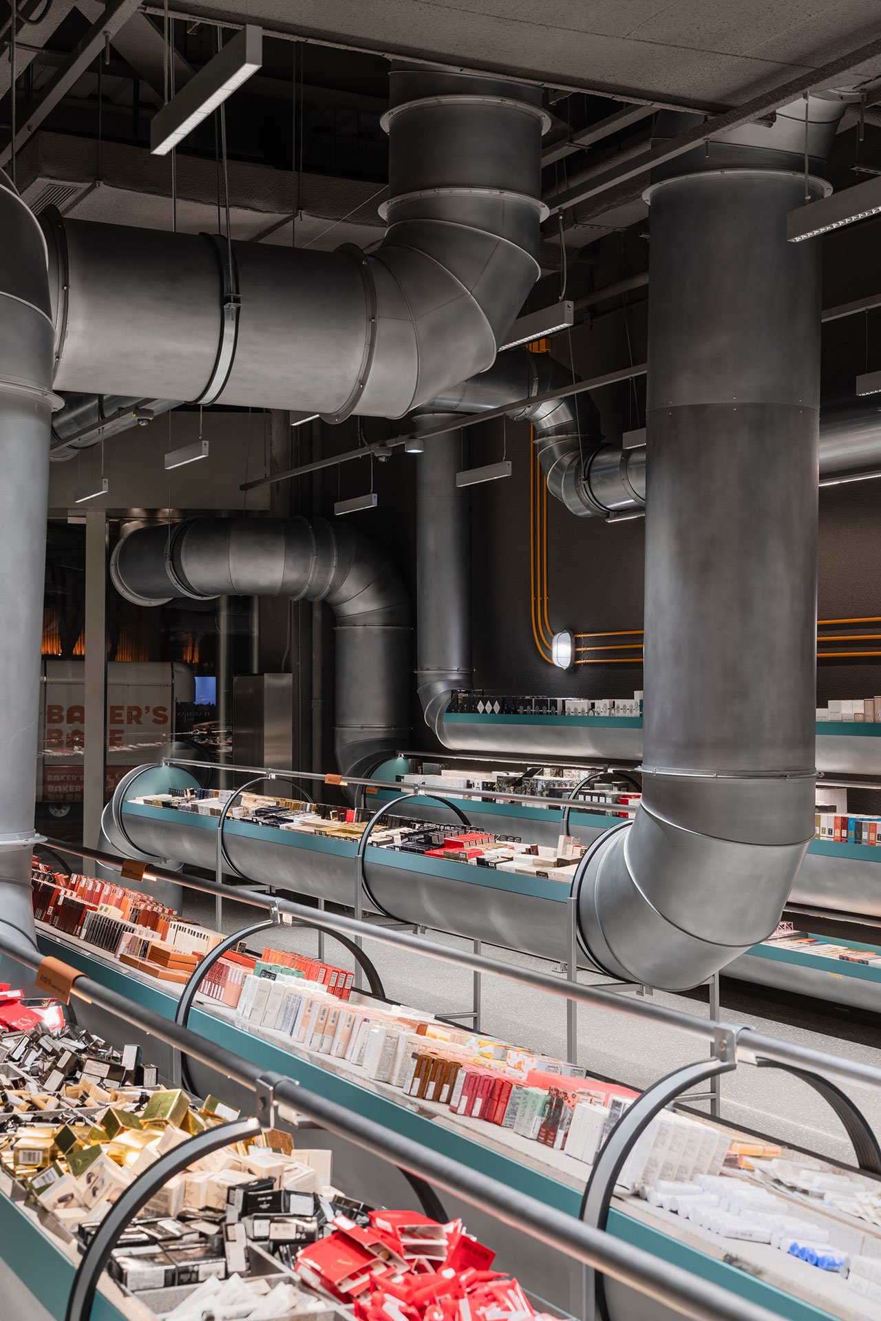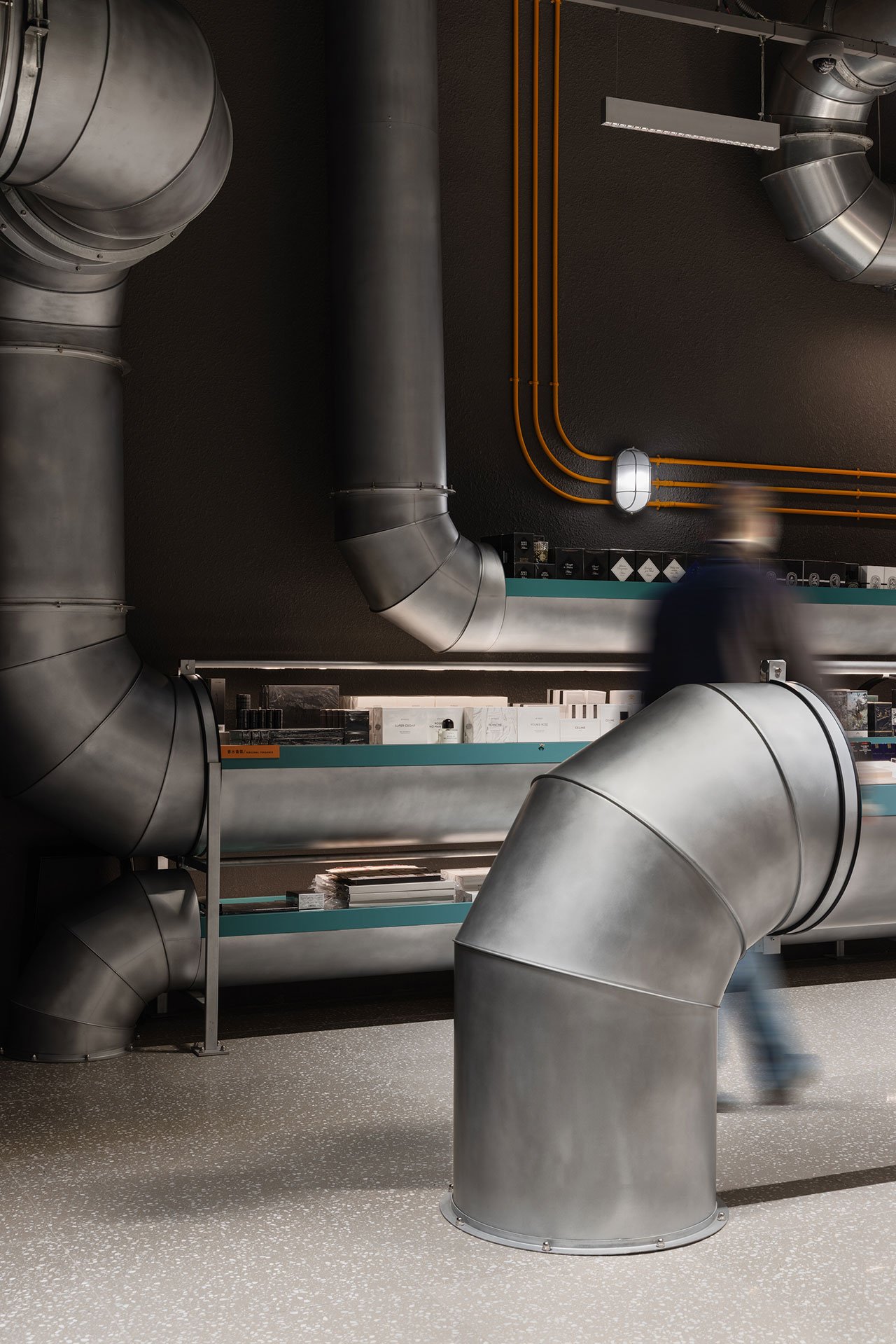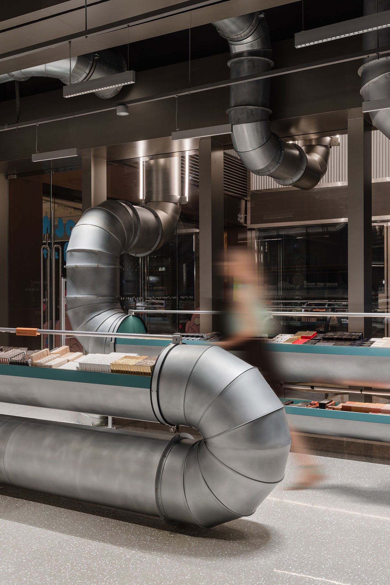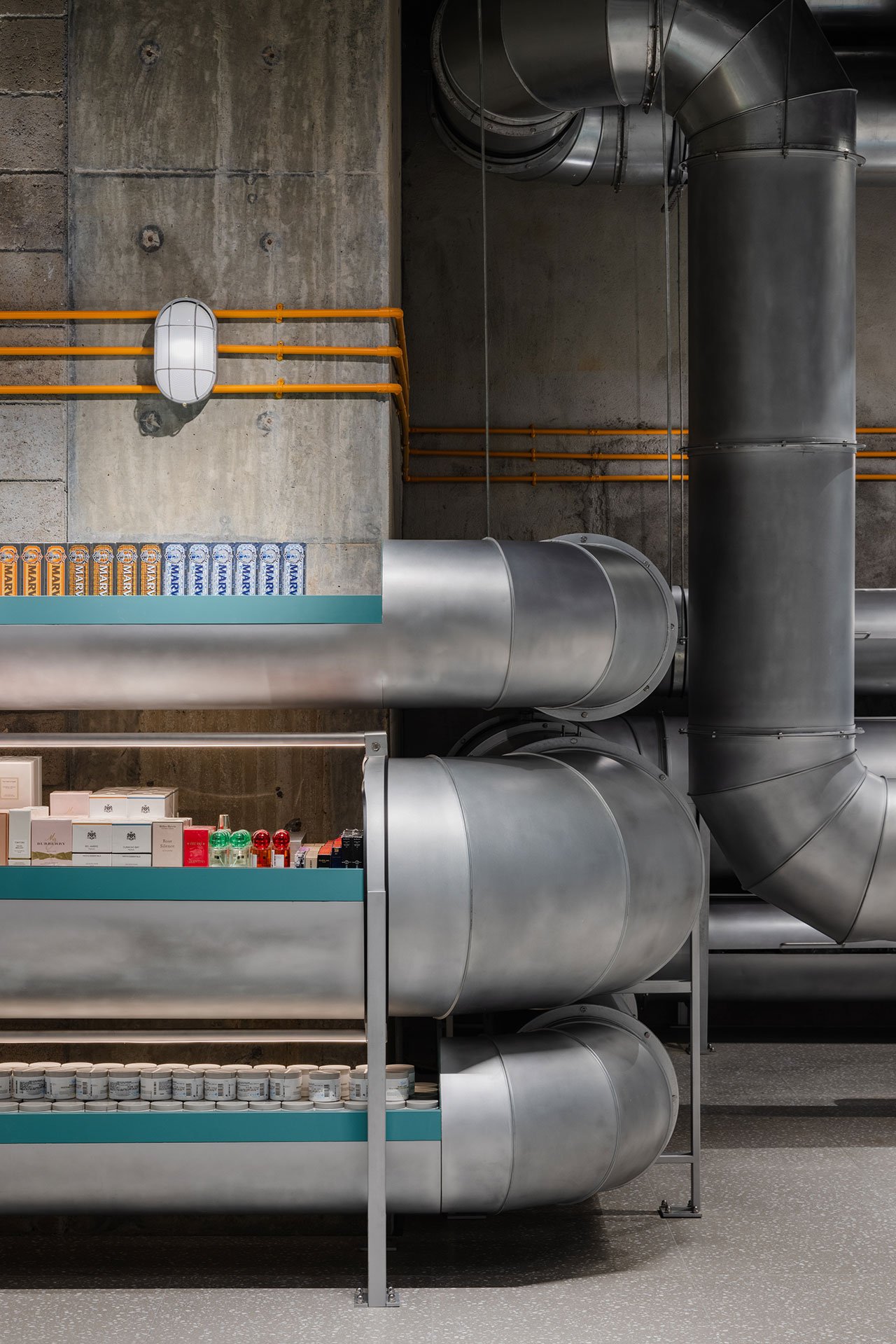 Located inside an upscale commercial development in the city’s Futian district, the store occupies an elongated 75-metre-long space whose tunnel like sensation is intentionally amplified by an intricate network of galvanized metal pipes that meander across the store’s length. Beginning from the street entrance, where a bundle of smaller and larger vertical pipes lining the upper part of the storefront draws you inside, AIM Architecture’s convoluted ductwork playfully guides customers deeper into the space: from the front section where the pipes are sliced open to serve as product displays in the form of shelves or vitrines, to a middle section populated by mobile carts, all the way to a warehouse-like section in the back.