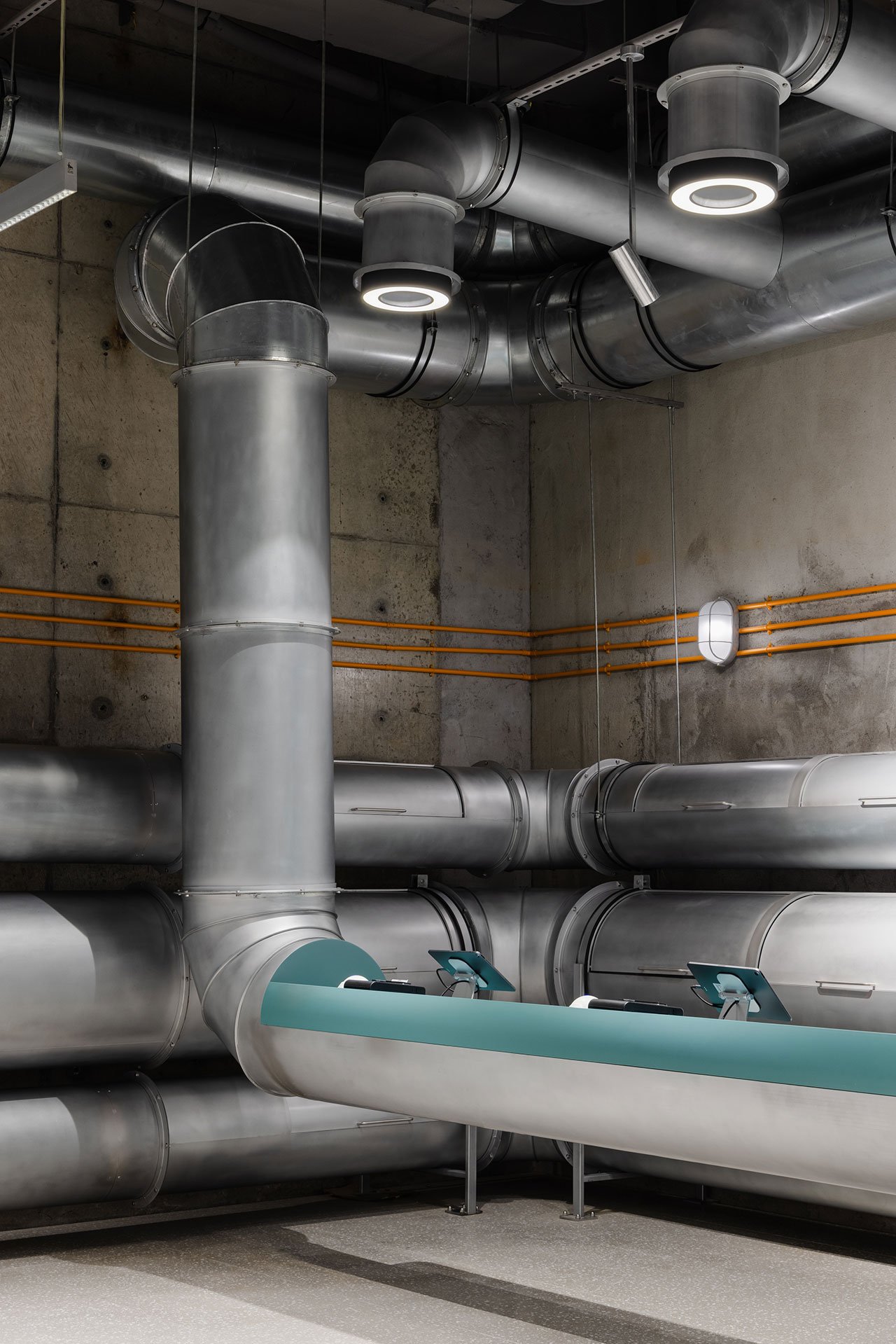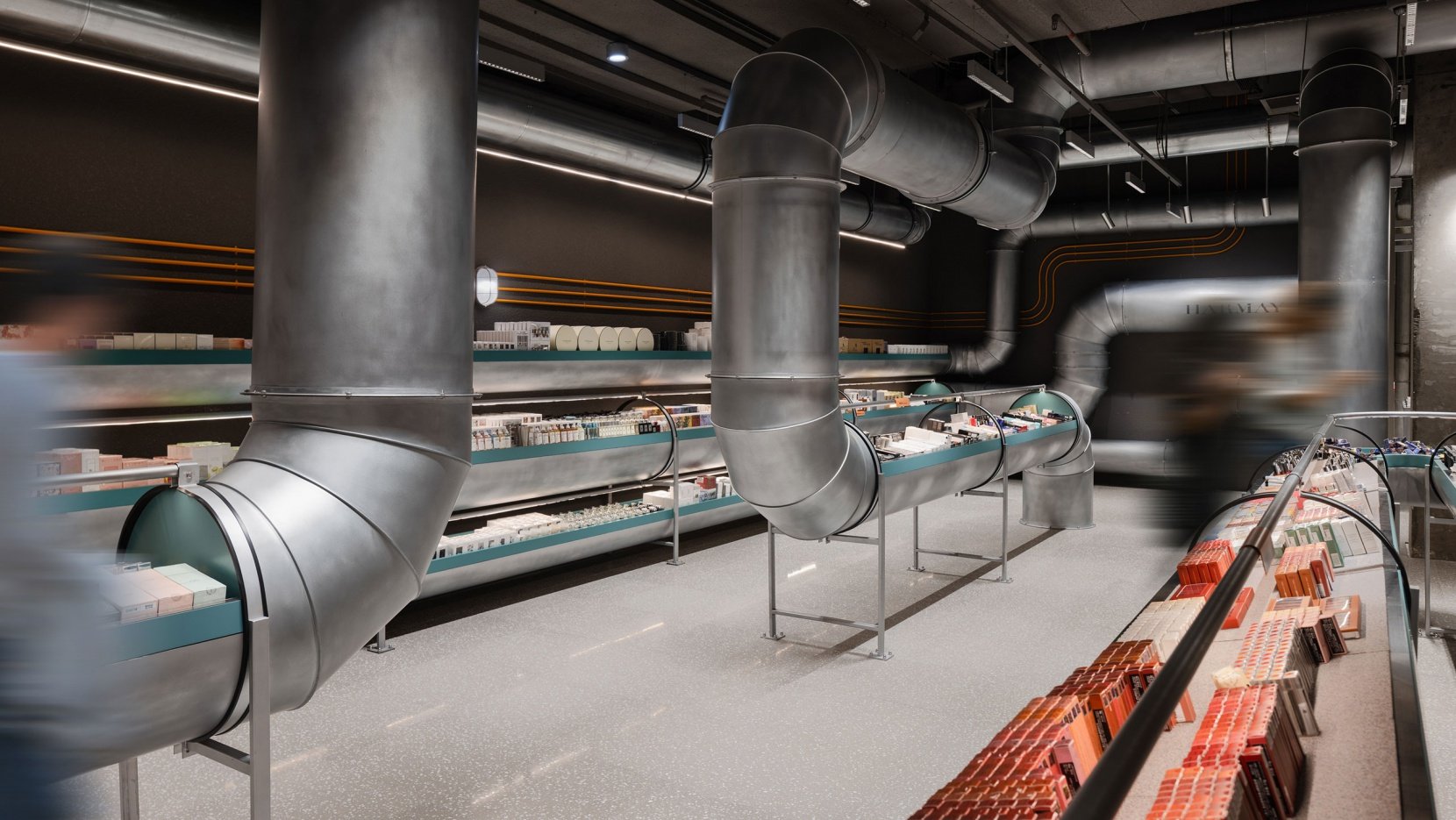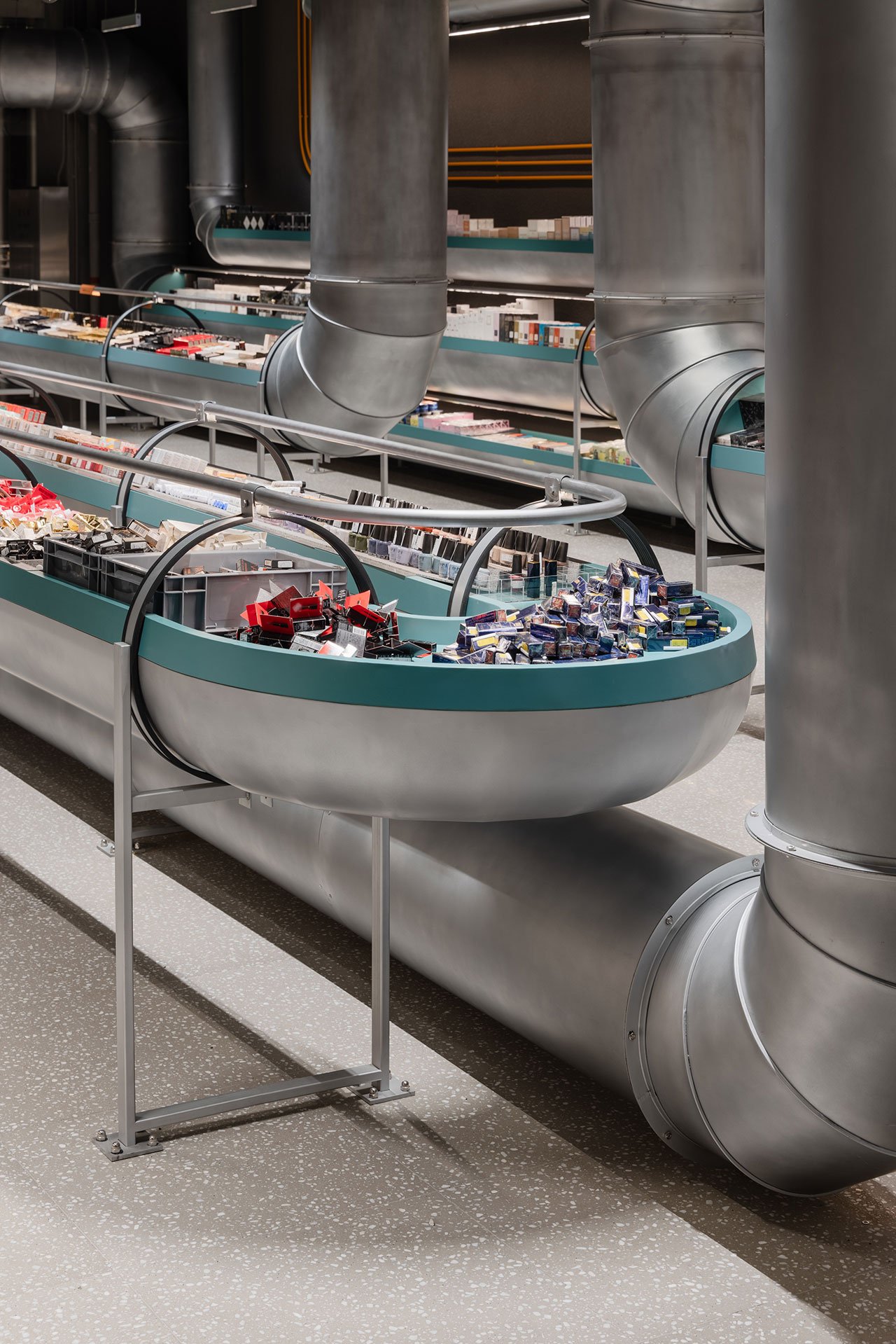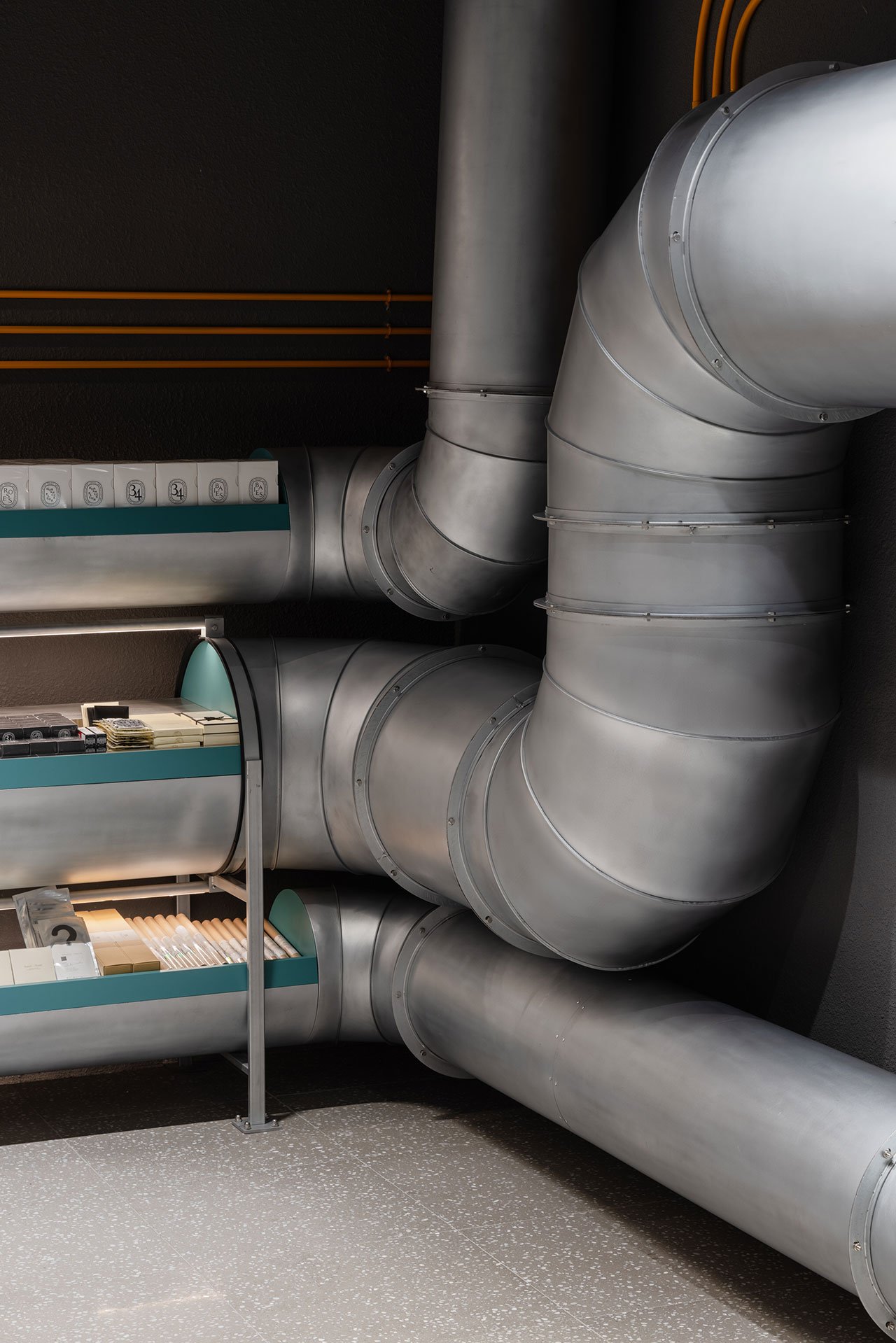 Located inside an upscale commercial development in the city’s Futian district, the store occupies an elongated 75-metre-long space whose tunnel like sensation is intentionally amplified by an intricate network of galvanized metal pipes that meander across the store’s length. Beginning from the street entrance, where a bundle of smaller and larger vertical pipes lining the upper part of the storefront draws you inside, AIM Architecture’s convoluted ductwork playfully guides customers deeper into the space: from the front section where the pipes are sliced open to serve as product displays in the form of shelves or vitrines, to a middle section populated by mobile carts, all the way to a warehouse-like section in the back.