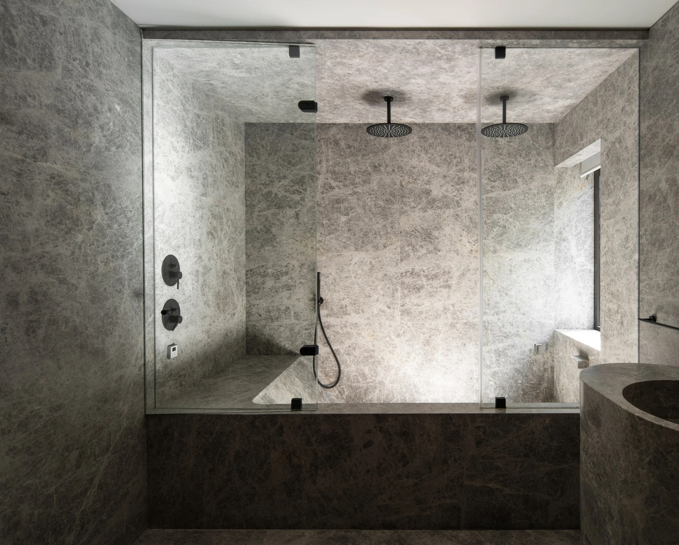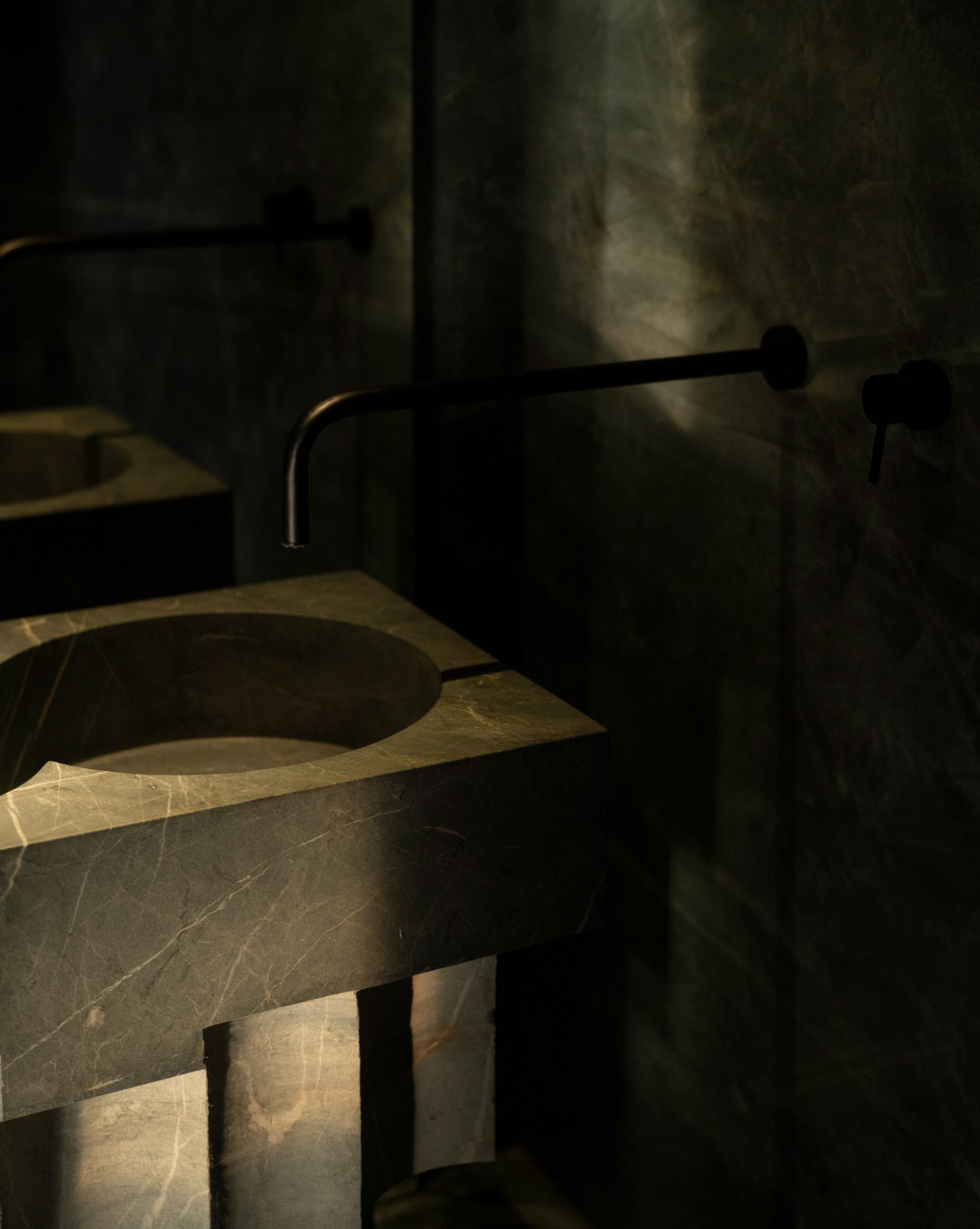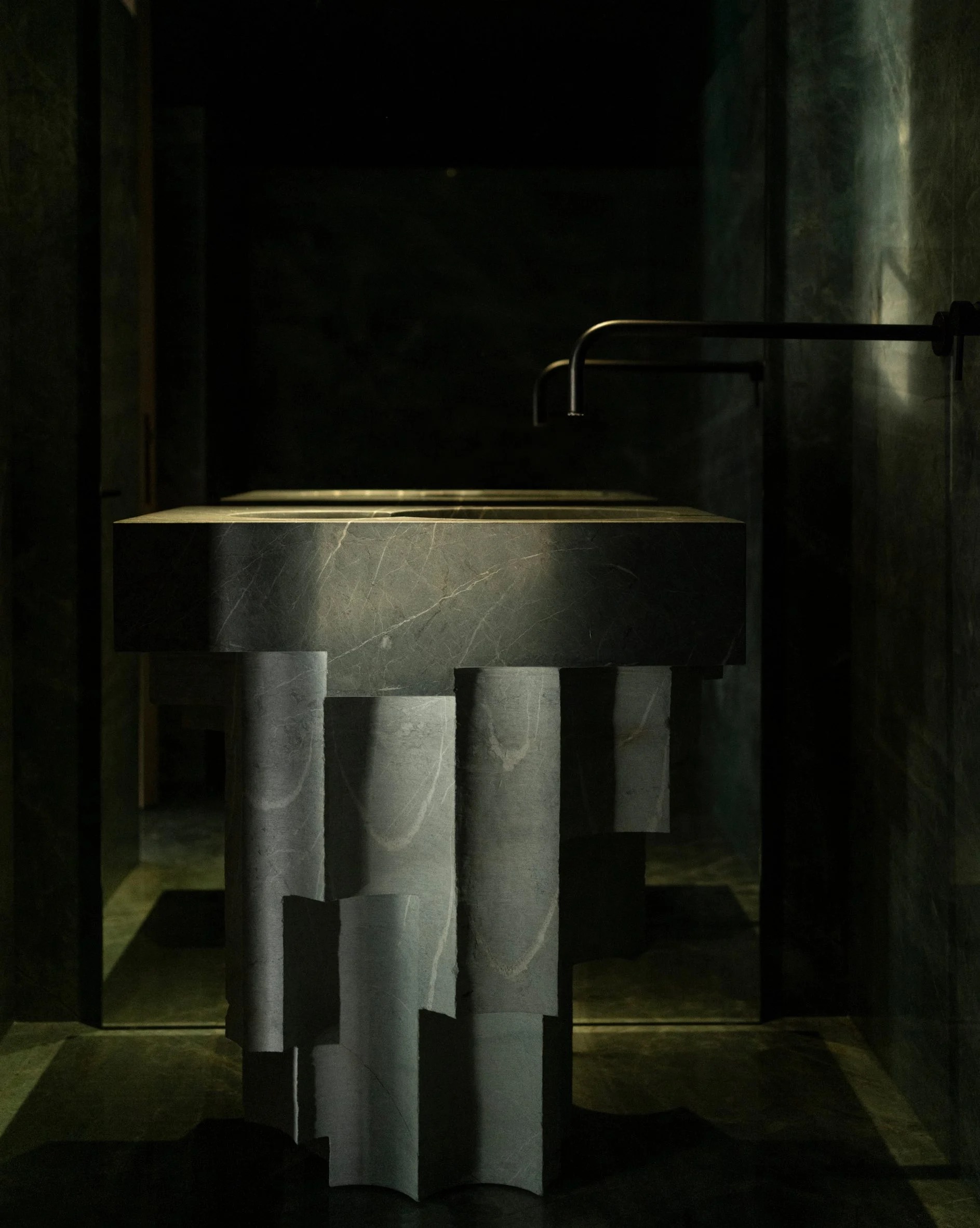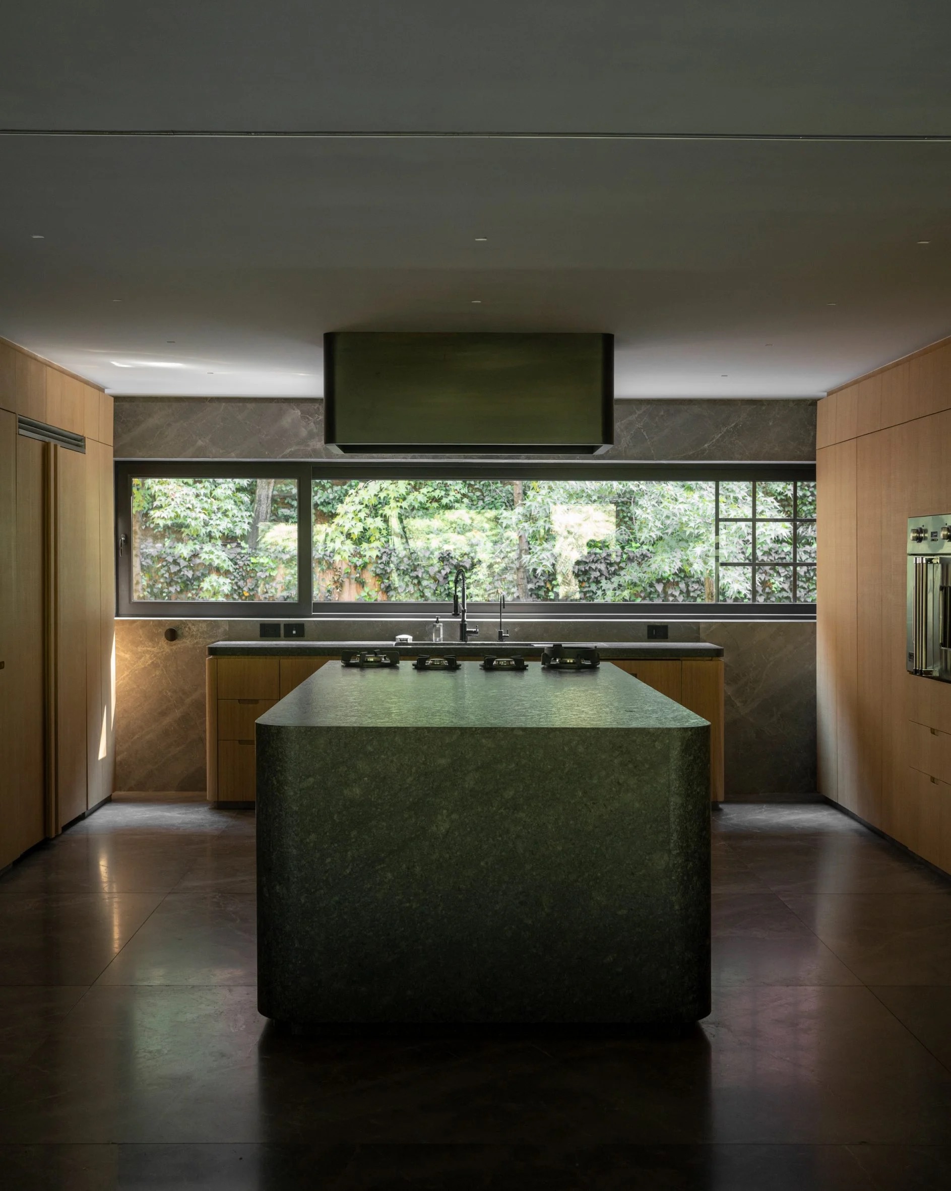 It acts as a functional piece of art, with books, vinyl records, and even a turntable displayed on its shelves. A warm oak wood skin runs the perimeter of the apartment, integrating the central granite bar in the kitchen, and providing ample storage space for essentials such as the refrigerator, pantry, linen closet, and wine cellar. The seamless integration of doors to the service areas creates a visually stunning and tactilely rich atmosphere that extends to the master bedroom. The marble flooring and walls add a touch of sophistication, imbuing the space with a modern and understated elegance. Finally, the guest bathroom is a true masterpiece, with its green quartzite flooring and walls providing a unique stony feeling. A striking sculpture of green Tikal marble serves as the washbasin, designed in collaboration with @ewestudio.