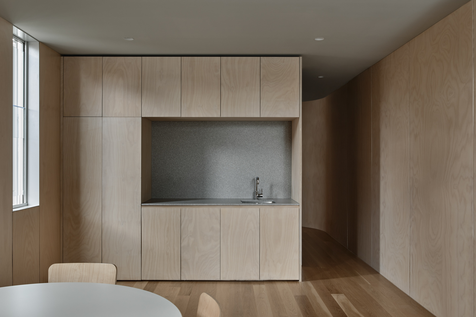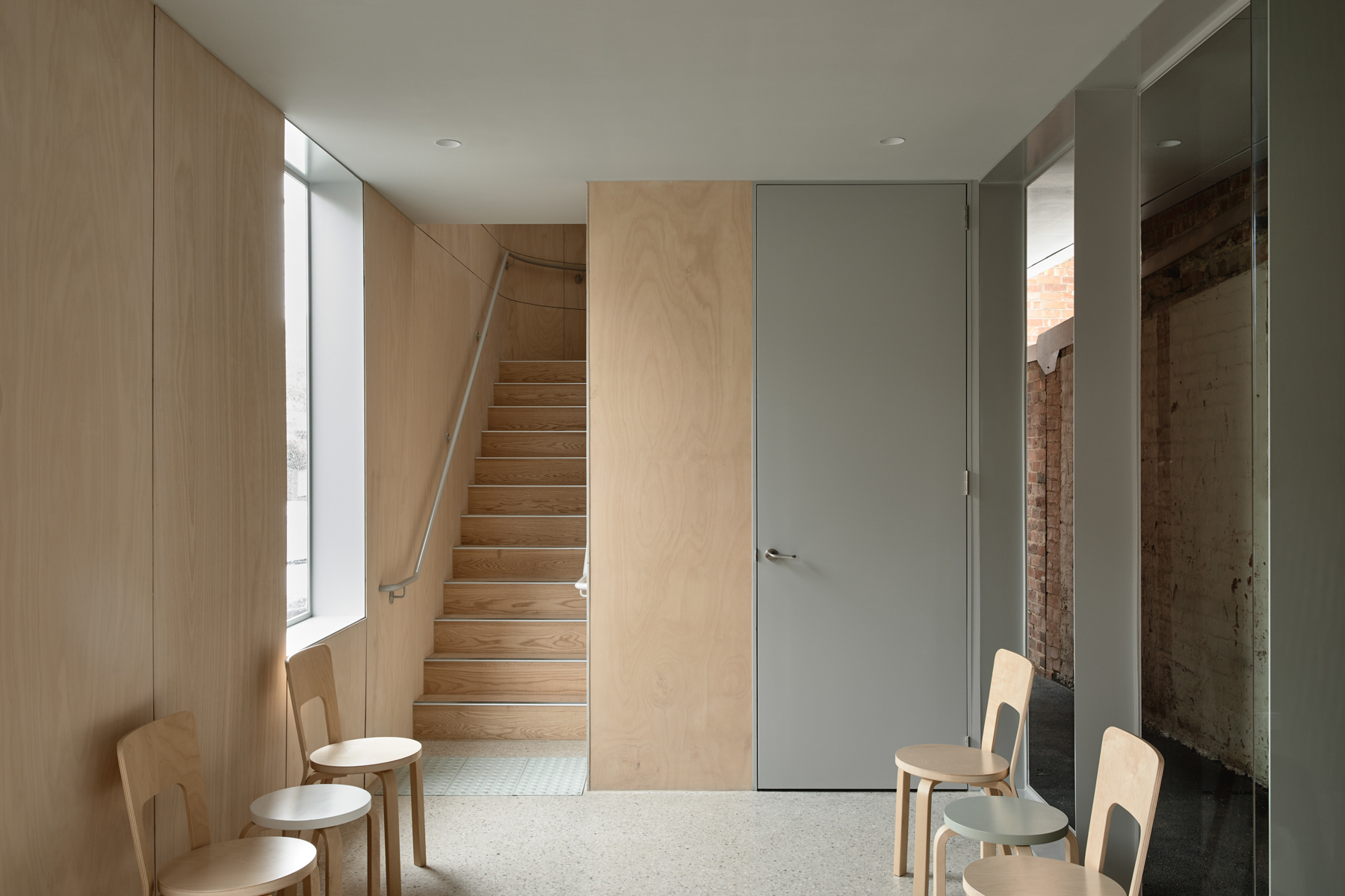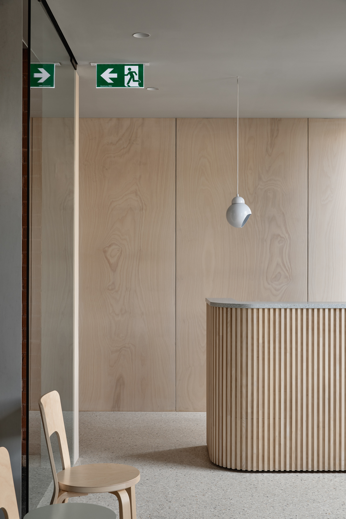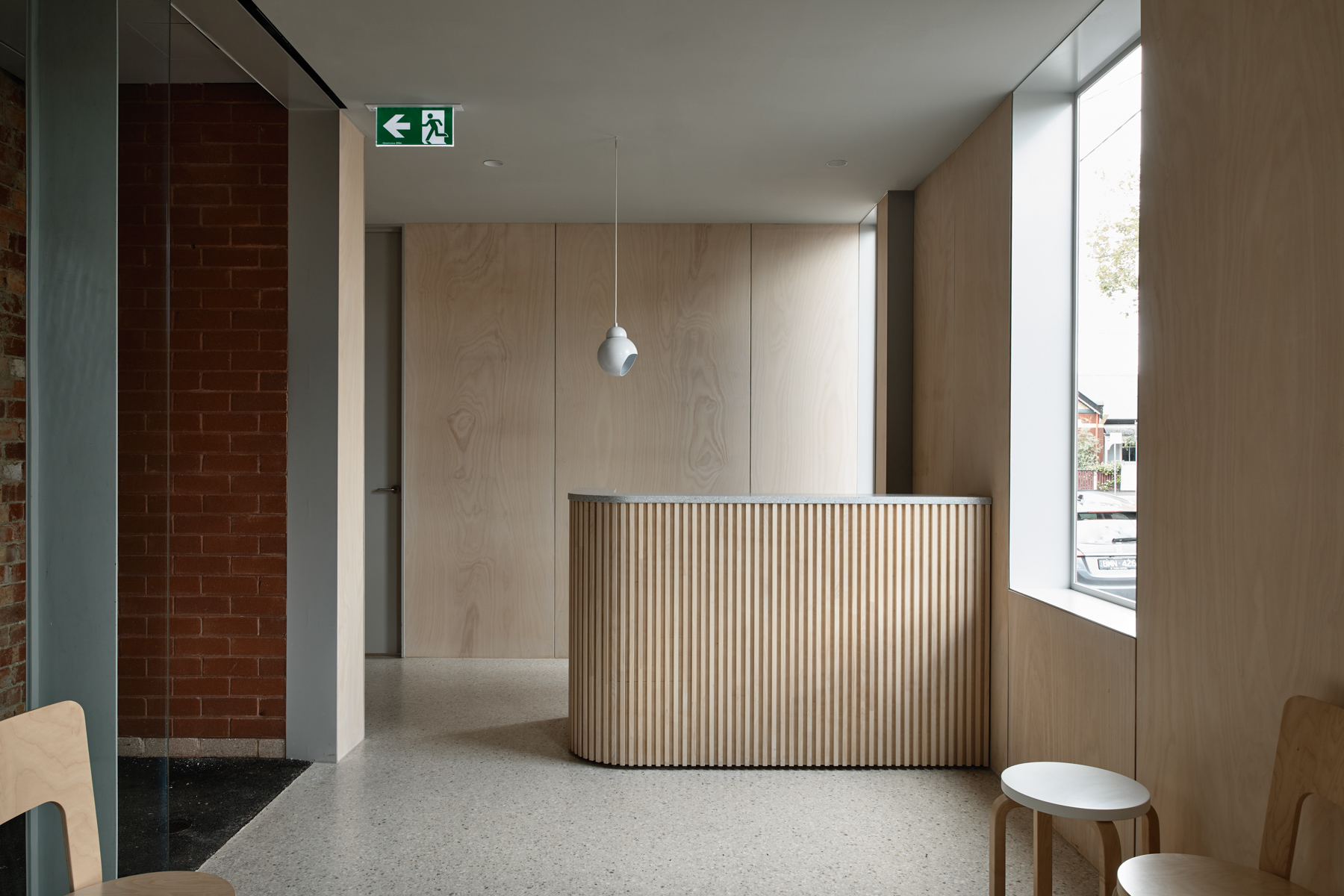 Upon entry, visitors are met with a warm plywood lined interior that follows the building’s curved expression. Tactility and natural grain “challenge the cold and clinical stereotype of dental practices in favour of a more comfortable and personal experience,” remarks Rob. Polished concrete floors accentuate the interior’s enduring sensibility, complemented by iconic Artek ‘Chair 66’ chairs, which mirror the interior’s curved detailing and material logic with precision.