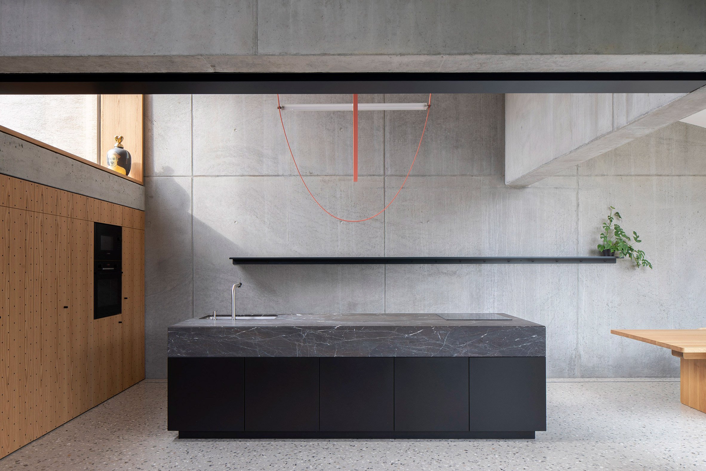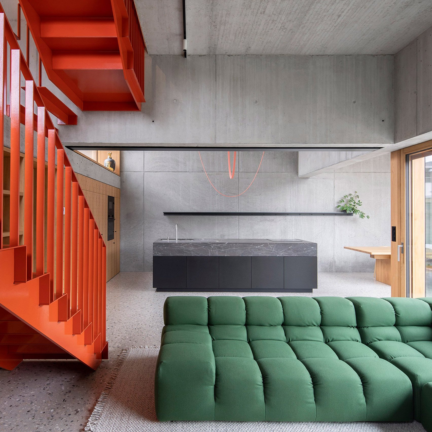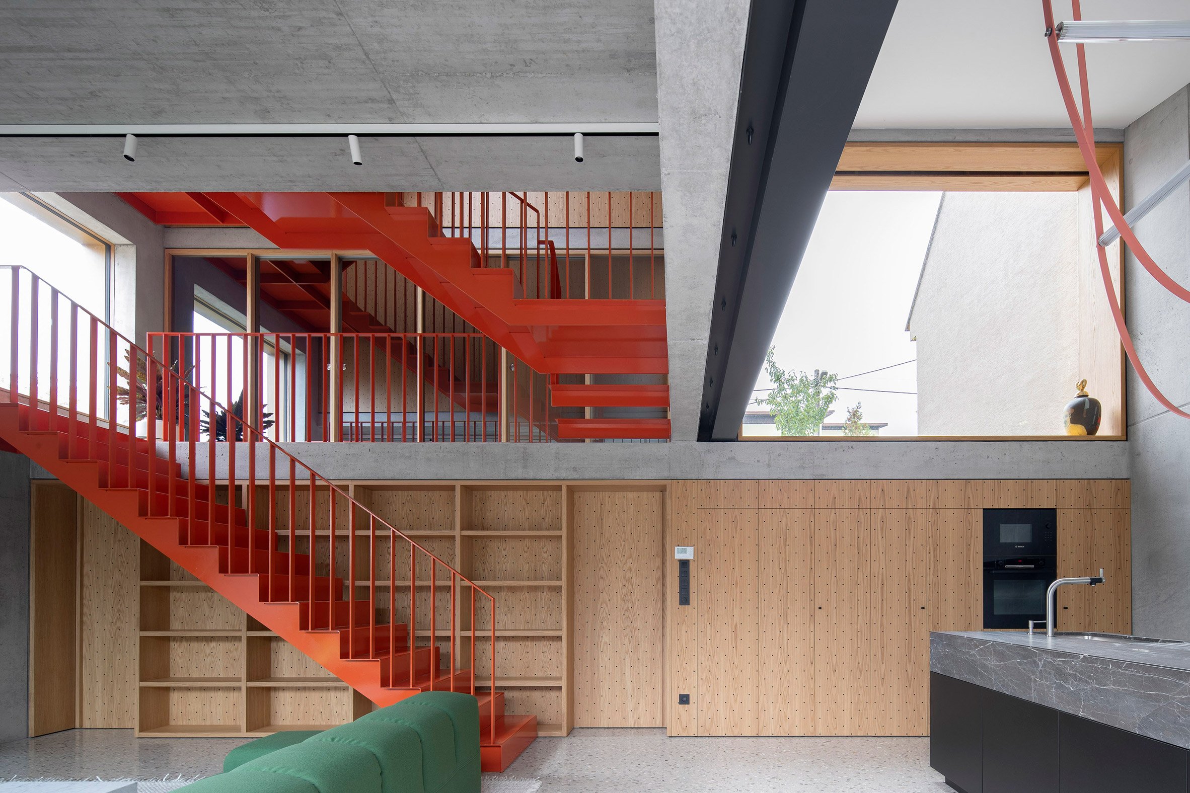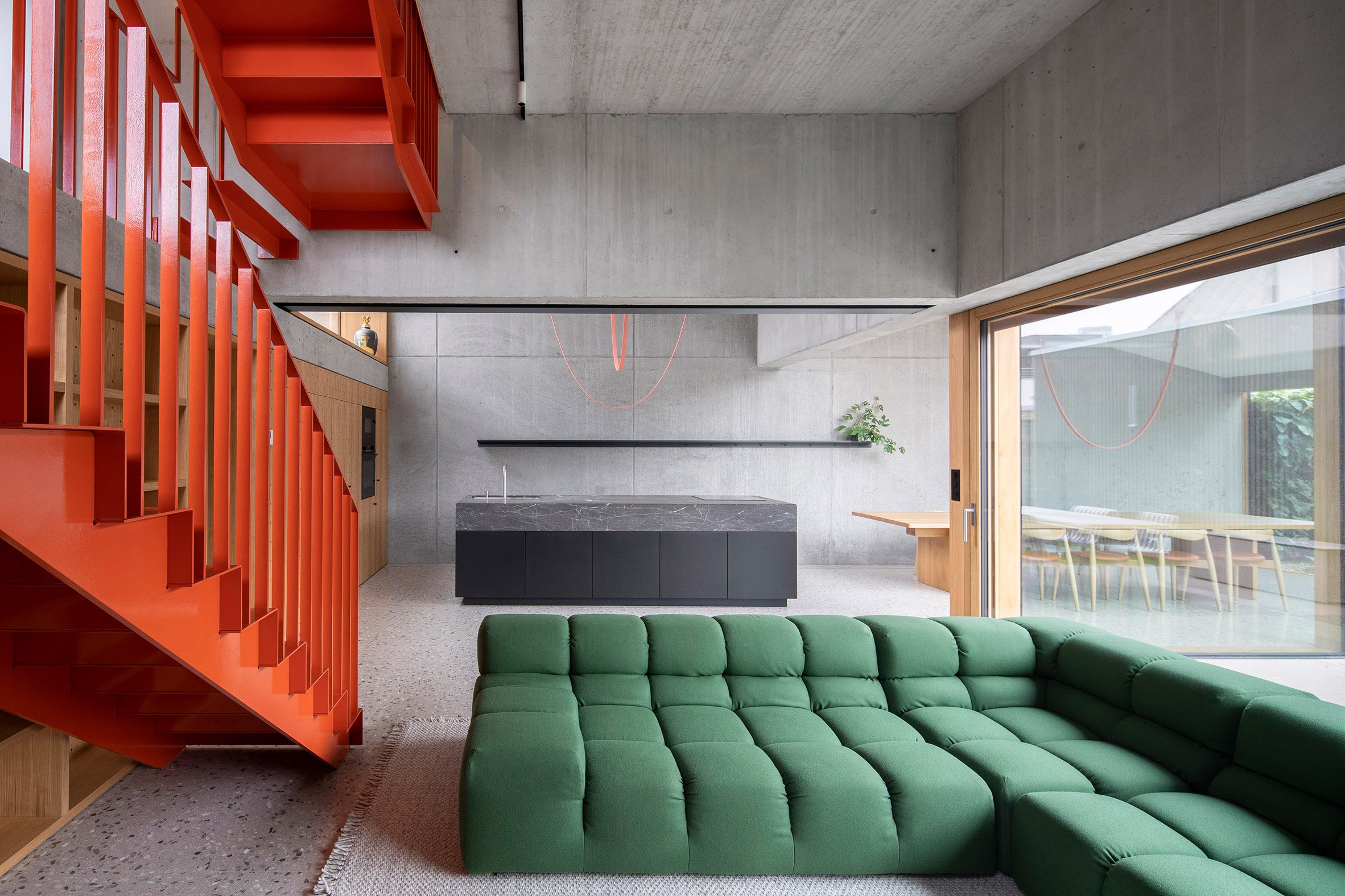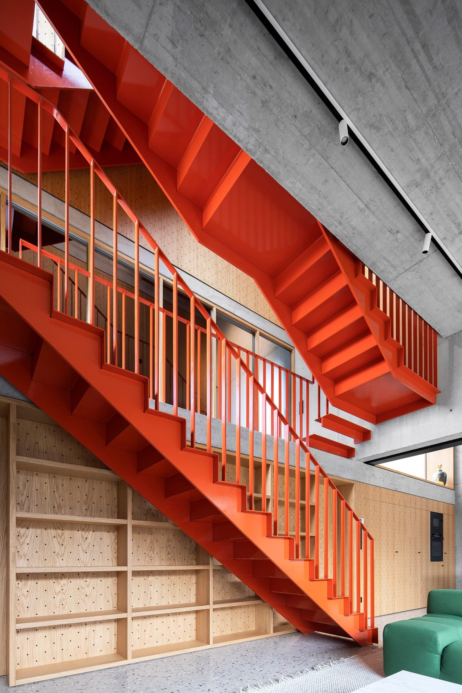 Creating a step down in the site and adding two additional storeys atop the existing building, the home is connected by a bright orange metal staircase that climbs through a central living area and kitchen overlooking the courtyard.