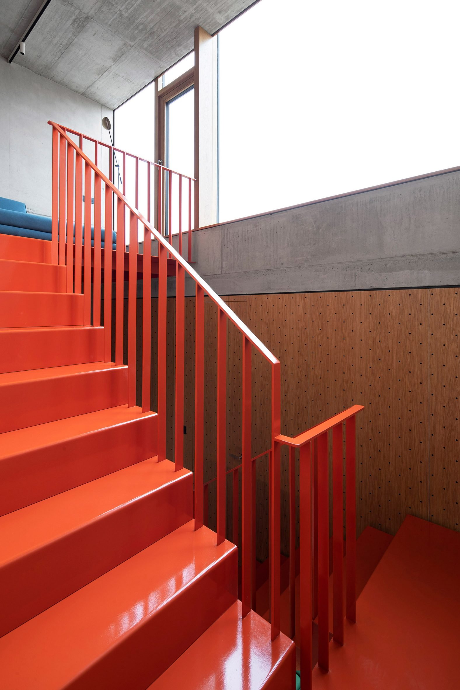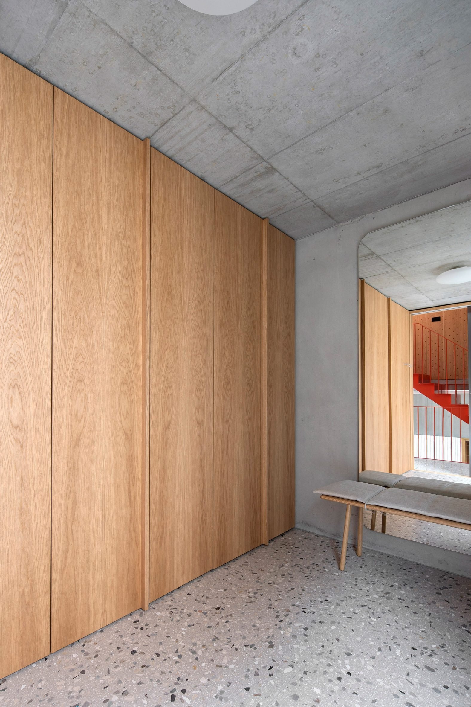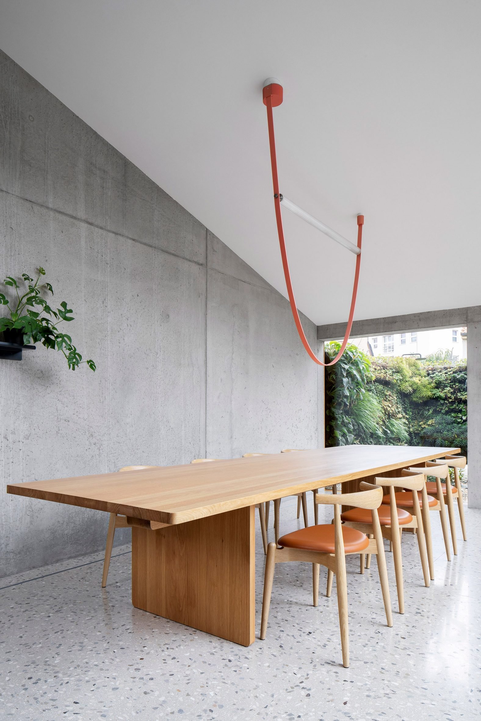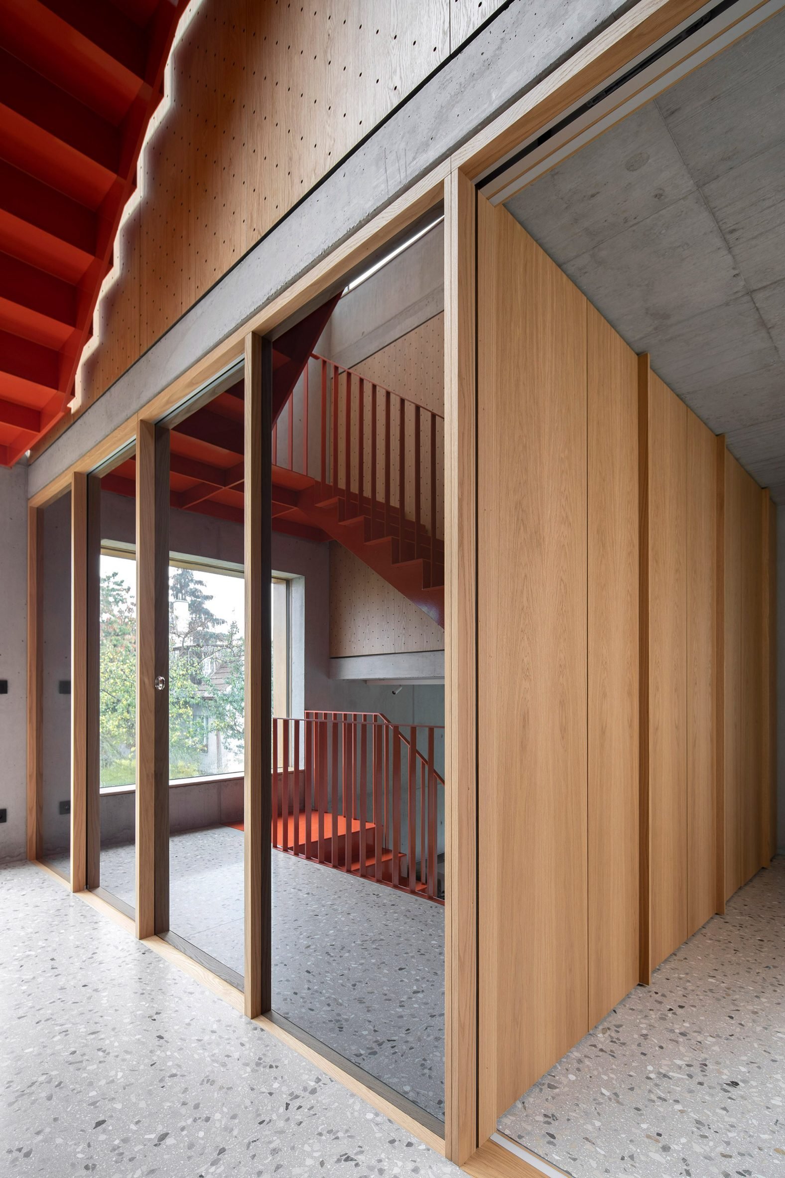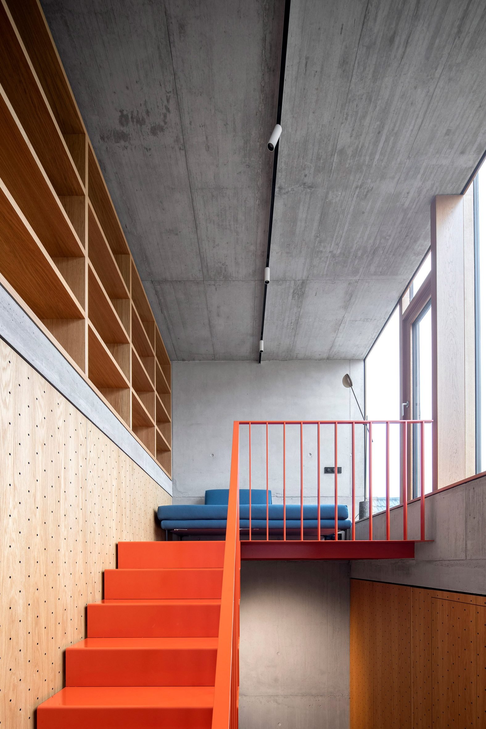 Creating a step down in the site and adding two additional storeys atop the existing building, the home is connected by a bright orange metal staircase that climbs through a central living area and kitchen overlooking the courtyard.