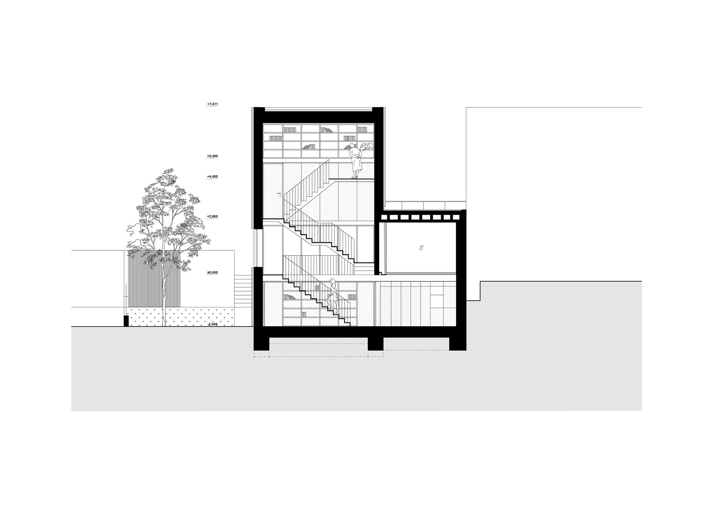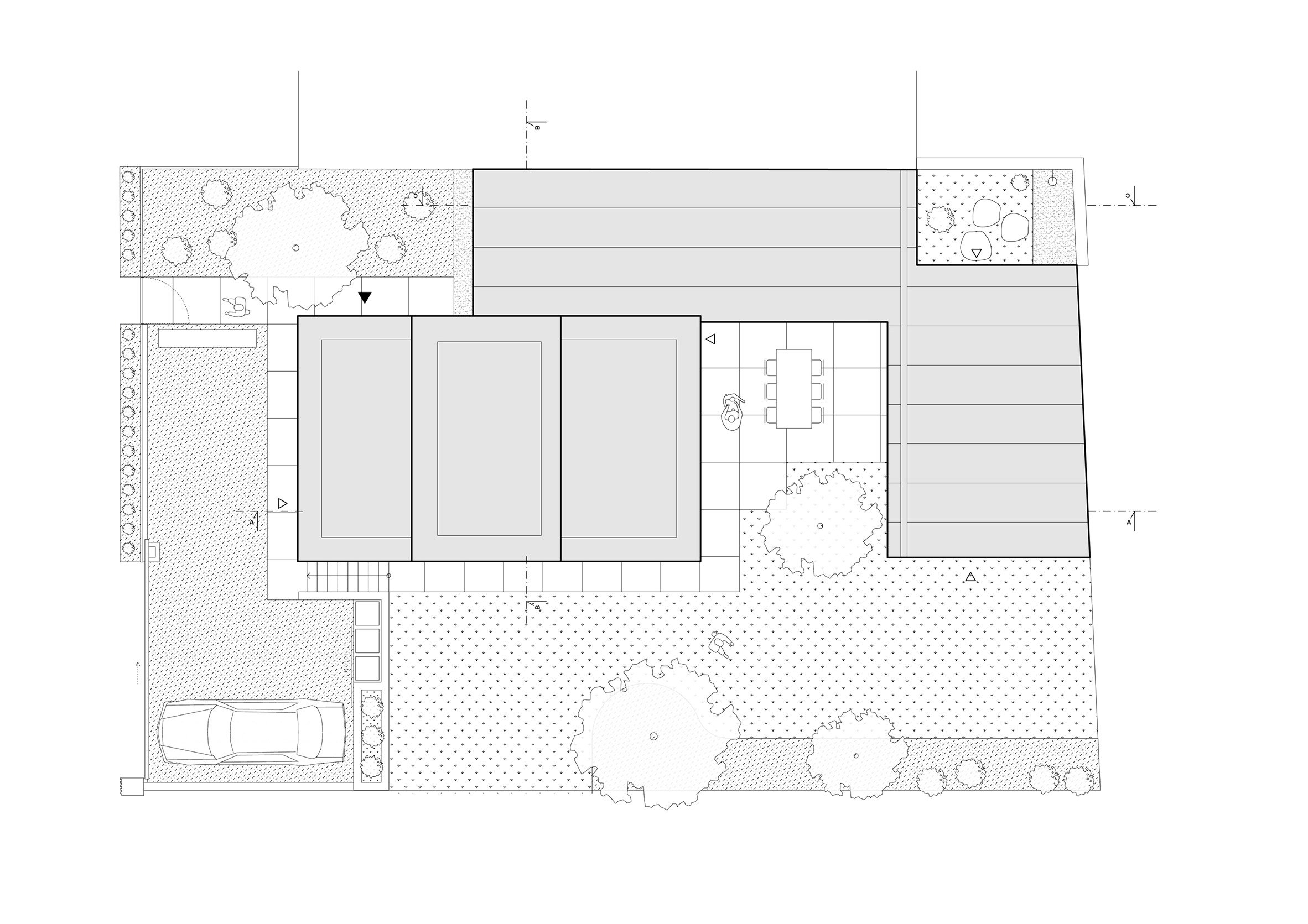 건축가는 새로운 공간을 정원바닥과 연결하여, 내부 중정을 U자 형태로 감싸는 평면을 계획했다.