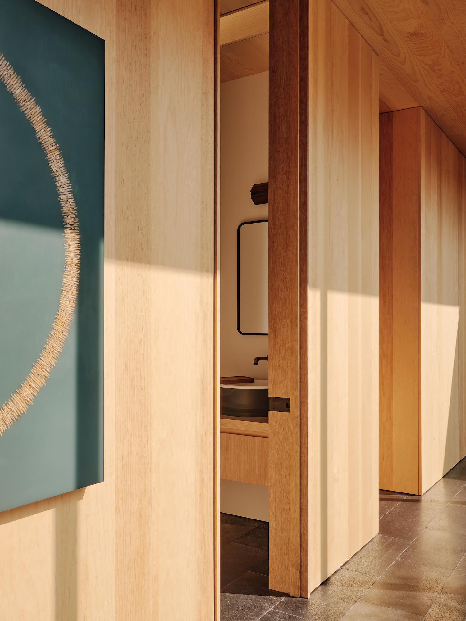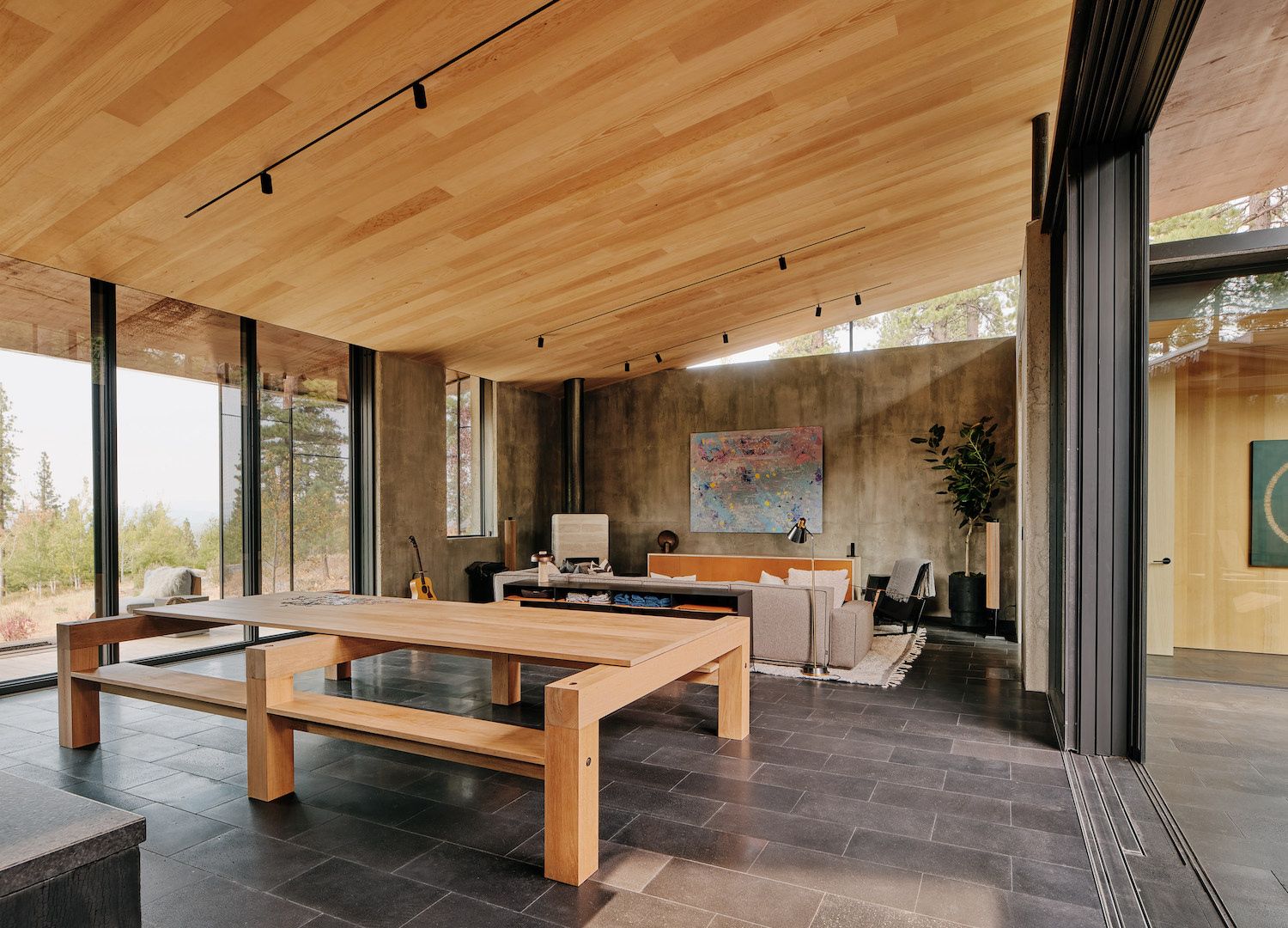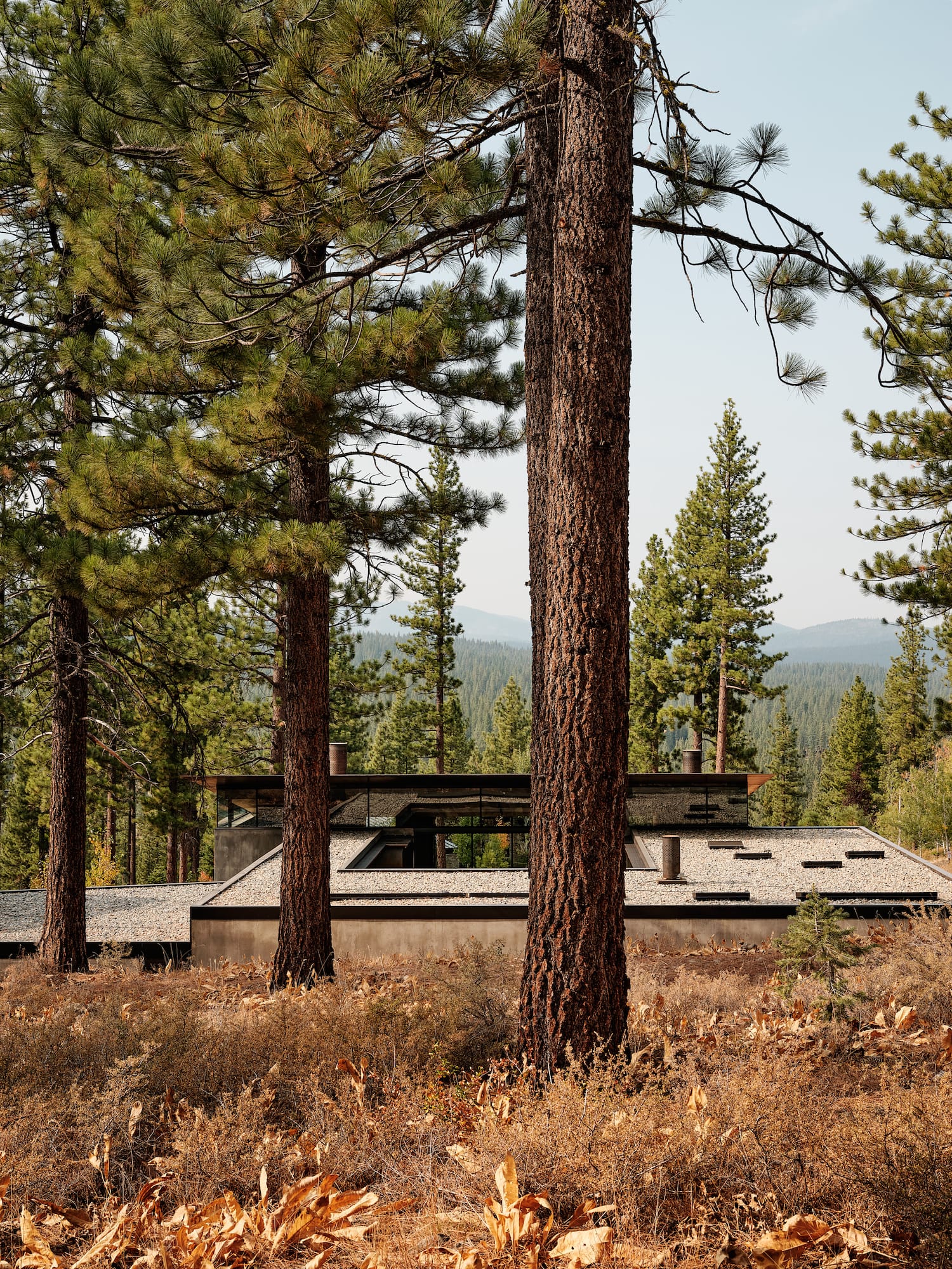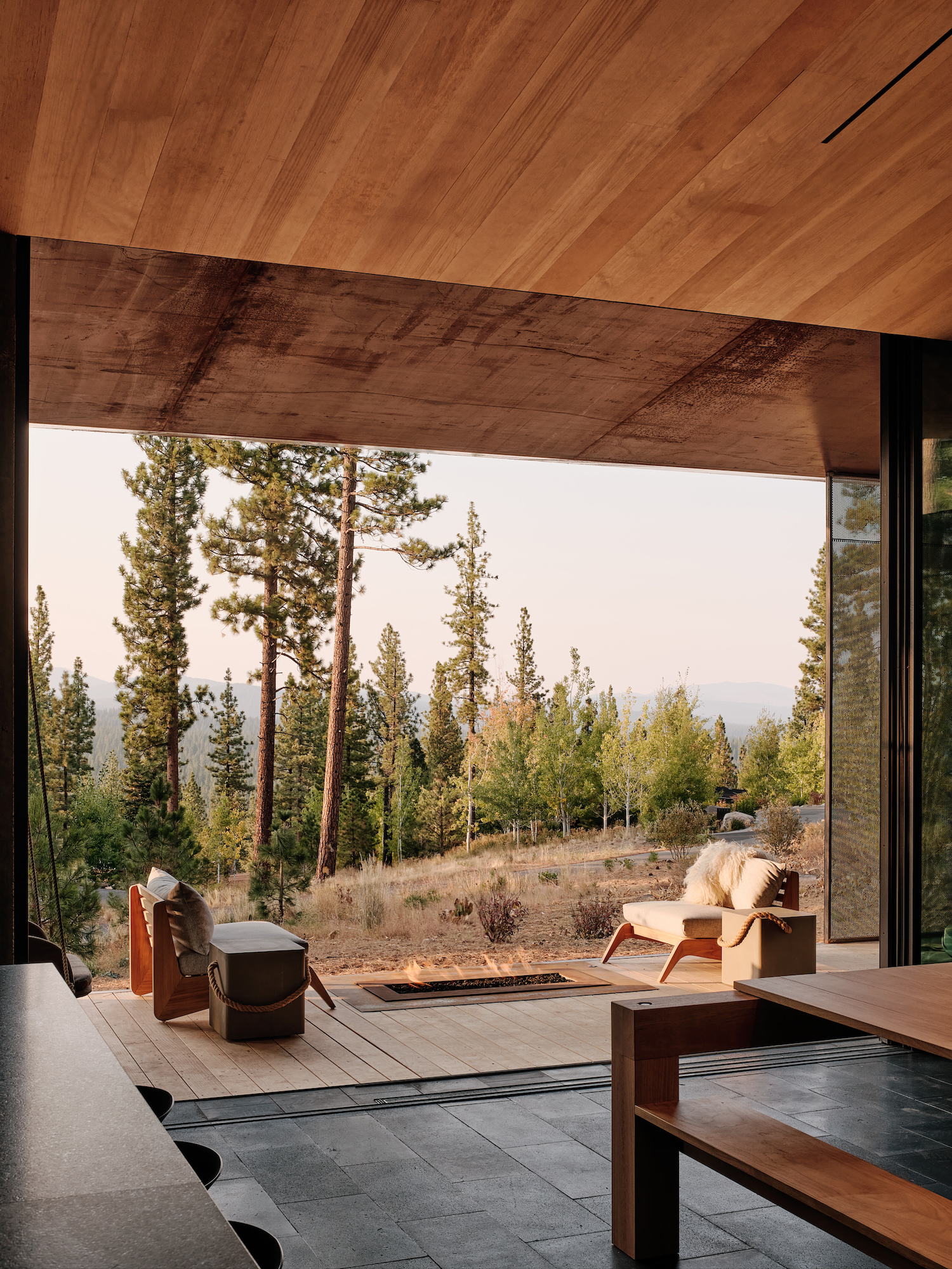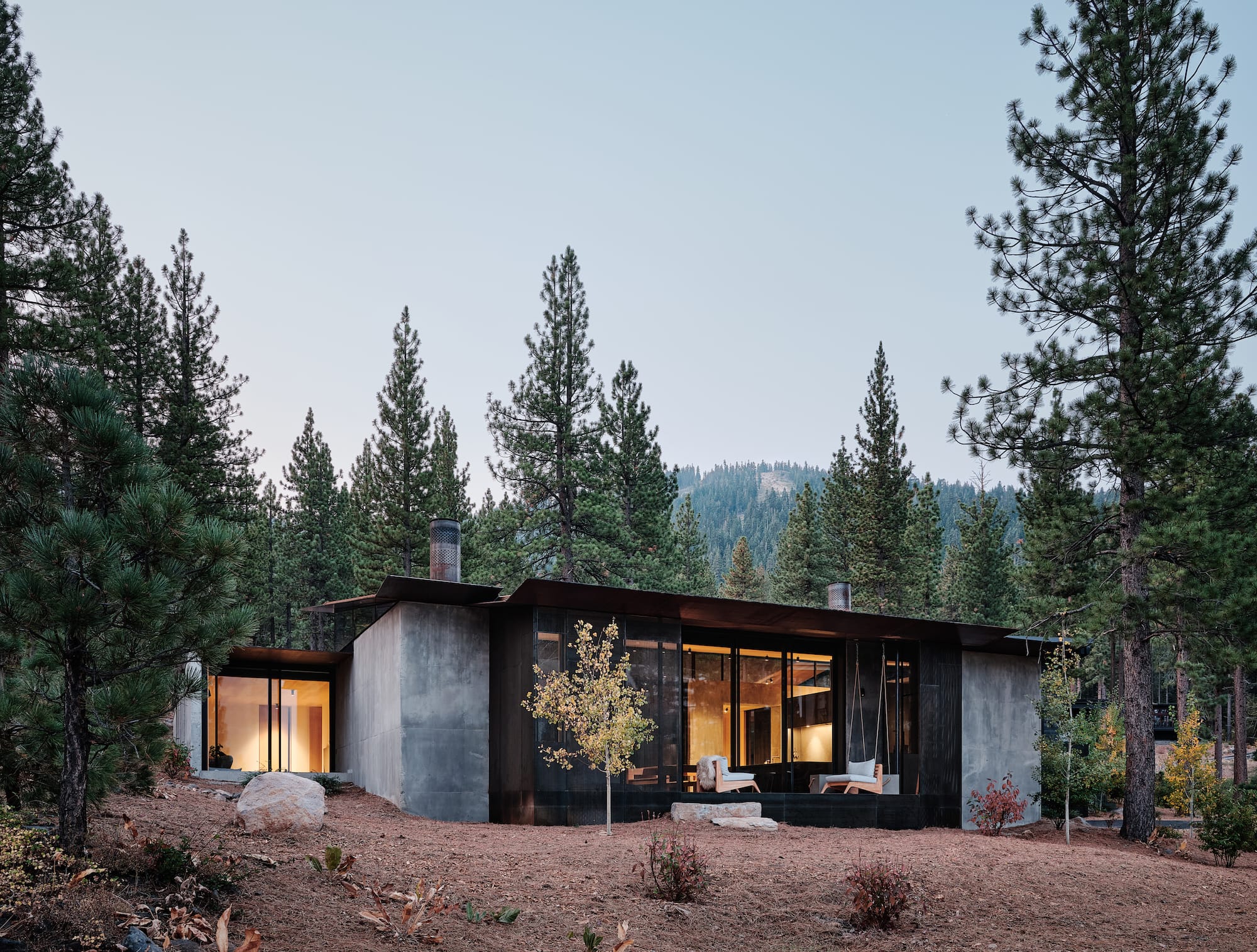 To ensure the safety of the family and their home, the designers employed a comprehensive approach to materials selection and building sizing. The material palette was inspired by the surrounding context of basalt boulders and sugar pines, with a focus on non combustible options. Glazing was limited at the exterior interface with the combustible surroundings, and maximized in the courtyard where the light and screen of the pine forest could safely connect with the interior. The sleeping areas were dug into the slope and wrapped around a courtyard to earn privacy from neighbors, while the family gathering space was a south-facing concrete pavilion that connects the courtyard to the distant view beyond.