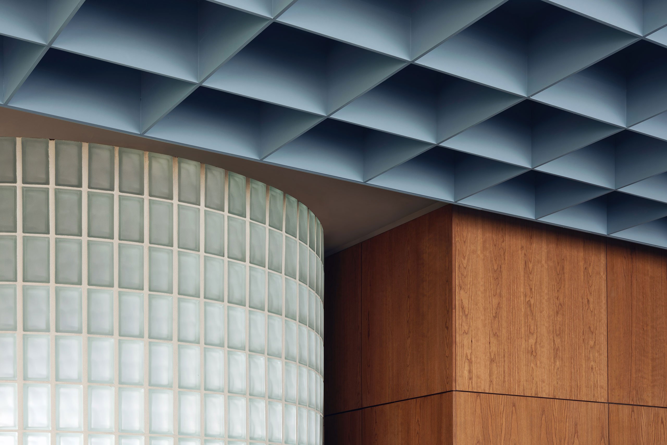 As befitting a restaurant where culinary theatricality is an essential part of the dining experience, the focal point of the space is the central island counter where the sushi master can be seen at work. Wrapped in reflective curved steel panelling and topped with solid wood, the counter’s clean lines, simple yet bold geometry and detailed craftsmanship encapsulate Kos and Huang’s approach to Maido’s interiors. Across the walls, dark cherry wood panelling with shallow square alcoves housing large abstract paintings is counterbalanced by the suspended coffered ceiling which is rendered in a soft baby blue hue. The ceiling’s geometric design echoes the checkerboard pattern of the quarry tile flooring below as well as that of the large semi circular glass block partition that separates a more private lounge at the back of the restaurant. The inspiration for the partition “came from the facade of Saint John’s Wood Library, the next door building of the same era”, as Alexy and Che explain, but in effect it also functions much like the Shoji screens found in traditional Japanese tea houses that allow daylight to filter inside from outdoors.