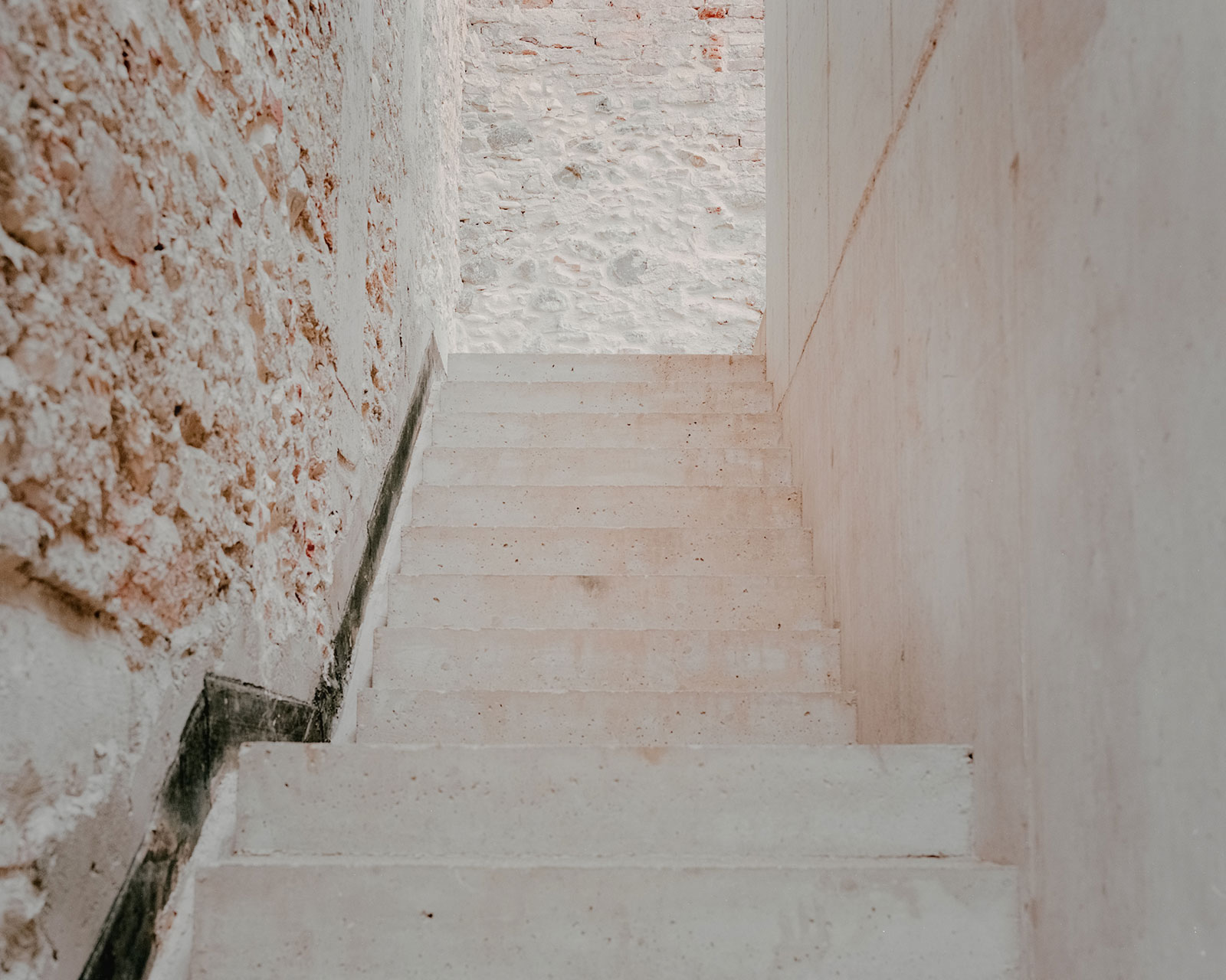 The path is designed to gently lead the visitor inside the exhibition area from the furthest side: the place unveils itself gradually, following a closed sequence of crossings, one threshold at a time. At this point, the itinerary reaches the so-called ‘black threshold,’ which is a place defined by a twentieth century addition consisting of a frame in reinforced concrete, whose presence is here underlined by an ‘absolute black’ coating. This expedient focuses on the viewer’s visual perception, making the eye attentive to the layers and, at the same time, appeasing it, thanks to a background suitable for experiencing art pieces in an inevitable dialogue with the existing building.