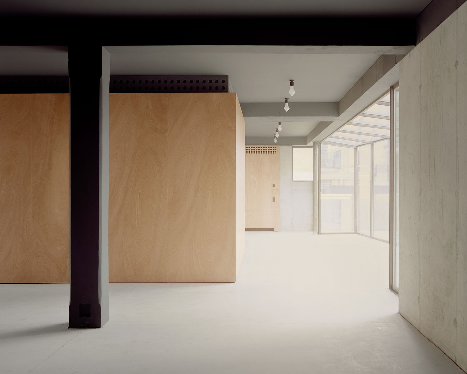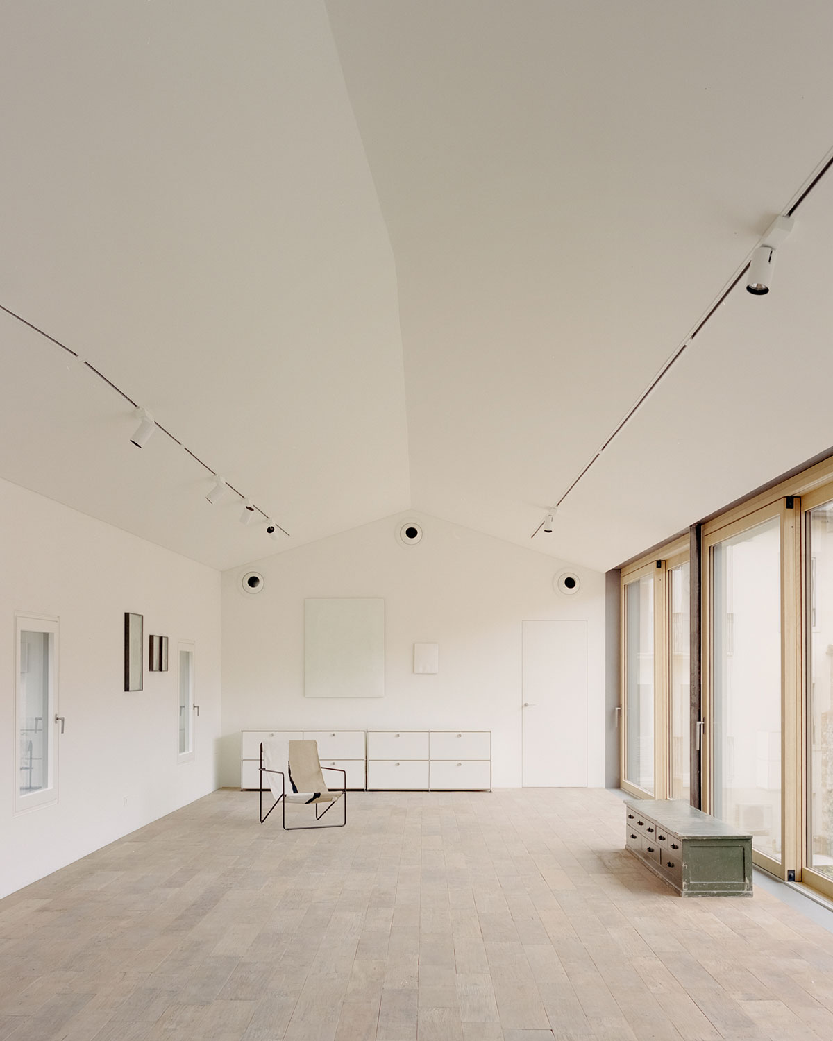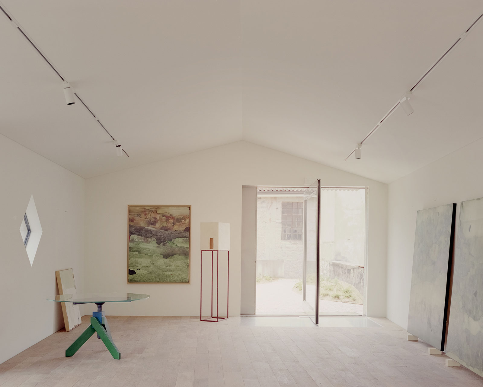 Precisely by the original visible wall, the presence of a third threshold can be perceived: the memory of what used to be a typography and, before that, a barn leads to the discovery of a whole different spatiality, which is authentic since it has been freed from the additions of time. Here, in the background, a discrete volume of visible reinforced concrete encloses restrooms and captures light thanks to the contrast with the wooden slab. The longitudinal development of the great hall entirely opens up, revealing an additional threshold: a glass and steel cage that expands the space unveiling the inner court, almost as if it was a treasure. It reminds of a Japanese garden scattered with Mattia Bosco sculptures, providing a privileged viewpoint and a moment of rest.