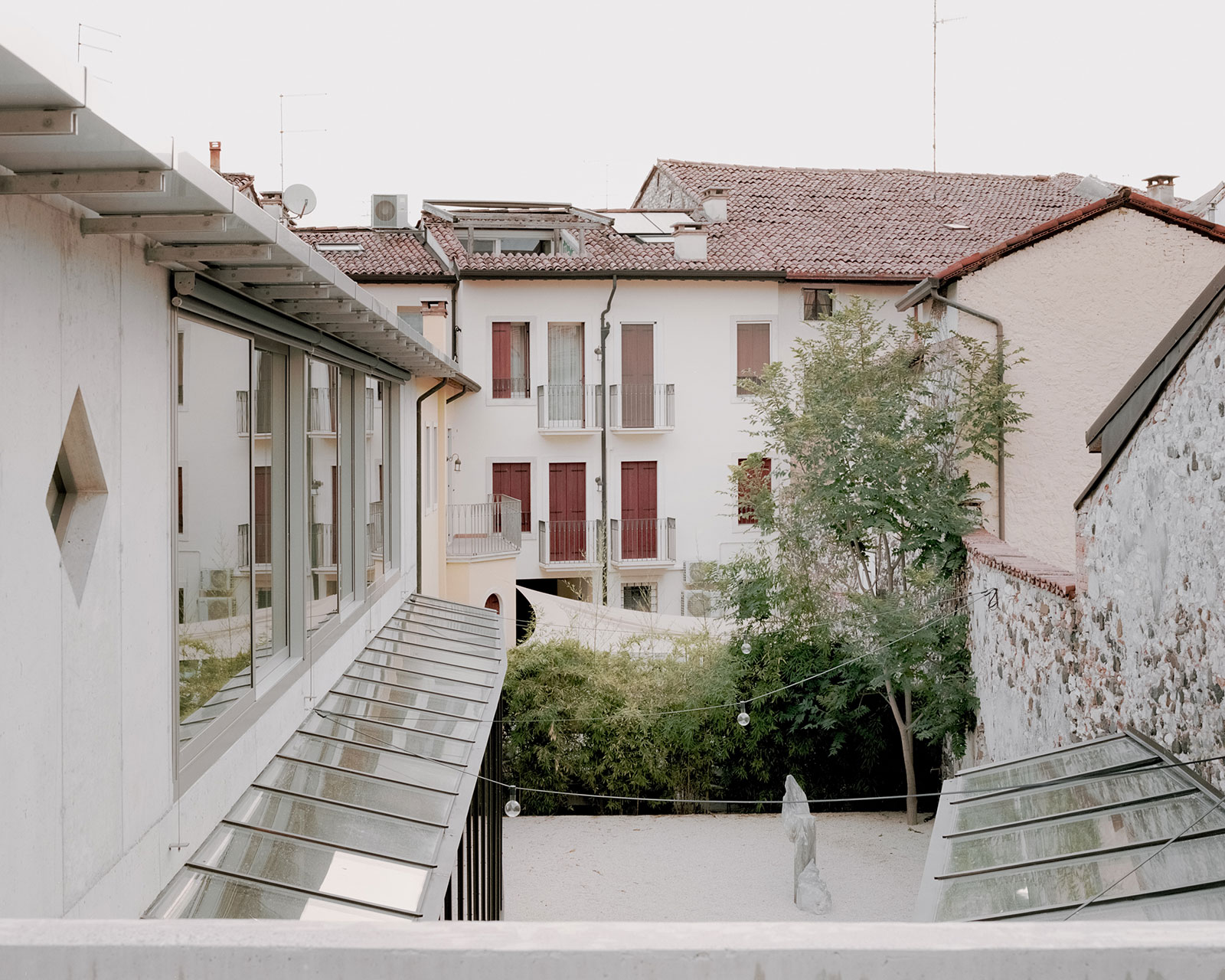 The stair and the beam in reinforced concrete generate an additional mechanism, a three dimensional threshold, the sixth one, which leads to another treasure, the garden. This green space is a sort of “panopticon” from which, among trees, it is possible to lay eyes on a typical Venetian historic center. This point of attraction consists of a questionably complex blending of styles and colors that determine a contemporary tapestry. This setting is itself a work of spontaneous art, defined by the alternation of architectures without architects (as Bernard Rudofsky would say), which contributes to the memory and tradition of the place and, for this reason, should be interpreted with pride.