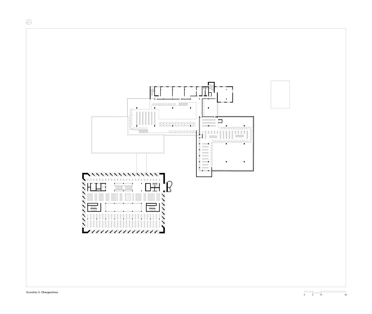 The new building, which roughly adopts the ridge height of the Wilhelmspalais, is set apart from the original building to provide space for a path between the two buildings that enables a link from Urbanstraße to the lower level of the building complex. Urbanistically, the cubic volume of the old reading room, which now occupies the middle of the new plaza, forms a relationship vis-à vis the central projection of the palace across the street. Ample steps establish a connection to the new pavement at street level.