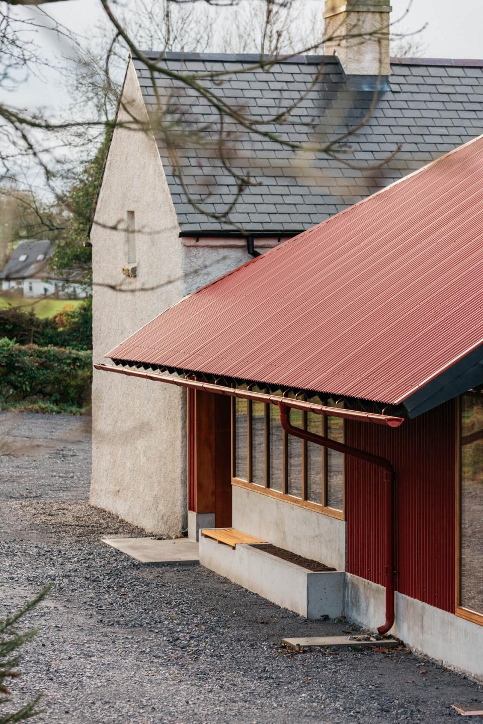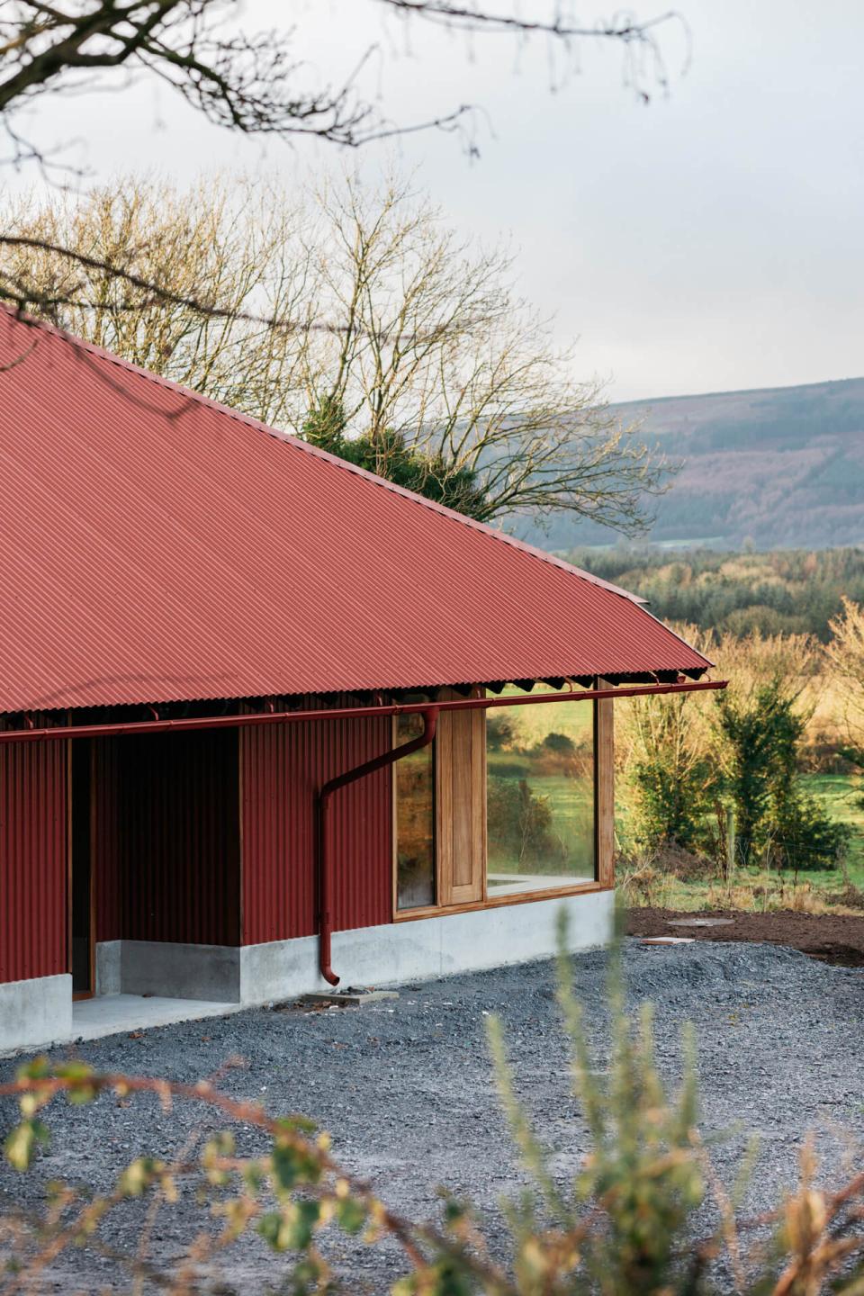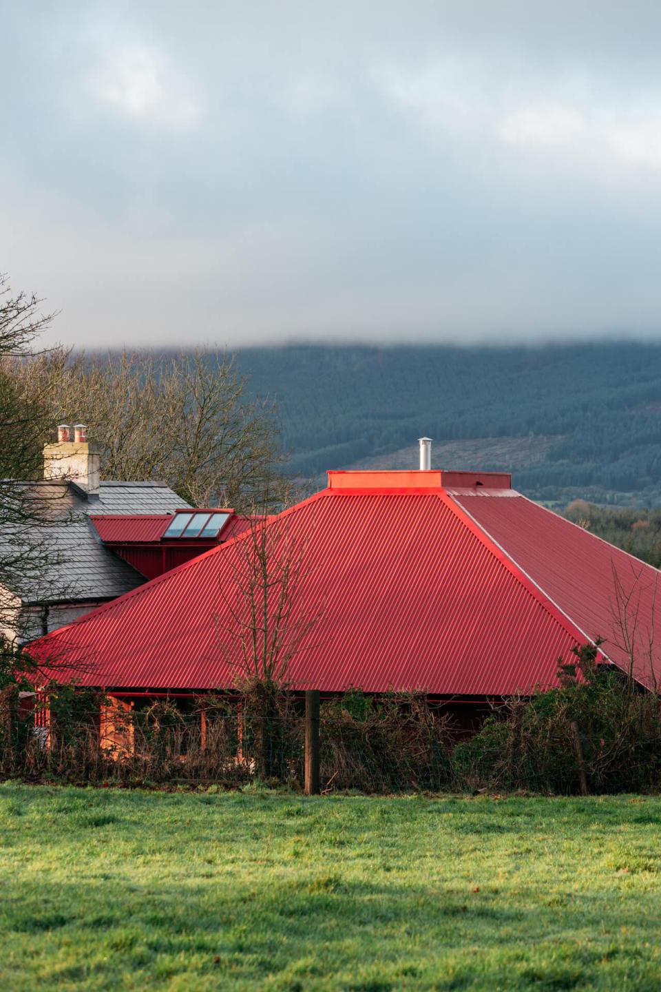 A new extension, which adopts a form and colour similar to the agricultural sheds of the locality, is placed behind the existing house to minimise spatial impact and to open new views to Brandon Hill. This is facilitated with the taking down and rebuilding of one hedgerow (to the rear) and the replanting of two ash trees.