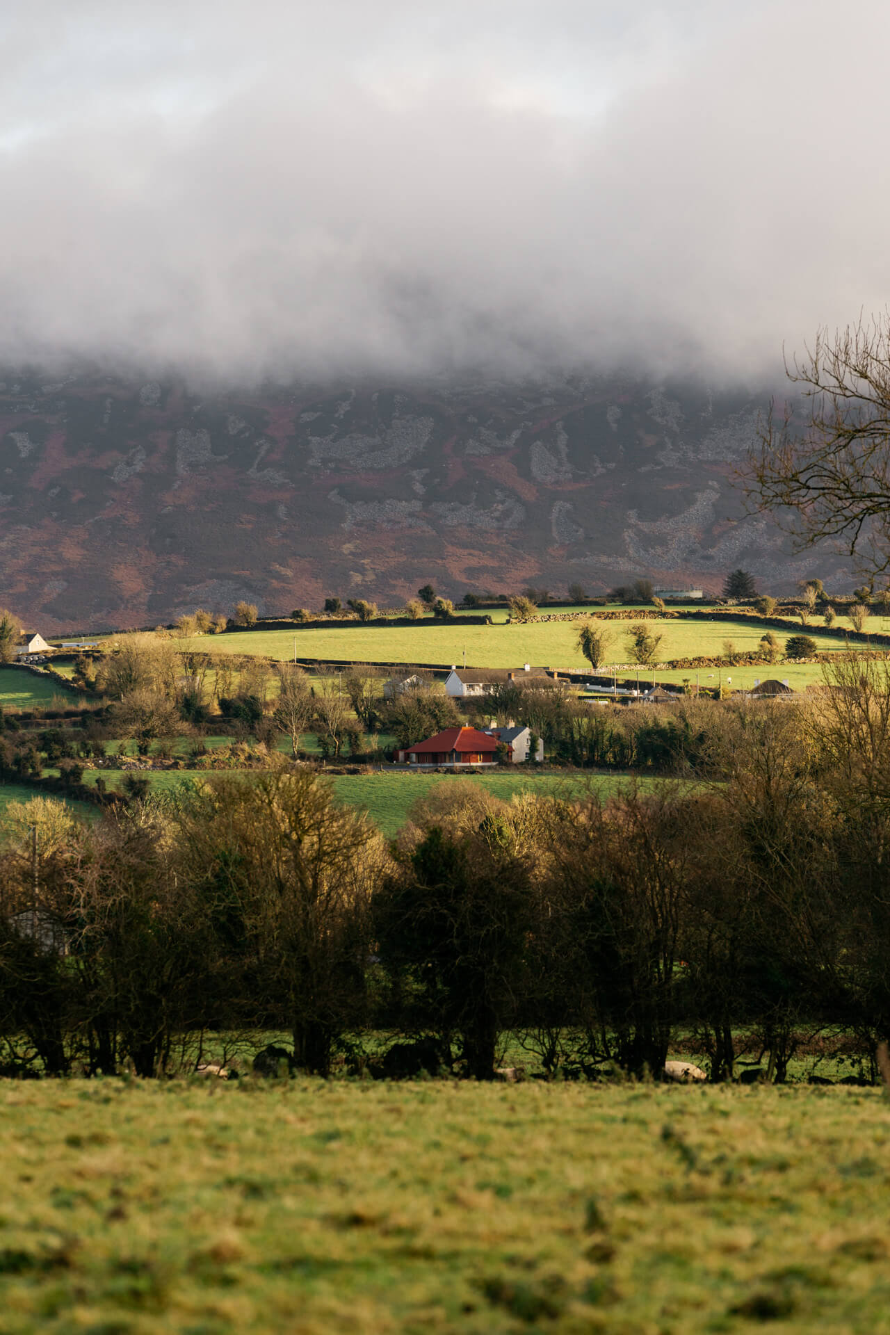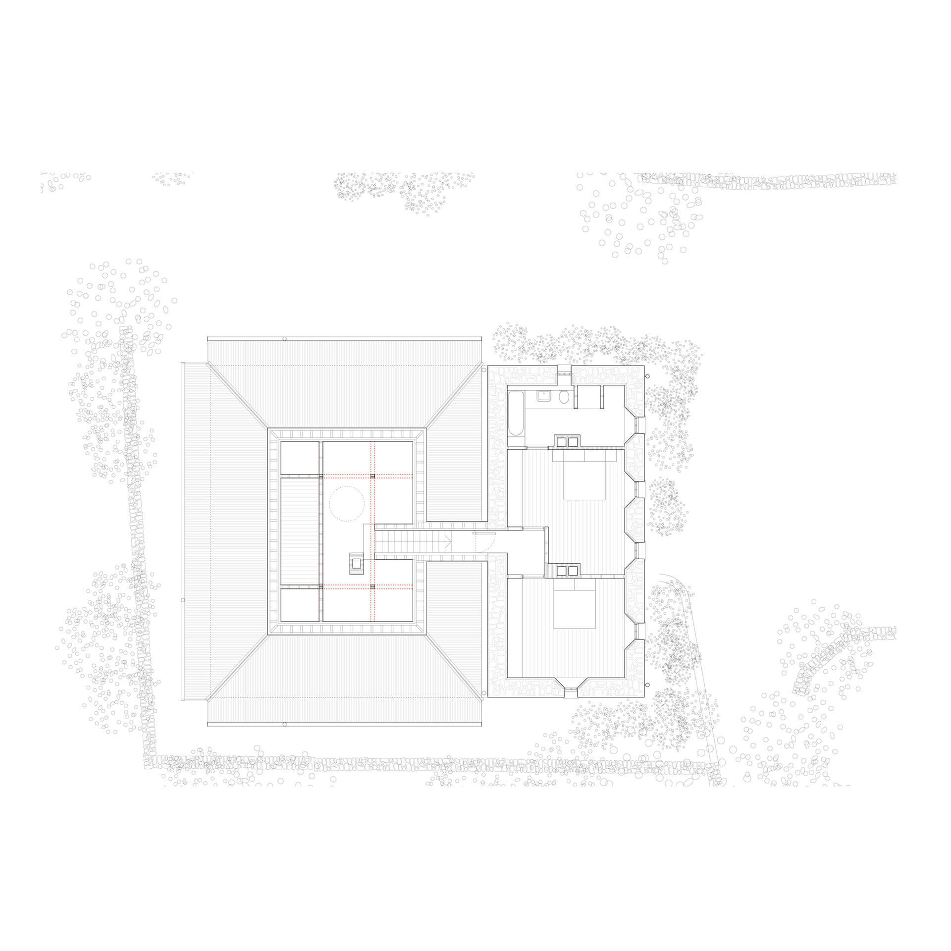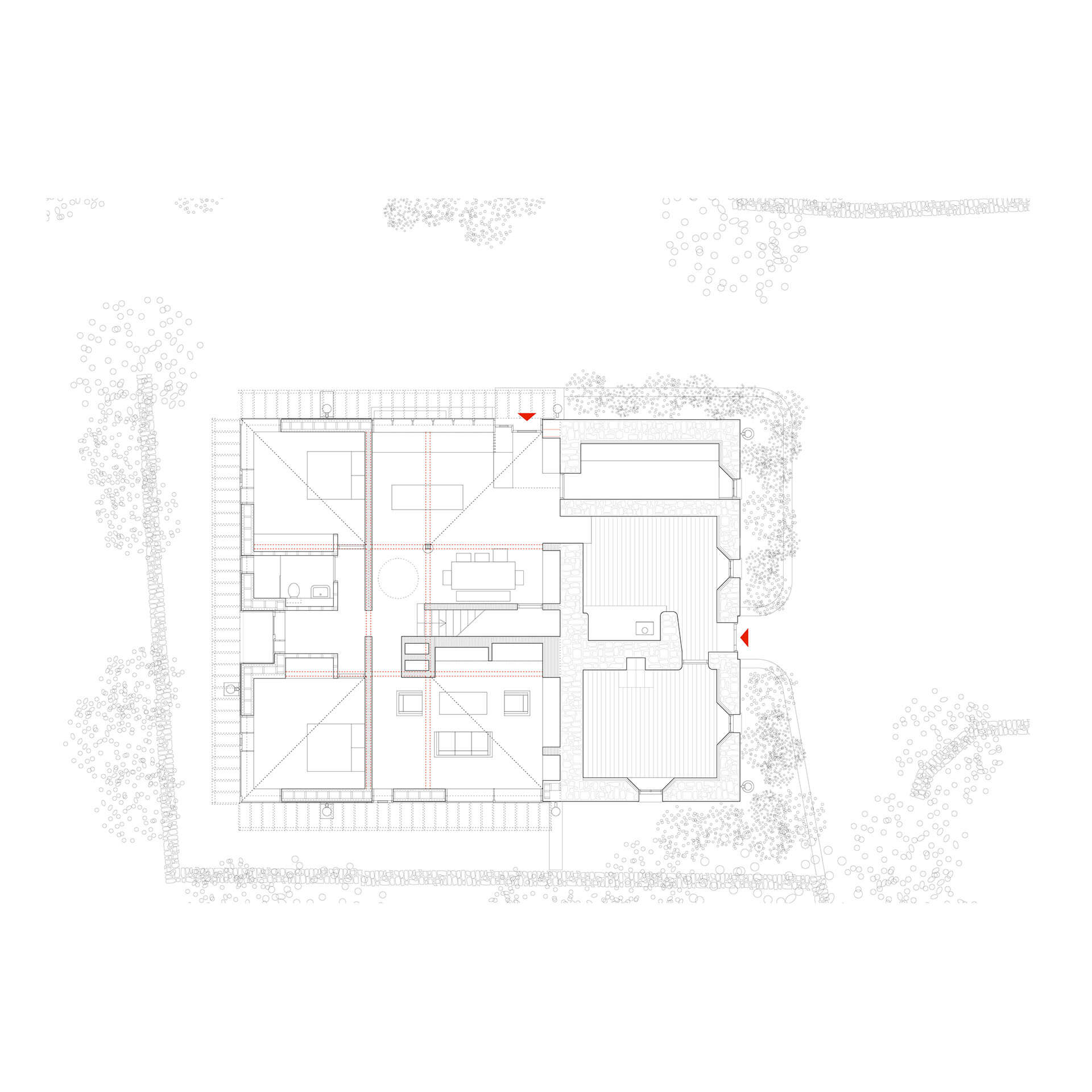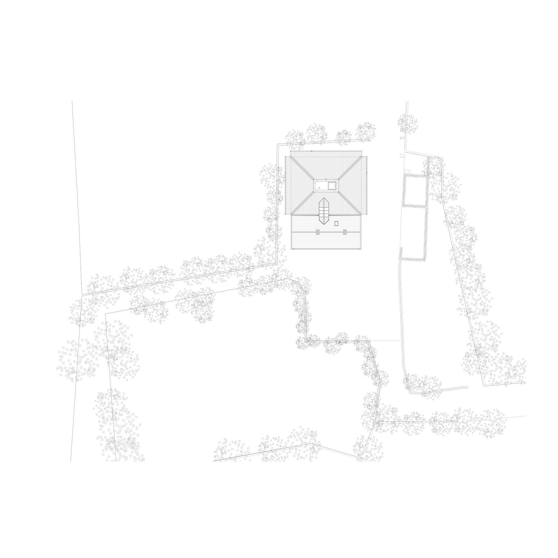 A new extension, which adopts a form and colour similar to the agricultural sheds of the locality, is placed behind the existing house to minimise spatial impact and to open new views to Brandon Hill. This is facilitated with the taking down and rebuilding of one hedgerow (to the rear) and the replanting of two ash trees.