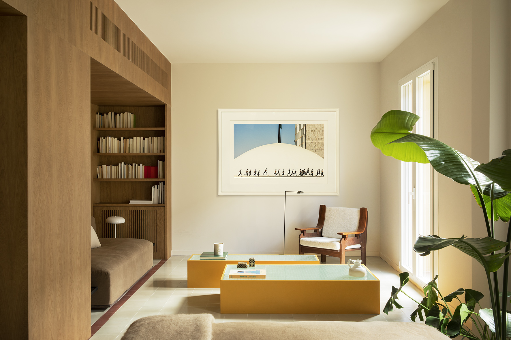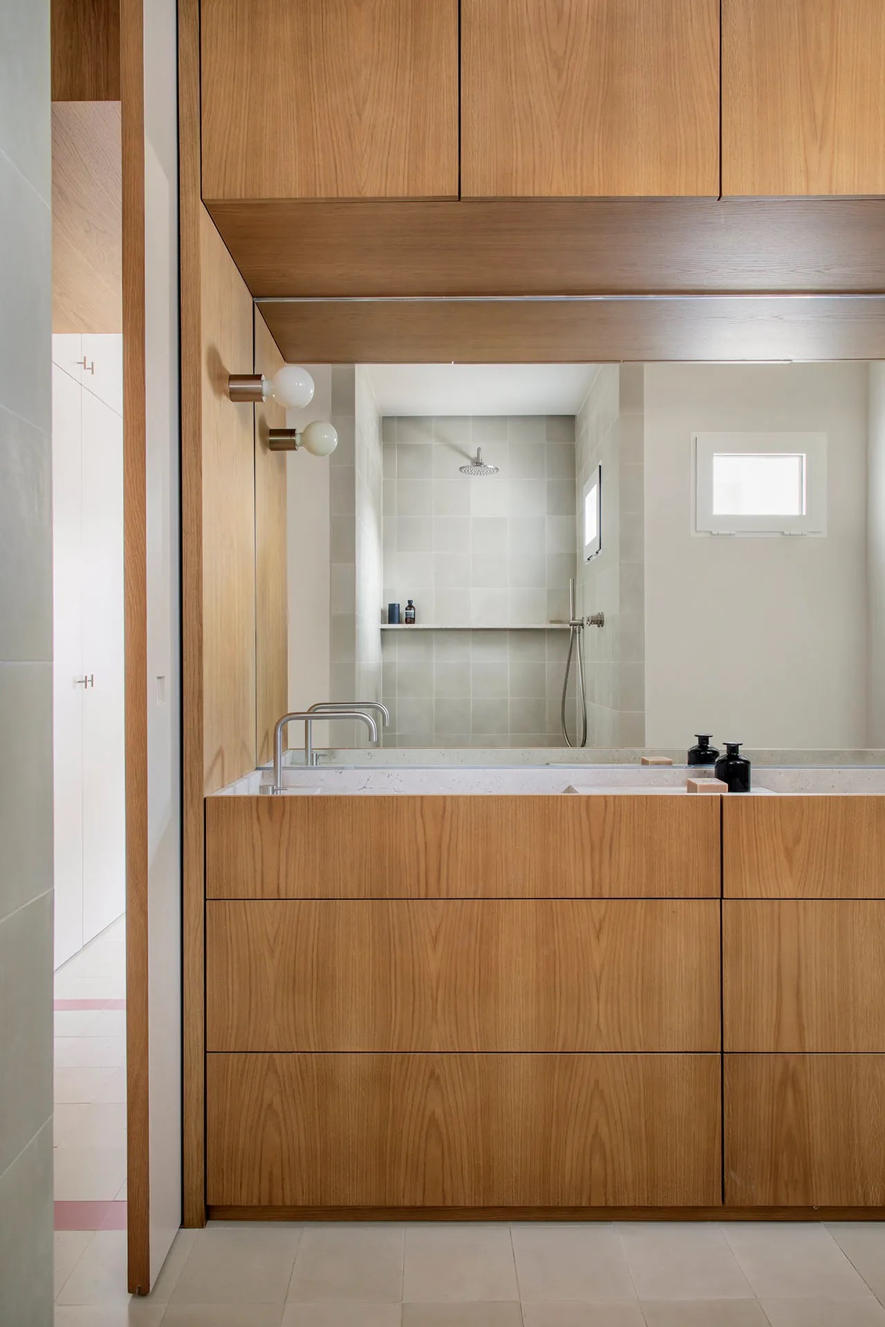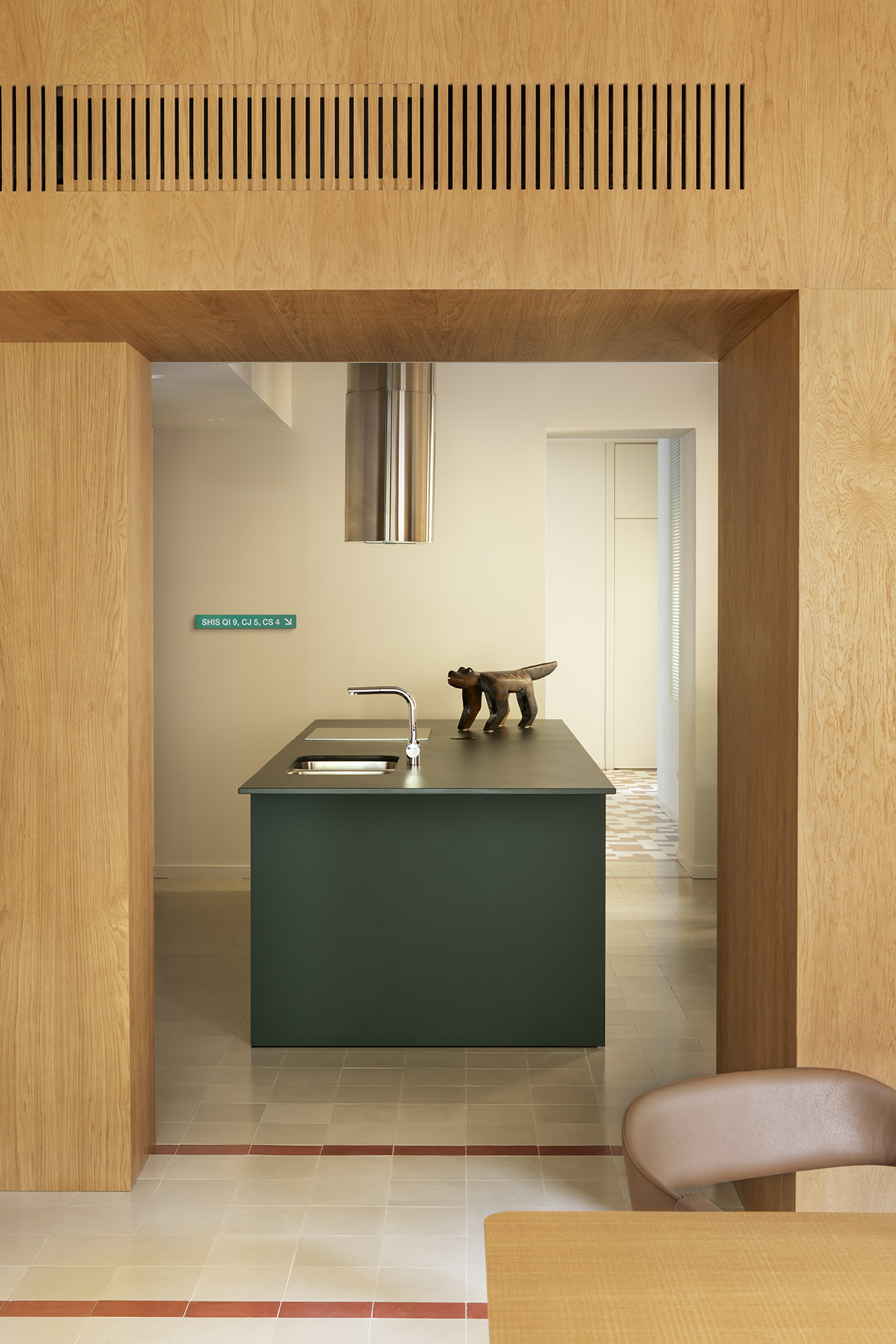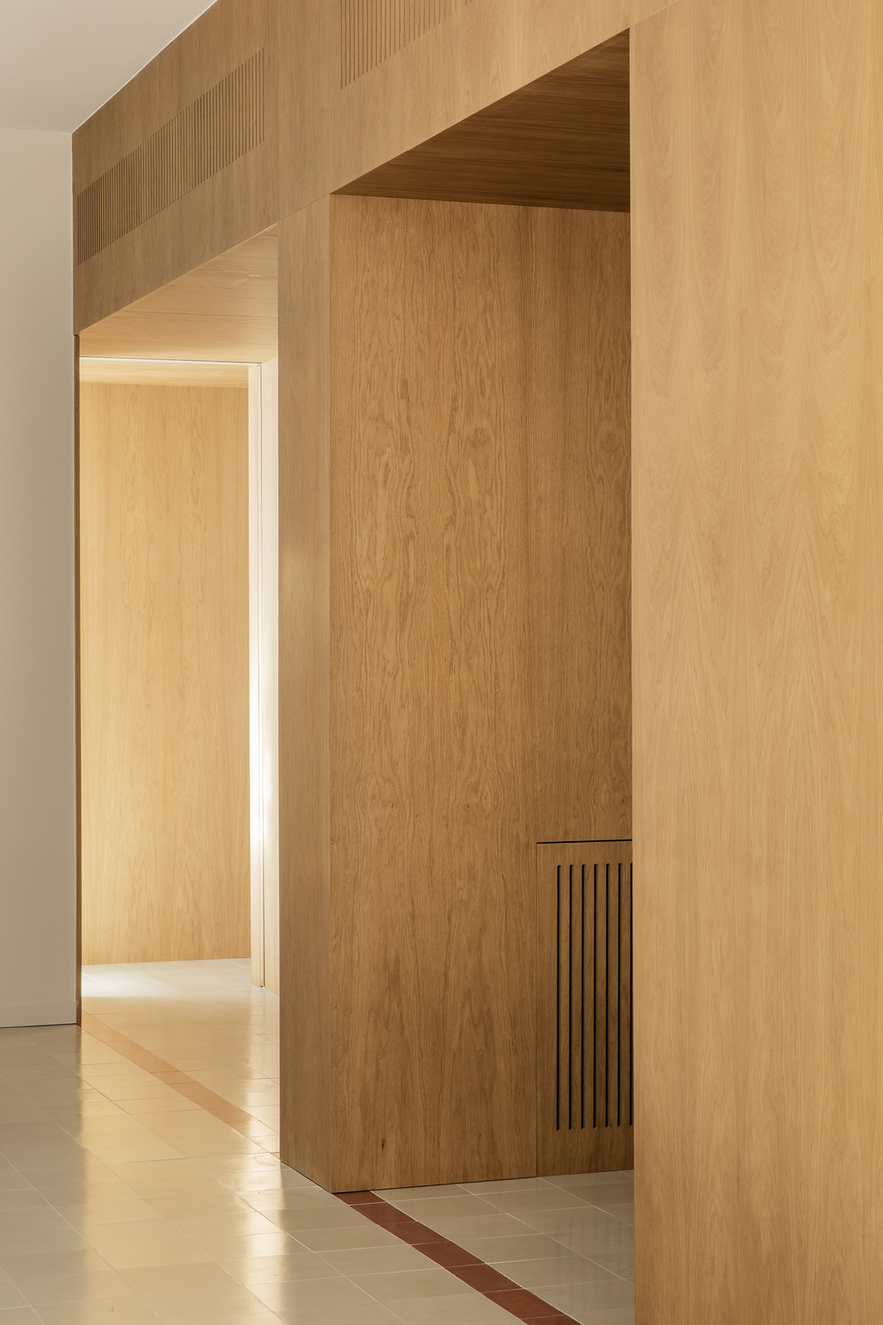 FEC Apartment is a minimal apartment located in Madrid, Spain, designed by Febrero Studio. The Chamberi neighborhood of Madrid has recently seen the completion of a unique apartment renovation project that involved the demolition of the existing structure, save for the original concrete pillars. The designer’s approach involved a central module that would house all the heating and air conditioning installations, as well as the vertical elements of the structure. This wooden module, acting as a multifunctional piece of furniture, serves to expand the living area by accommodating the sofa, conceal access doors to other spaces, act as a divider between the kitchen and living room, and even house the master bathroom sink. To highlight its importance, the module was crafted mainly from wood, which also helps to enhance its volume and define its shape within the pavement. Despite the need to replace the worn hydraulic tile floor, the designers opted to maintain the same style of flooring throughout the entire apartment, given its original type and the period in which it was constructed.