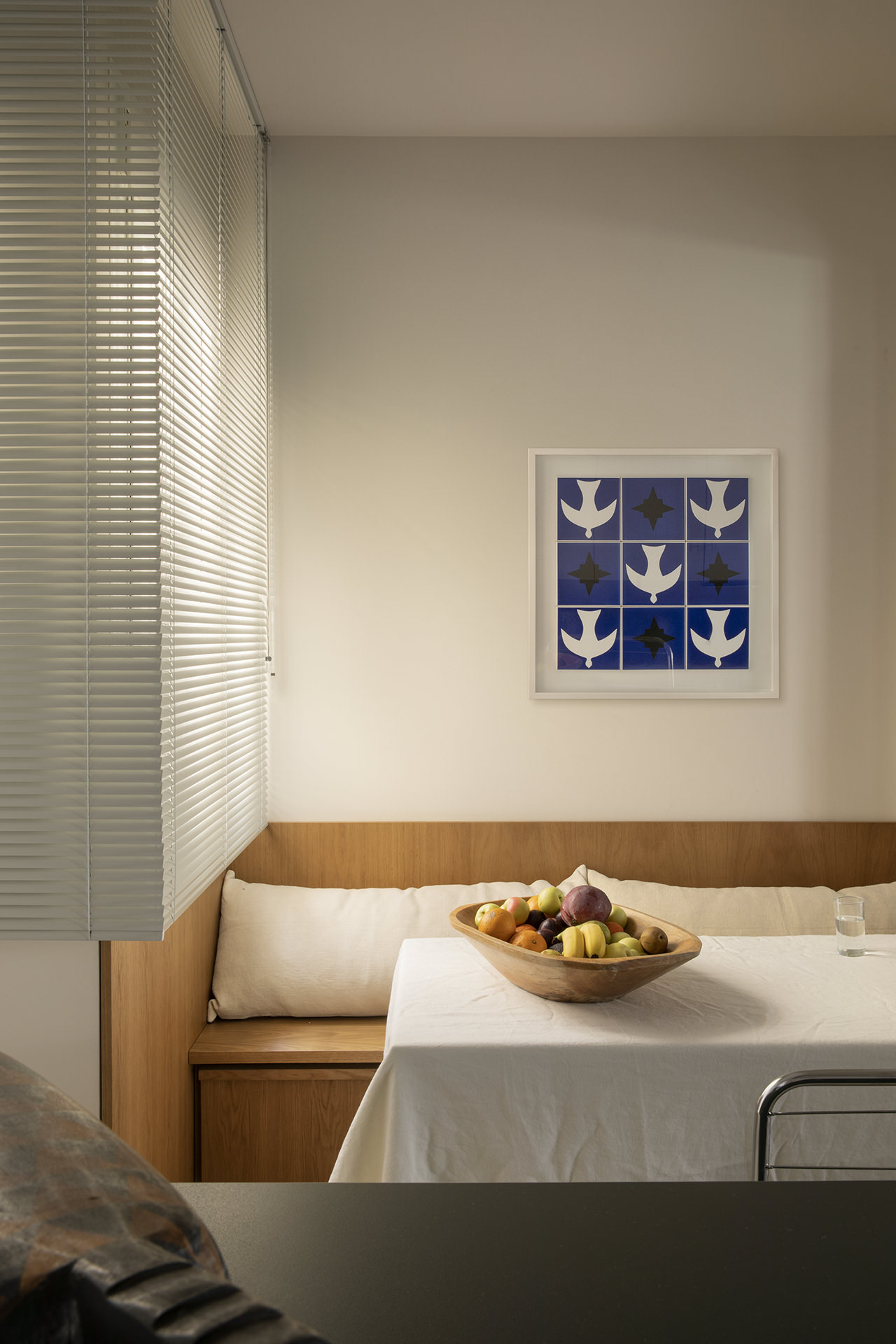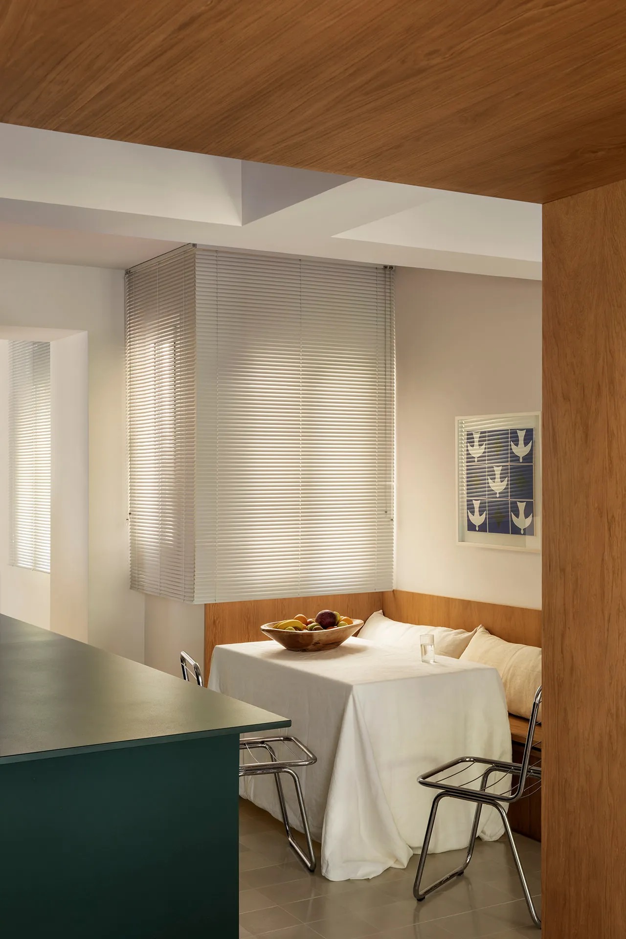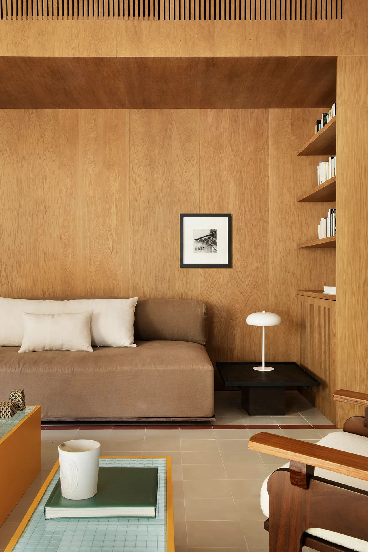 다기능 가구 역활을 수행하는 목재 모듈은 소파공간을 코지하게 만들어서 거실을 확장시킵니다. 그리고 다른 공간으로 통하는 출입문을 숨기는 기능뿐만 아니라 주방과 거실을 구분하는 구분자 역활도 수행한다. 마스터 욕실 세면대 또한 목재 모듈에 포함됩니다.