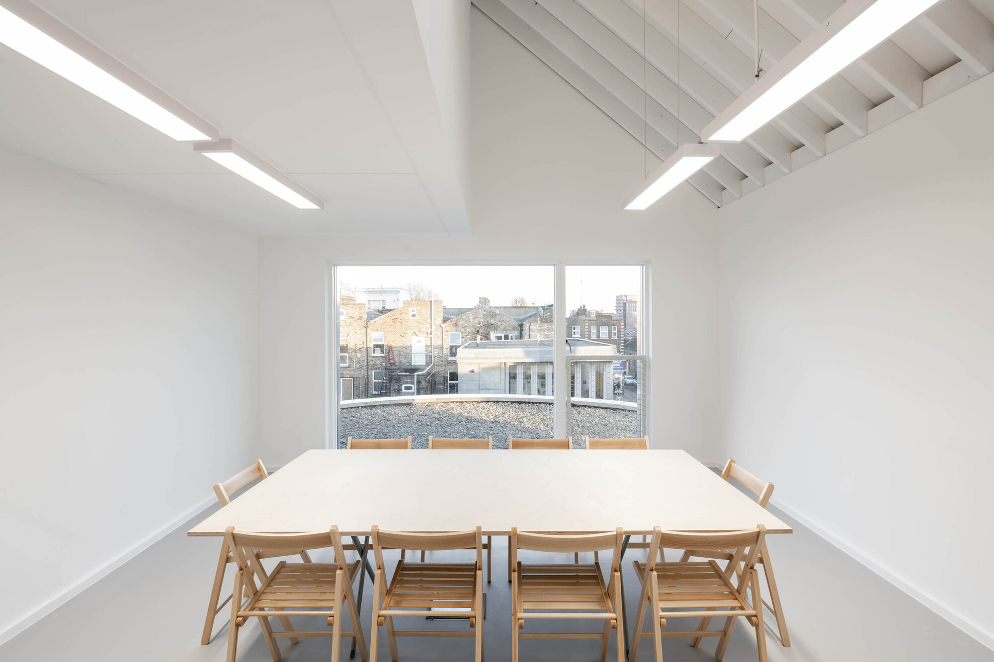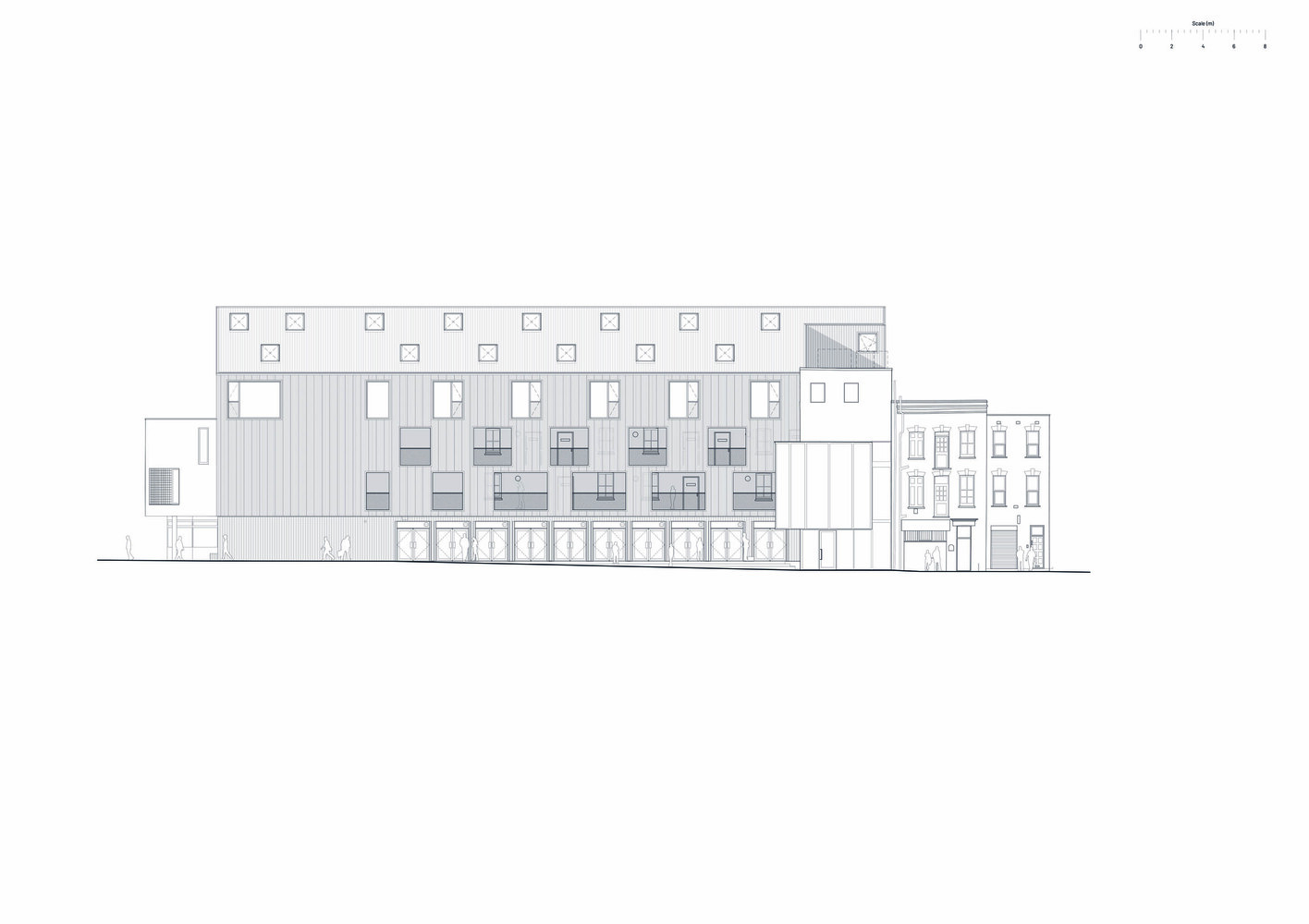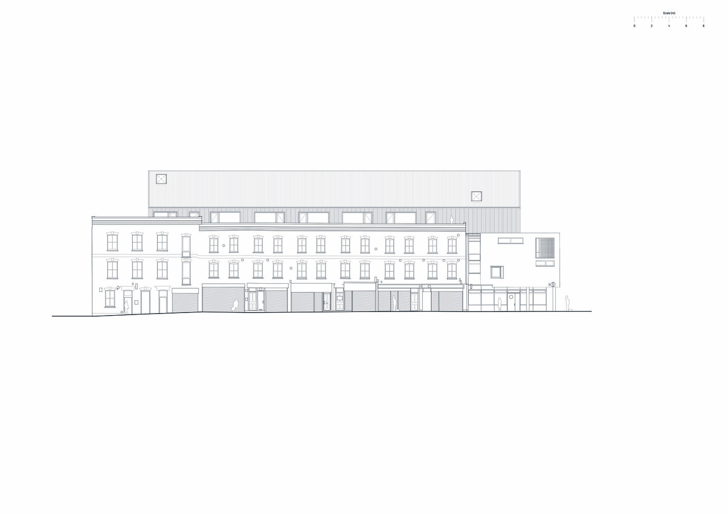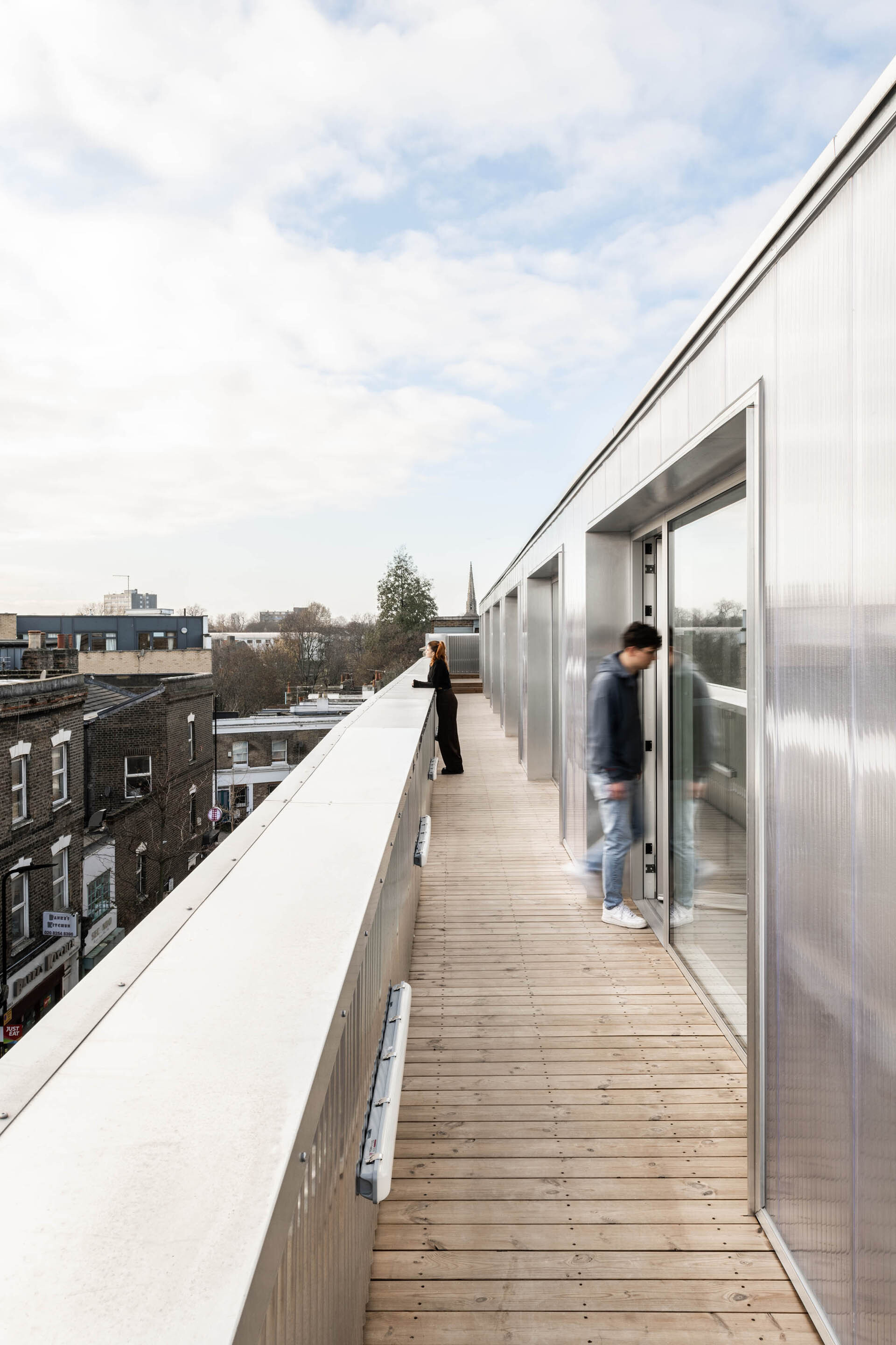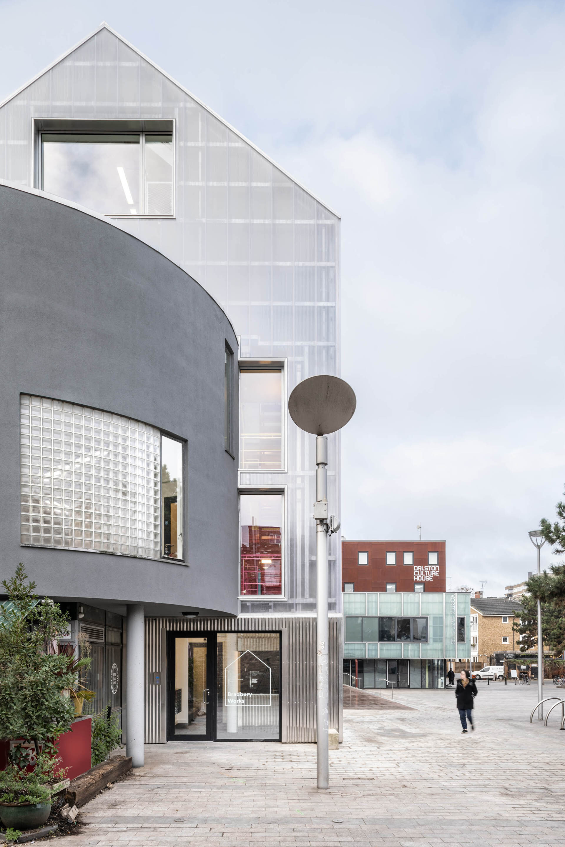 The original masonry structure of the existing Victorian terrace has been retained, refurbished, and renovated, providing small and medium 1036m2 workspace units while preserving the existing shops, bars, and restaurants facing onto Bradbury Street. A covered double-height external terrace space provides access to the upper units. Picnic tables, evergreen ferns, and climbing plants intend to encourage tenants to come together in all seasons and increase interaction with the square. On the third floor, new workspaces with private mezzanine levels in the pitch are accessed by a south-facing external deck.