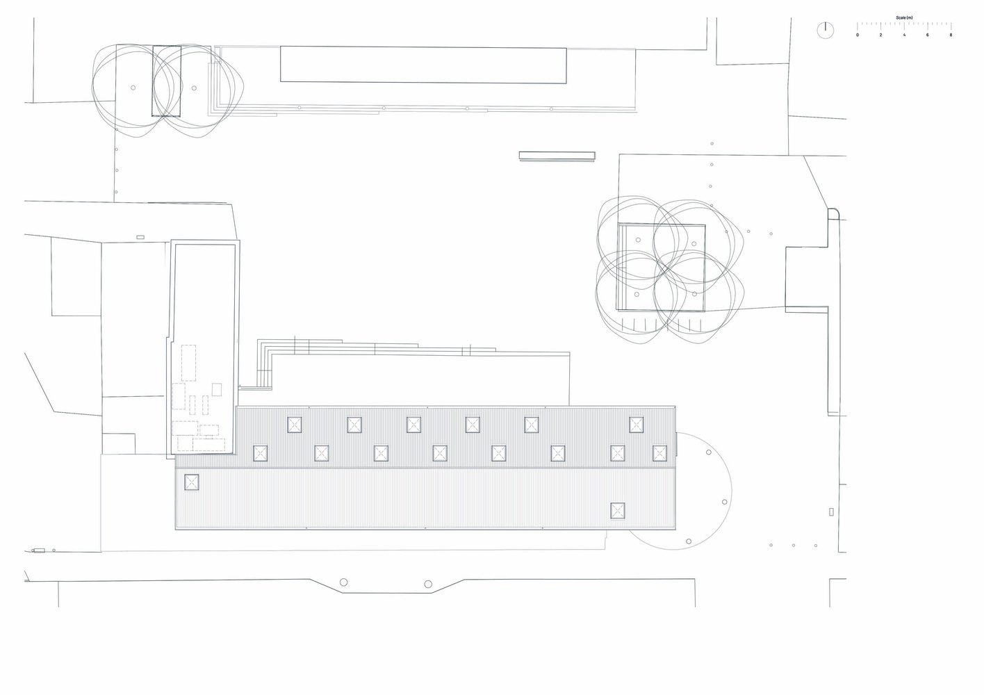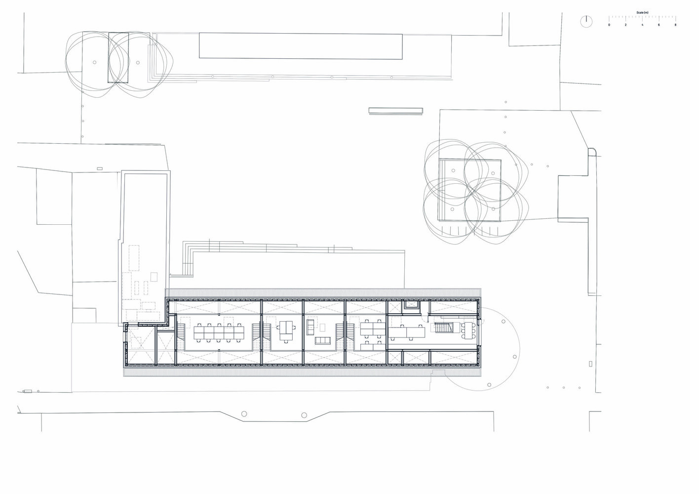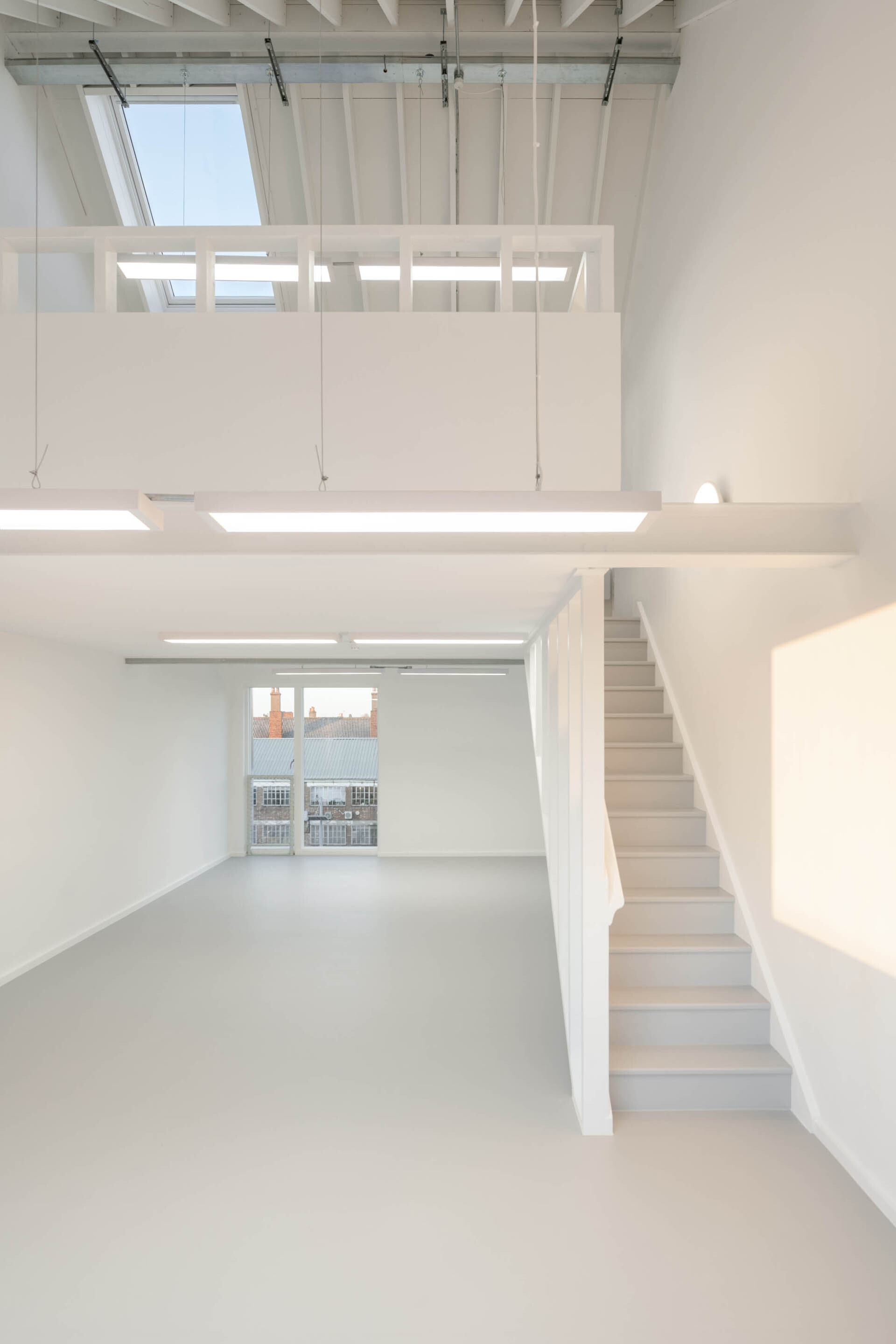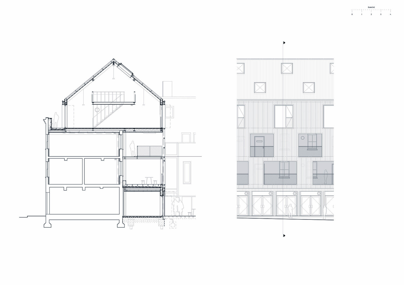 The original masonry structure of the existing Victorian terrace has been retained, refurbished, and renovated, providing small and medium 1036m2 workspace units while preserving the existing shops, bars, and restaurants facing onto Bradbury Street. A covered double-height external terrace space provides access to the upper units. Picnic tables, evergreen ferns, and climbing plants intend to encourage tenants to come together in all seasons and increase interaction with the square. On the third floor, new workspaces with private mezzanine levels in the pitch are accessed by a south-facing external deck.