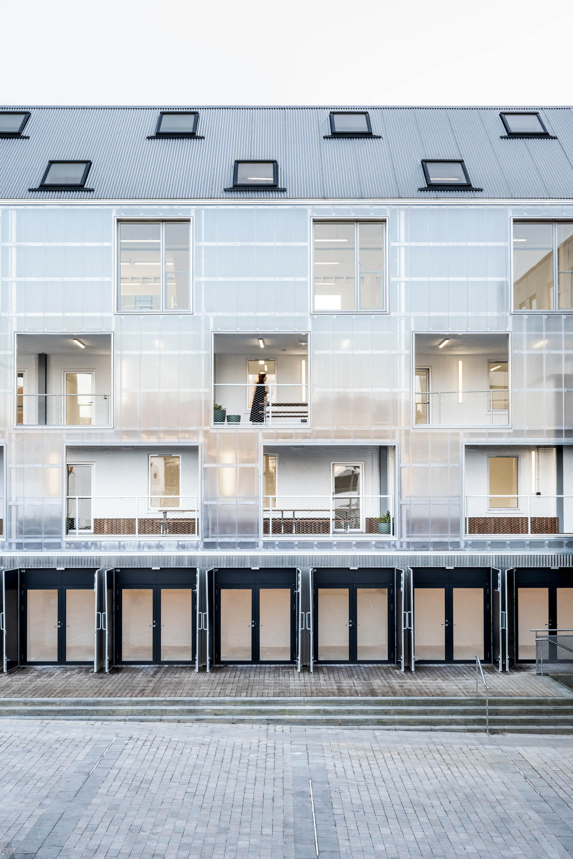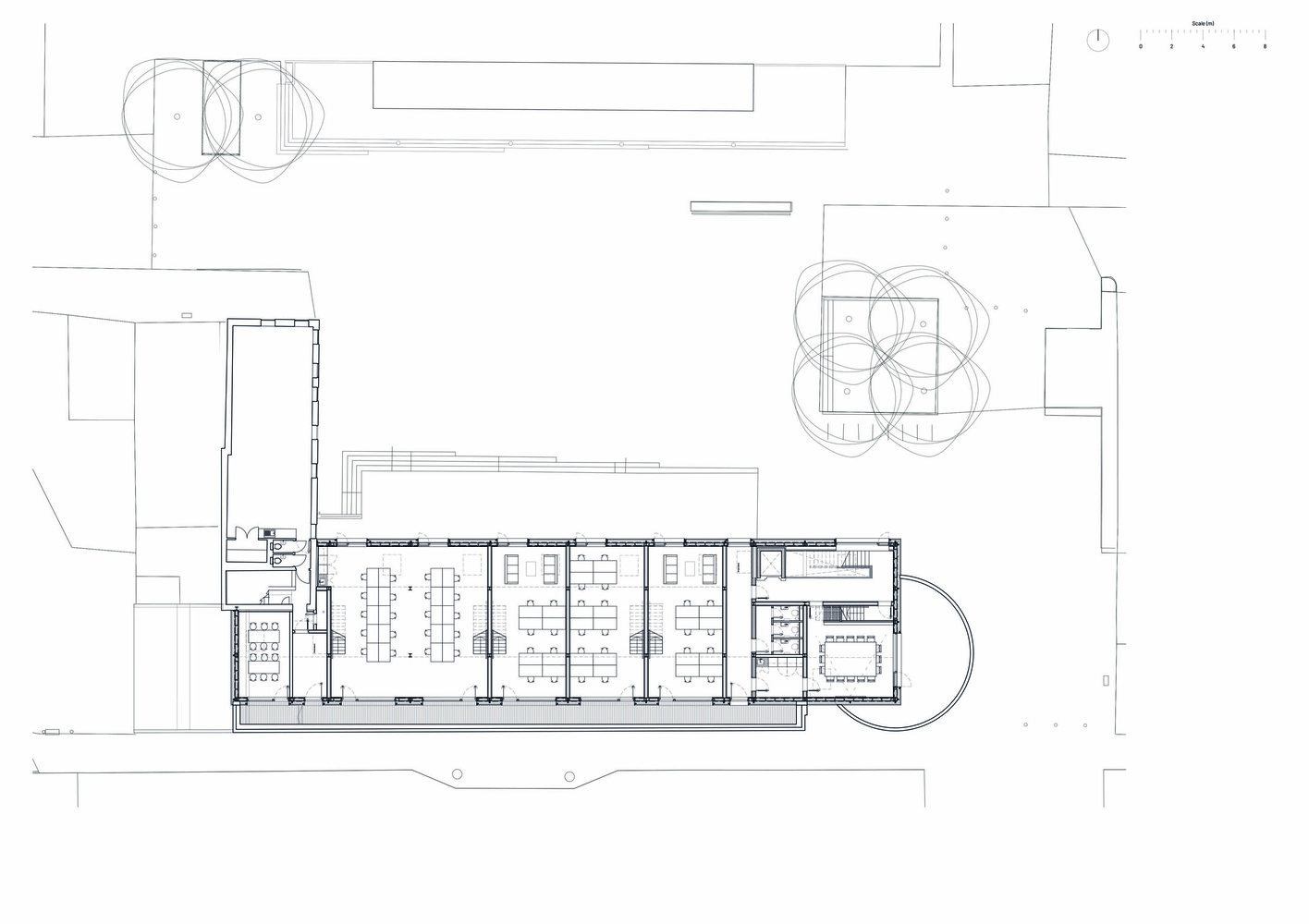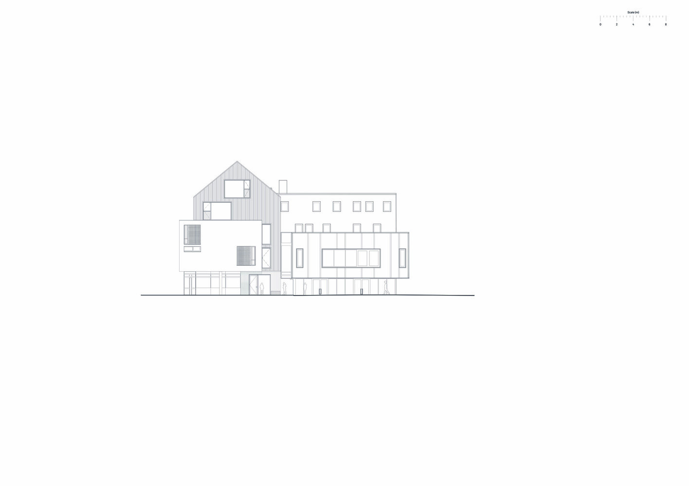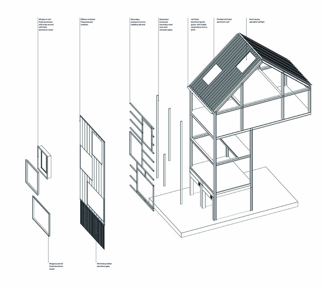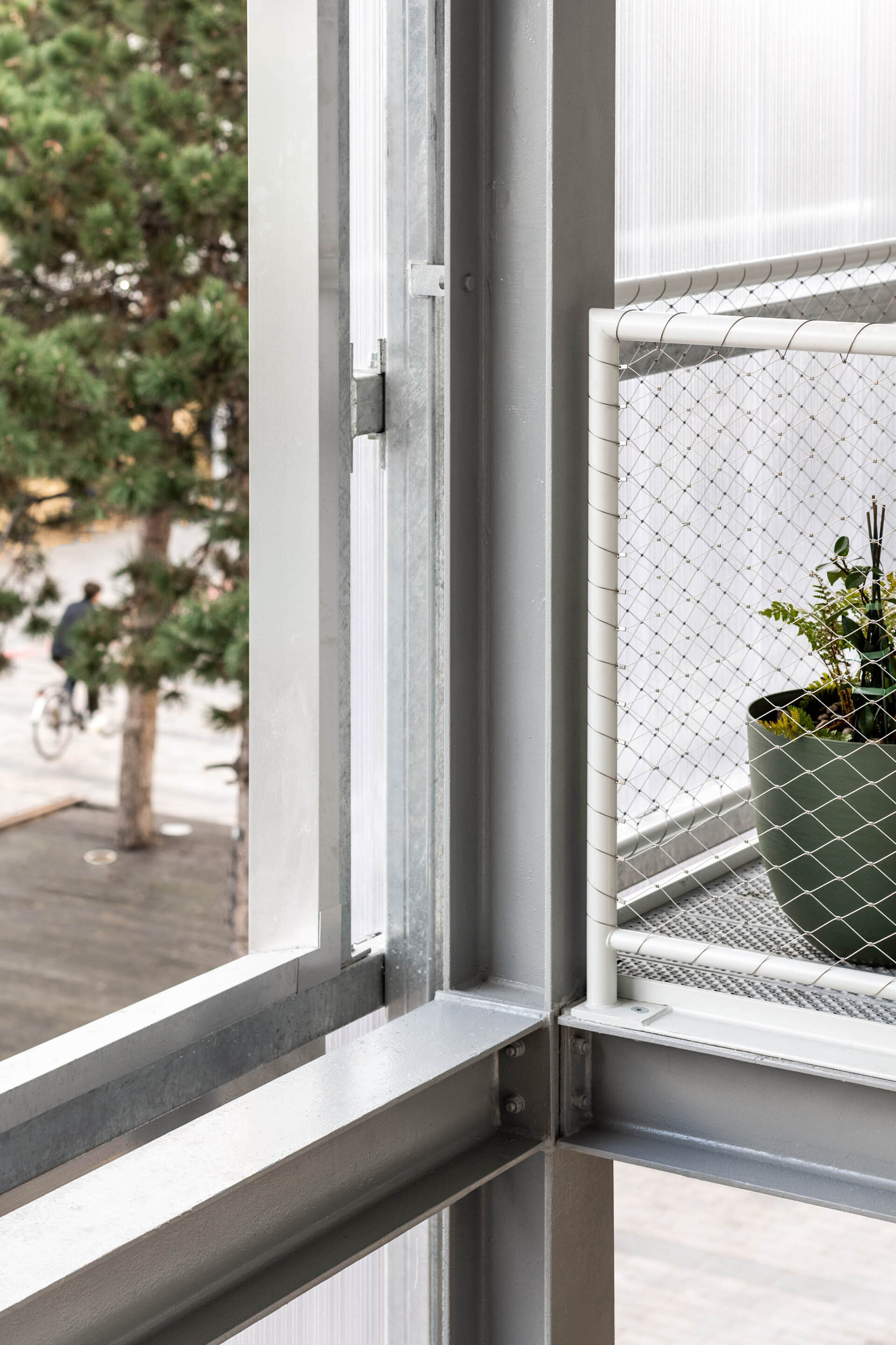 The original masonry structure of the existing Victorian terrace has been retained, refurbished, and renovated, providing small and medium 1036m2 workspace units while preserving the existing shops, bars, and restaurants facing onto Bradbury Street. A covered double-height external terrace space provides access to the upper units. Picnic tables, evergreen ferns, and climbing plants intend to encourage tenants to come together in all seasons and increase interaction with the square. On the third floor, new workspaces with private mezzanine levels in the pitch are accessed by a south-facing external deck.