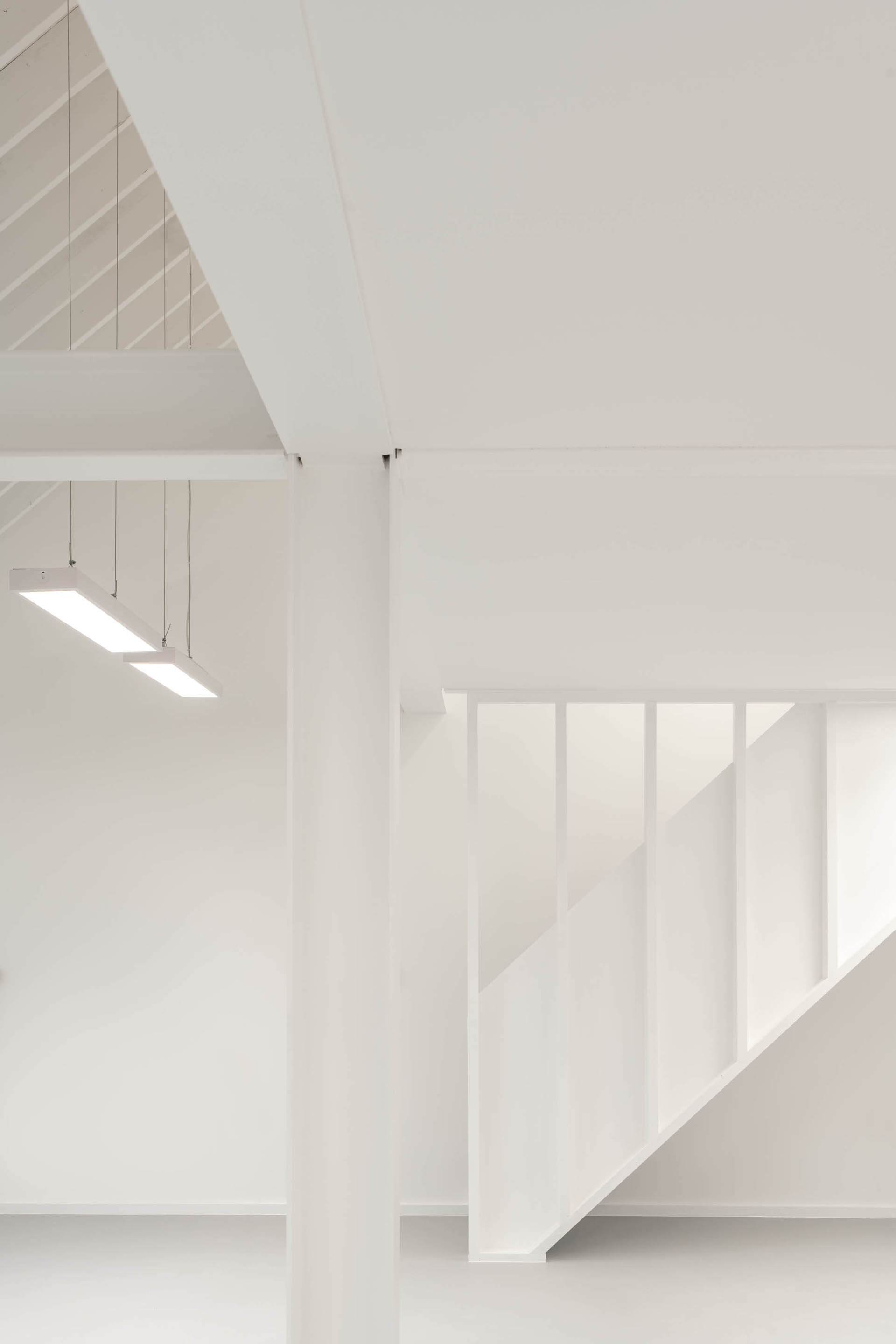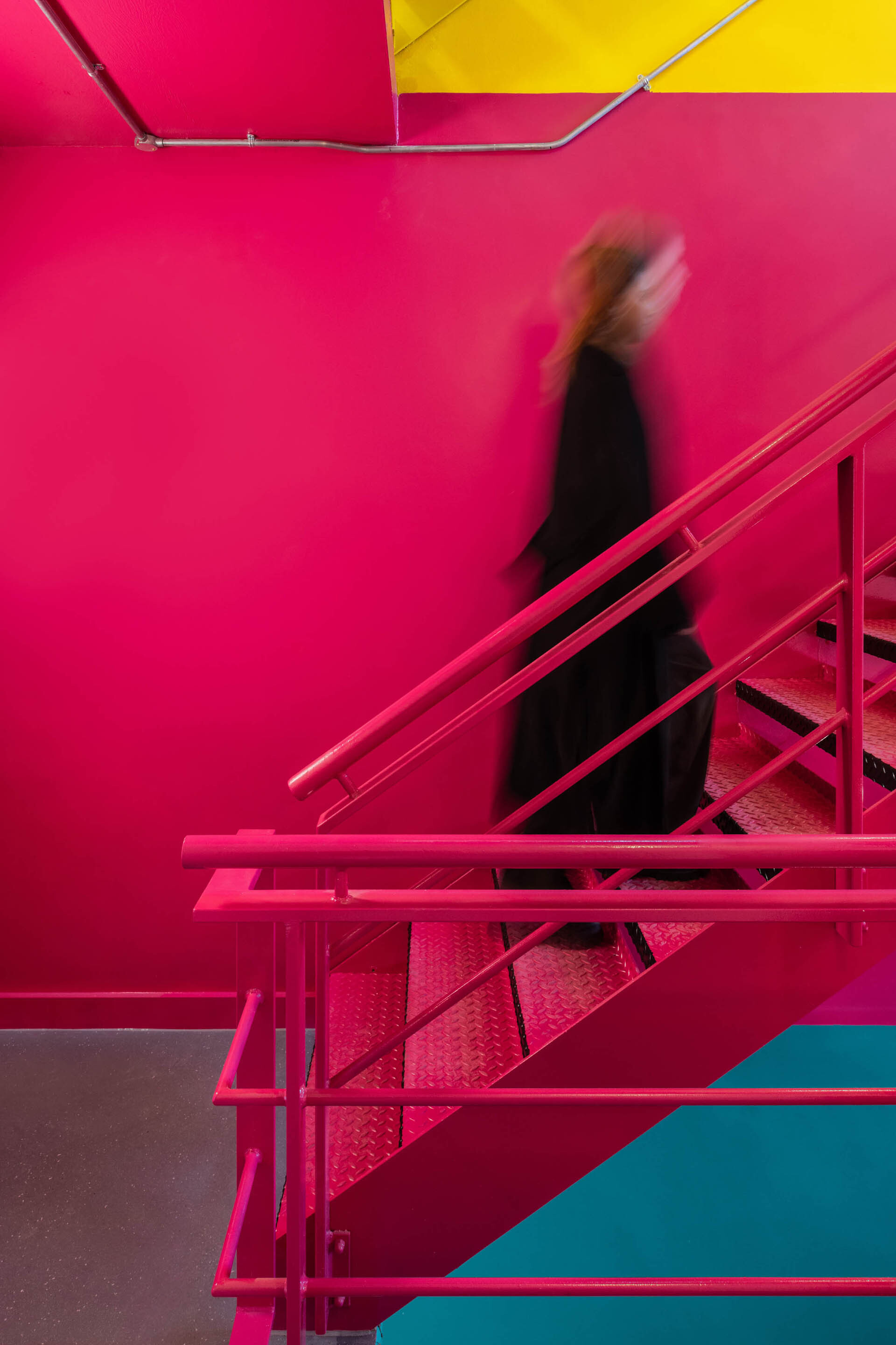 Access to the new building is via the existing entrance which has been retained and improved by providing a new fully glazed entrance. New branding and wayfinding signage was designed by [Y/N] Studio. The existing stairwell and entrance have been repainted with the colors Cyan, Magenta, Yellow, and Key (black) referring to the ‘CMYK’ printing color range where four simple and contrasting colors combined can be used to create any artwork.