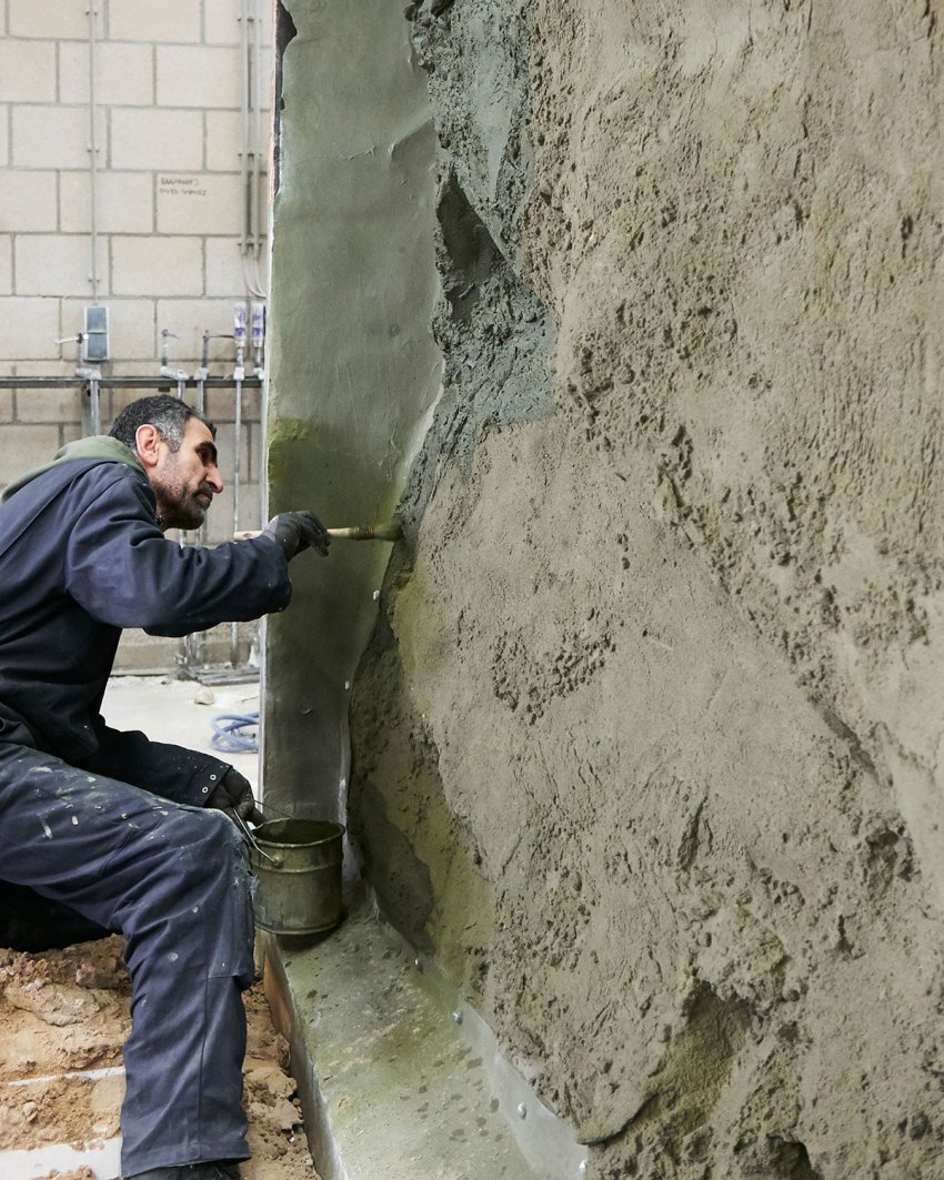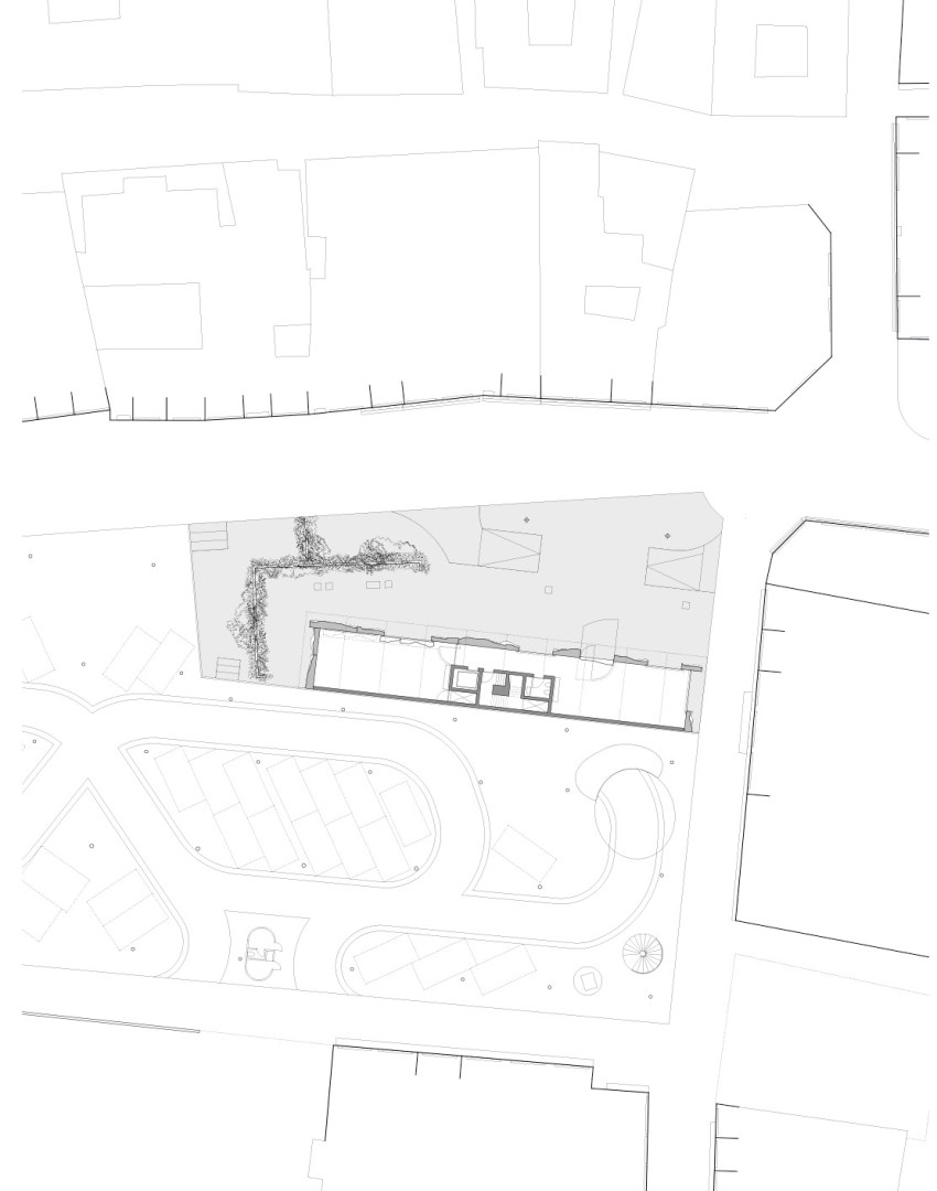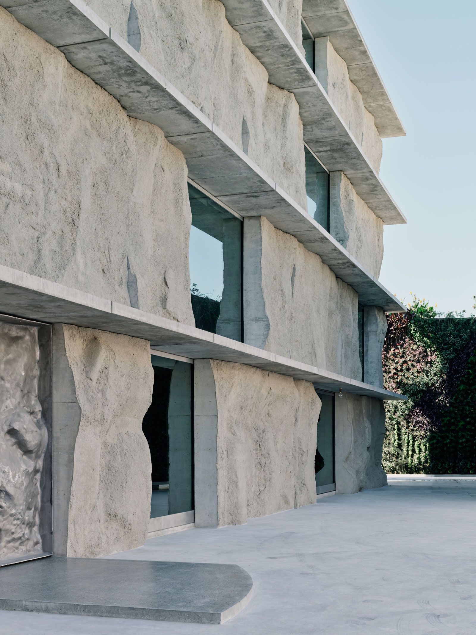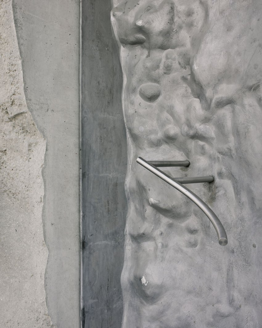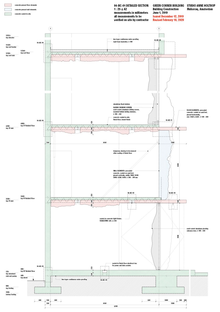 The Green Corner building features a floor plan consisting of two identically sized rooms and a core in between, with a very shallow depth that emphasizes the main facade as the primary spatial element. The facade itself is made of sand-casted structural wall elements with a strong relief, adding a unique touch to each element cast on the ground next to the building. This technique creates a geological cut in the ground at the positions of the windows and the corners of the building, adding to its aesthetic appeal.