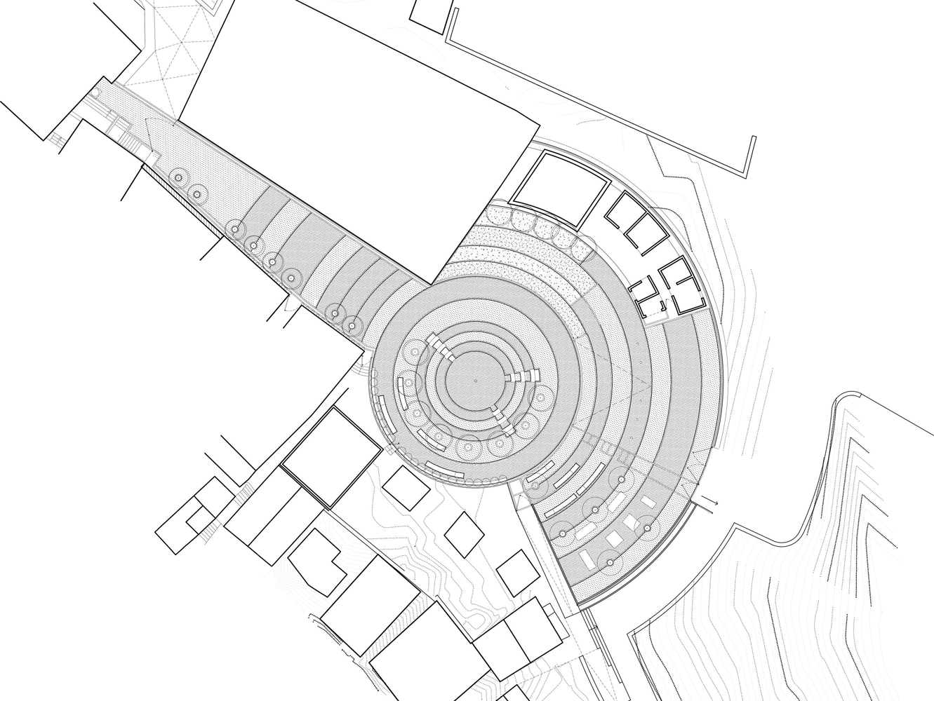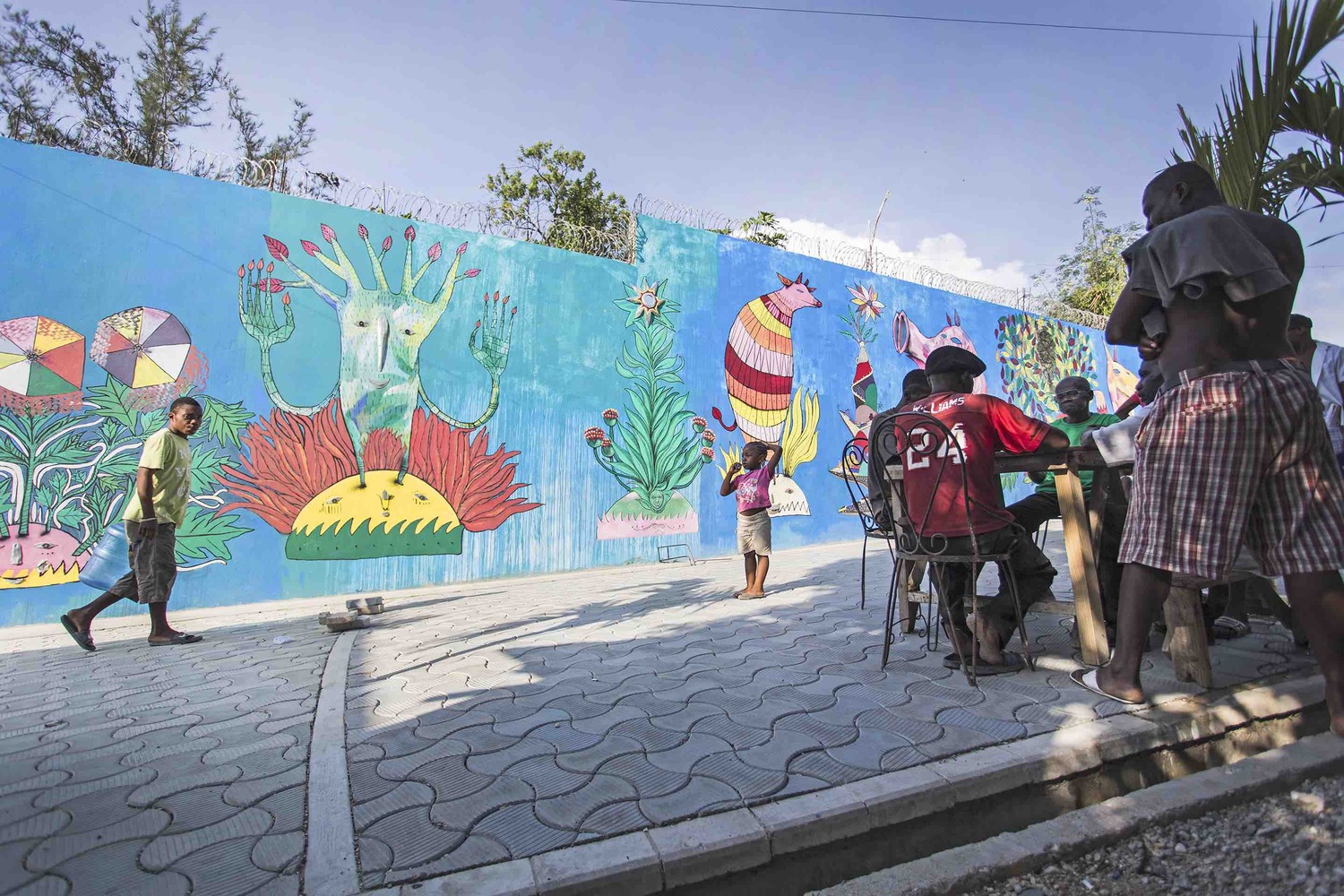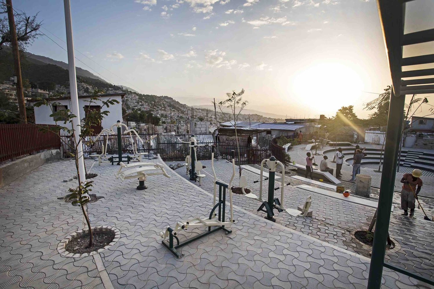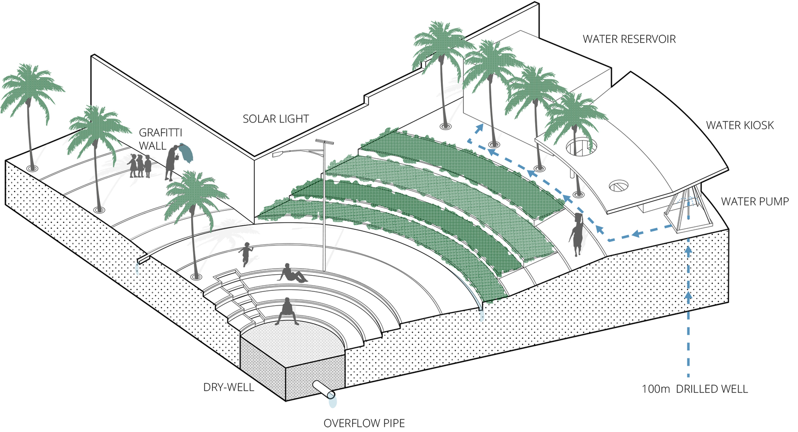 The program and the architectural design have been established directly with the community. An open air amphitheatre, intended for community gathering, marks the centre of the space. Dotted around the edges of the seating-steps are several Flamboyant’s that, when fully grown, will shelter the users from the sun. The concentric rings beyond define areas within the plaza. One, is occupied by outdoor exercise equipment and seating. In another one, near the wall, the locally-made blue pavers give way to terraces of greenery, each with different plants. Above it, by the top end, a row of palm trees conceals storage tanks for the adjacent water distribution station. The well that feeds the tanks and station brings water from 100m below ground. The revenue generated from the sales of water will be reinvested into maintaining the public space.