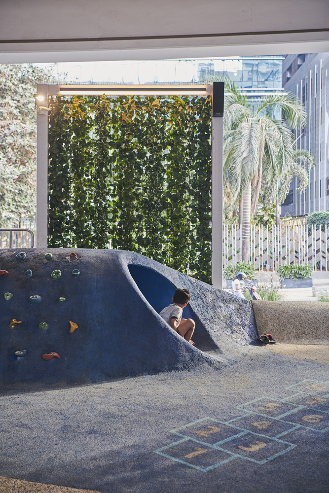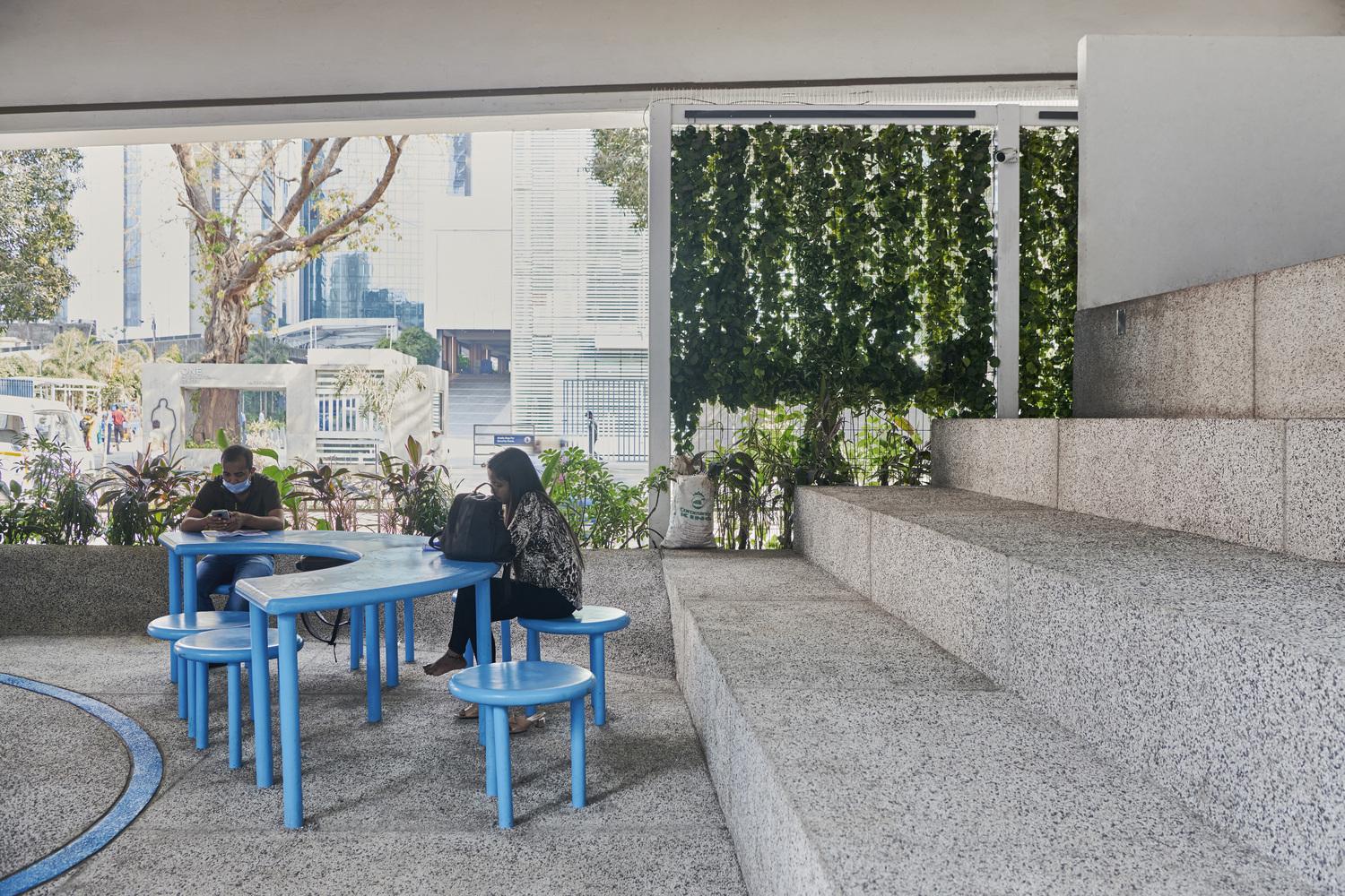 A hilly paved landscape transforms the 2 dimensional visual features into a 3D spatial experience, accommodating a whole range of different programs and providing a dynamic physical attraction. Visual accent colors in materials and graphics make all aspects of the intervention recognizable as a whole. The space is divided into a series of public “rooms” with diverse functions: lounge, gym, shaded seating area, performance space, and reading room. Planting extends throughout the space. Greenery in the design – featured on a series of screens lining the space, an archway at the entrance, and in retaining walls and planters – promotes biodiversity, while cooling the surrounding spaces and dampening noise pollution.