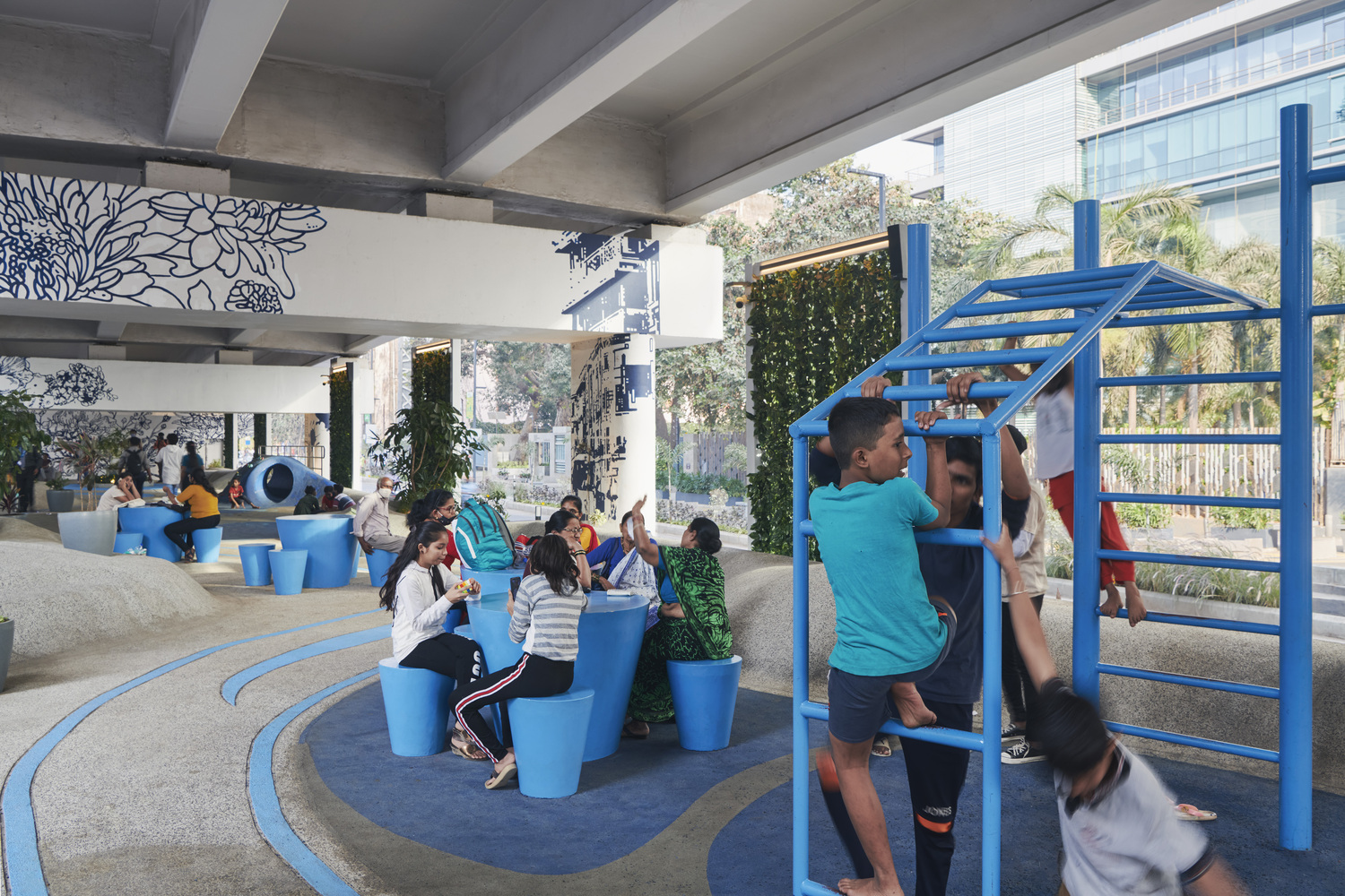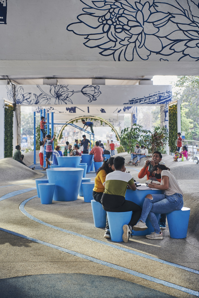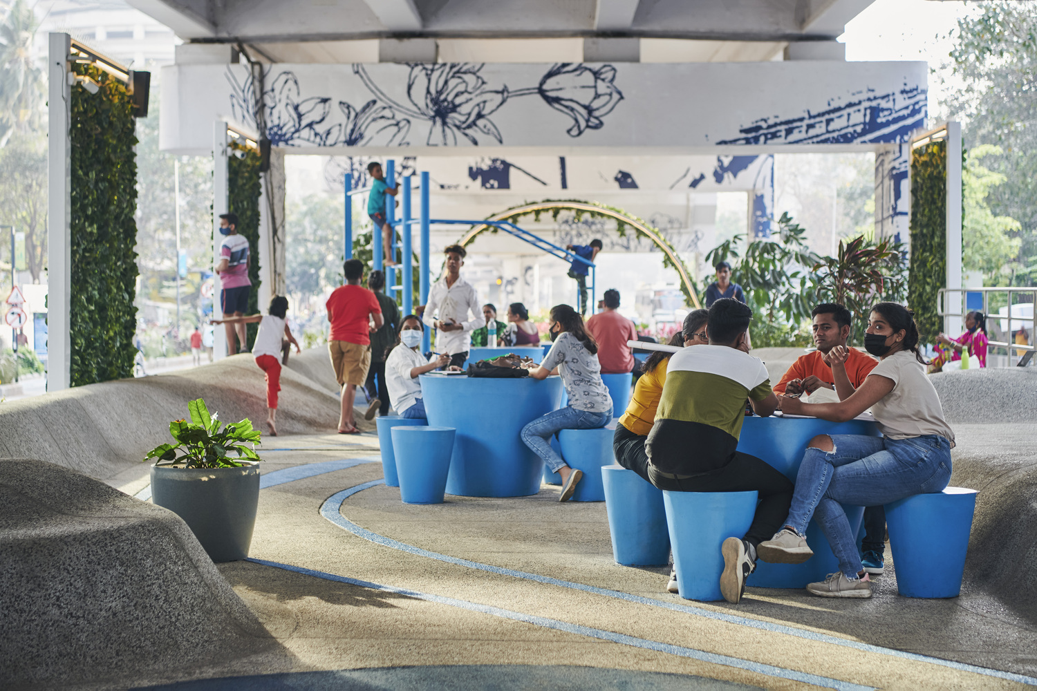 MVRDV, working alongside co architects StudioPOD, has completed the construction of a section of One Green Mile, transforming a series of neglected spaces below Mumbai’s Senapati Bapat Marg flyover. Turning an overbearing element of concrete infrastructure into a public space for the entire local community, the design adds much-needed amenities and greenery, improves mobility, and creates a strong visual identity for the area. On a broader scale, the design offers a repeatable approach to sustainable urban development that asserts a new benchmark for underused public spaces in the intense Indian metropolis.