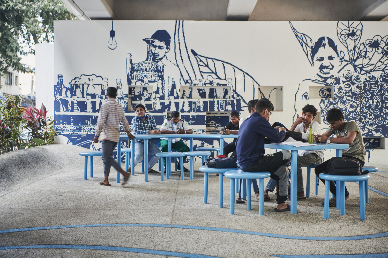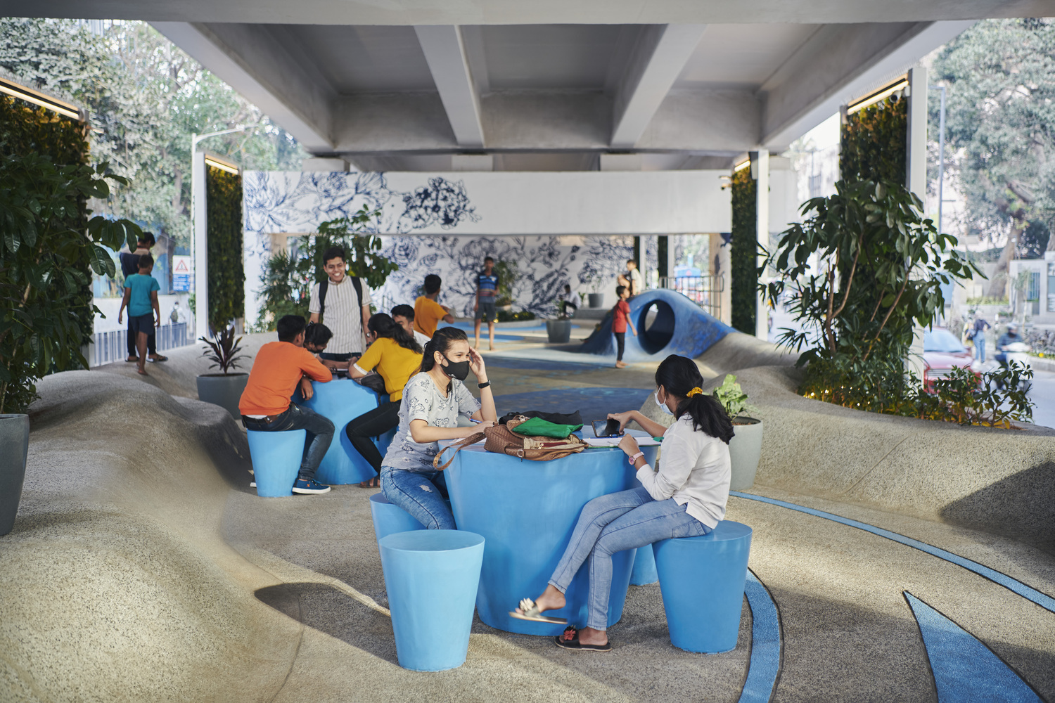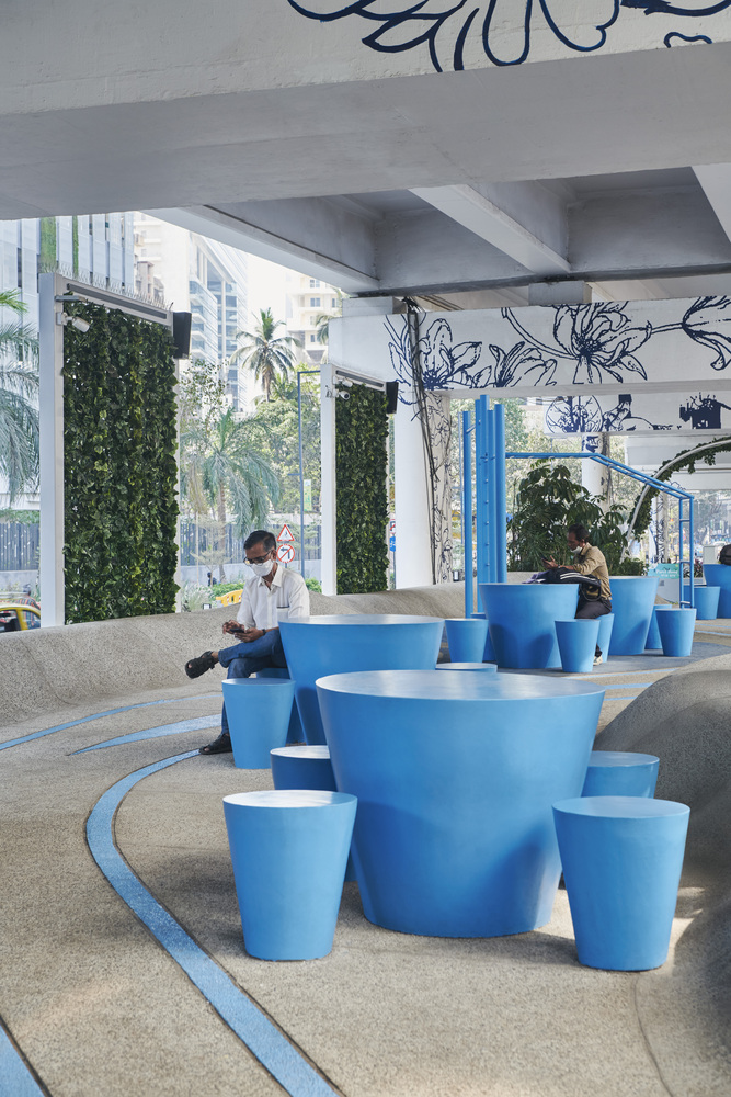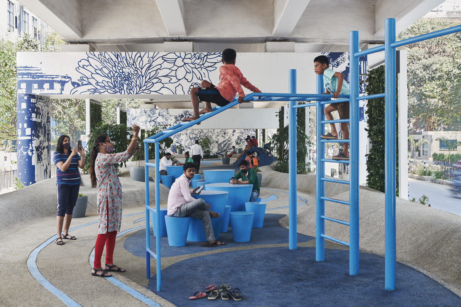 MVRDV, working alongside co architects StudioPOD, has completed the construction of a section of One Green Mile, transforming a series of neglected spaces below Mumbai’s Senapati Bapat Marg flyover. Turning an overbearing element of concrete infrastructure into a public space for the entire local community, the design adds much-needed amenities and greenery, improves mobility, and creates a strong visual identity for the area. On a broader scale, the design offers a repeatable approach to sustainable urban development that asserts a new benchmark for underused public spaces in the intense Indian metropolis.