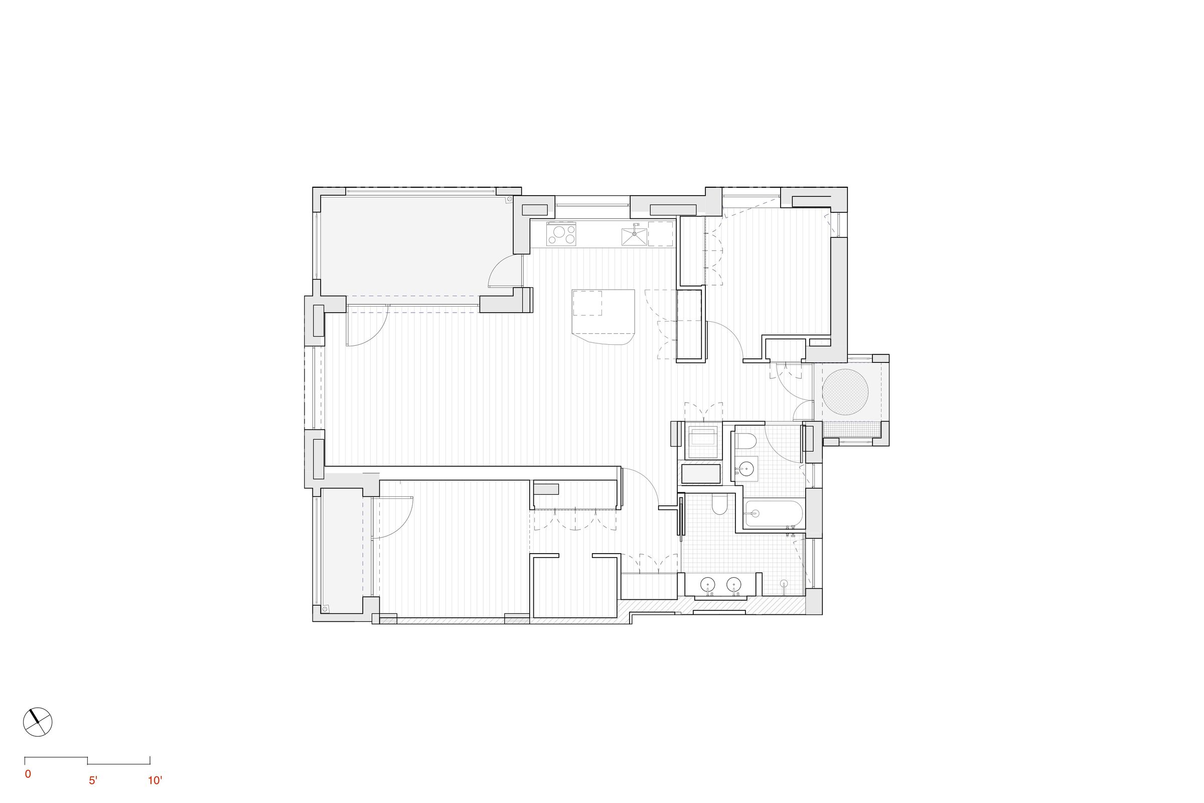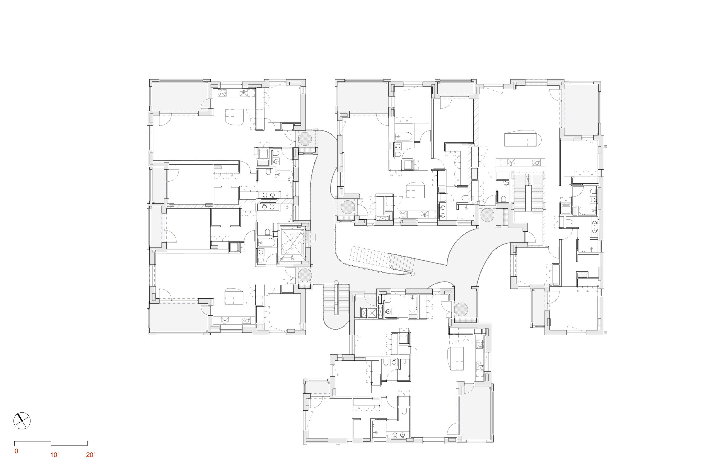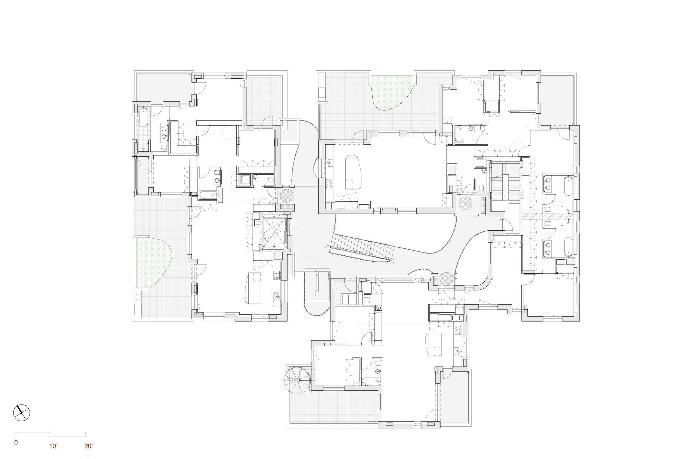 건축공간은 공용공간에서 개인공간으로 점진적으로 변화한다. 각 세대에 위치한 포치는 인근에 위치한 브라운스톤 하우스의 계단과 유사한 기능을 한다. 공용공간과 개인공간 사이에서 적절한 버퍼를 만들어 주는 역활을 한다. 그리고 각 세대는 전용 외부공간을 갖고 있다. 내부 거실로 부터 확장되는 거대한 테라스 또는 거리와 마스터침실의 버퍼를 만들어 주는 발코니를 갖고 있다.