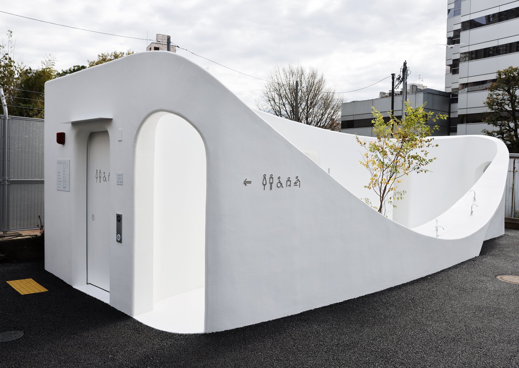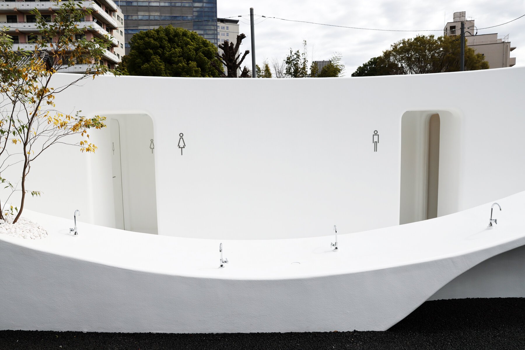 The street facing wall bents at a low height, accommodating a series of washbasins that can be used from inside and outside the Tokyo Toilet structure. This inviting gesture engages passers-by to a pleasing stopover, drinking water, washing their hands, and interacting with other visitors. Its organic shape enables people of different ages and states to visit the area easily. Young children can reach the lowest point of the curve, as well as people in wheelchairs can operate the hollowed spots.