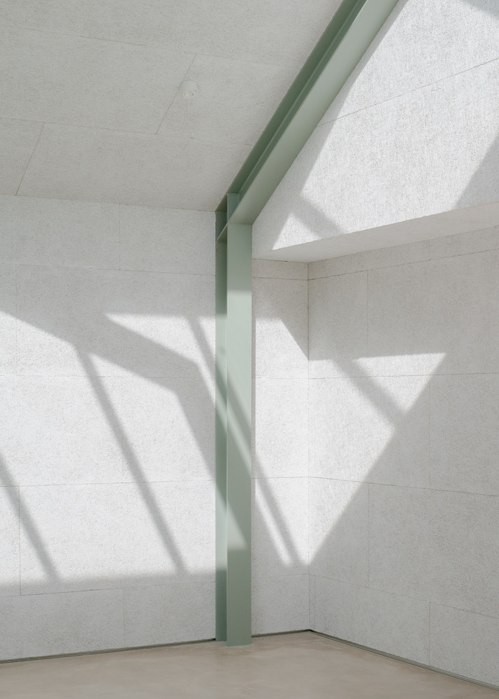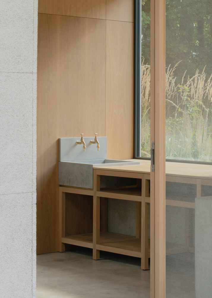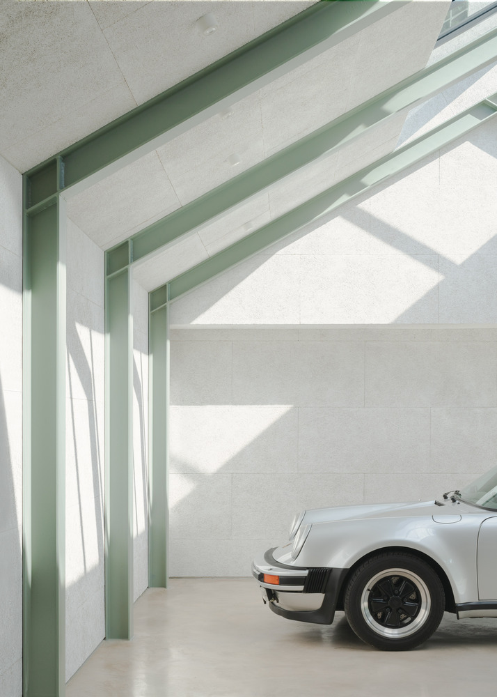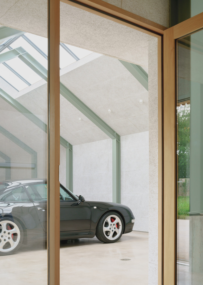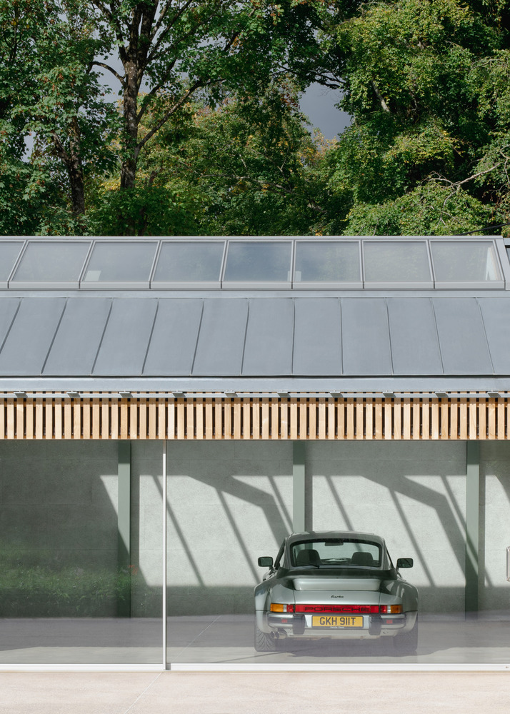 A natural, pragmatic palette of timber, steel, concrete, and recycled wood strand board combine to create a feeling of serenity and cleanliness. Their quiet tones allow the fleet of classic cars to become the focus. As a project proposed to adapt over time, significant consideration has been given to how it weathers; the zinc roof and its concealed gutters will dull, complementing the silver patination of the sweet chestnut cladding, and the tones of the concrete plinth.