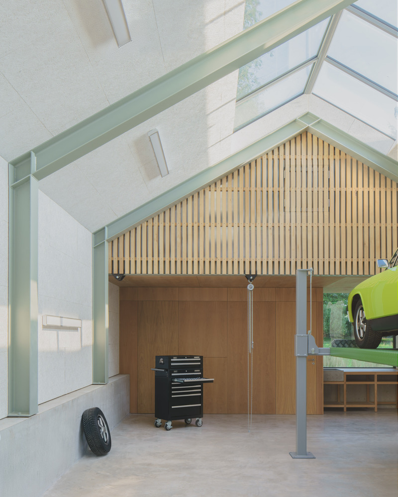 The Autobarn comprises a long, slender garage that intersects with a hardy workshop space appearing as two pitched volumes in an L-shaped plan. The spaces are top lit by overhead glazing that runs along the apex of their angular roofs, illuminating the five-bay garage and the taller mechanic workshop below. Bindloss Dawes integrated a sleek timber tool store and washbasin at the perimeter of the workshop, which overlooks the leafy gardens beyond through a large double-glazed window. A toilet and further storage are concealed by timber joinery under stairs which lead to a mezzanine study, diversifying the spaces on offer for future use.