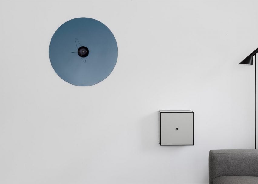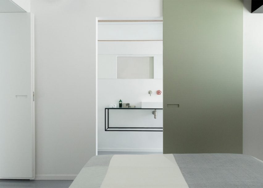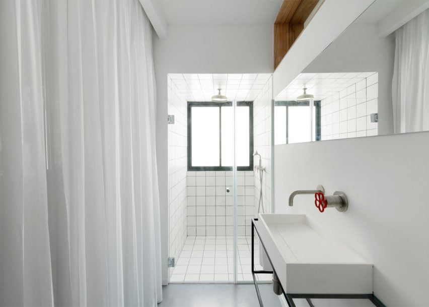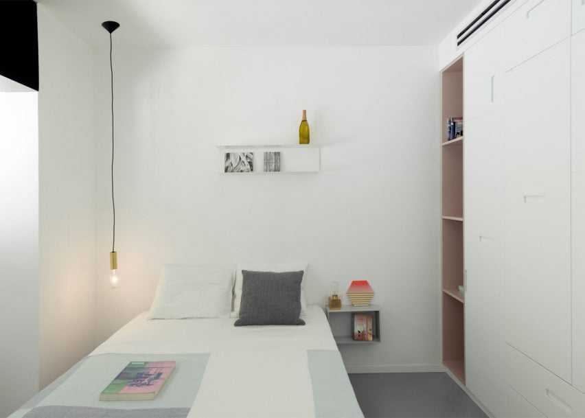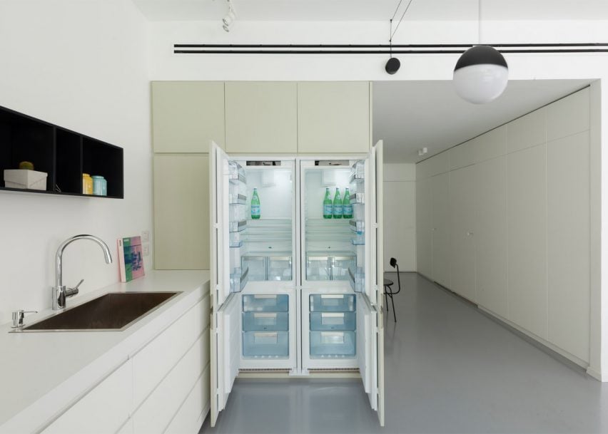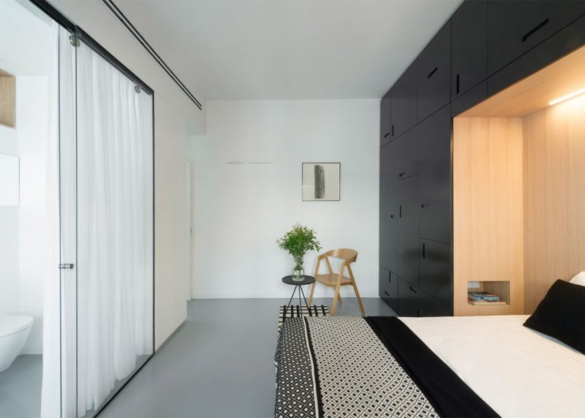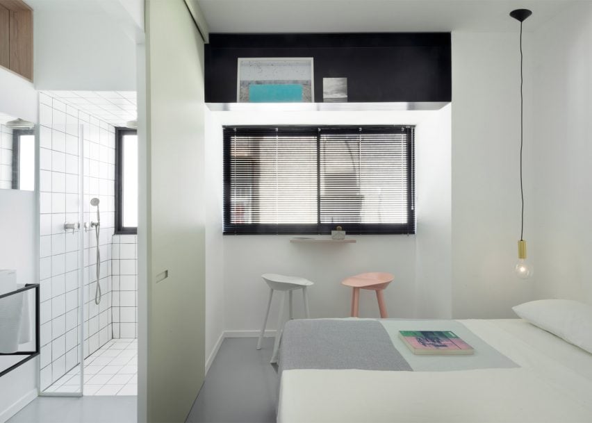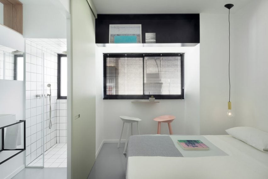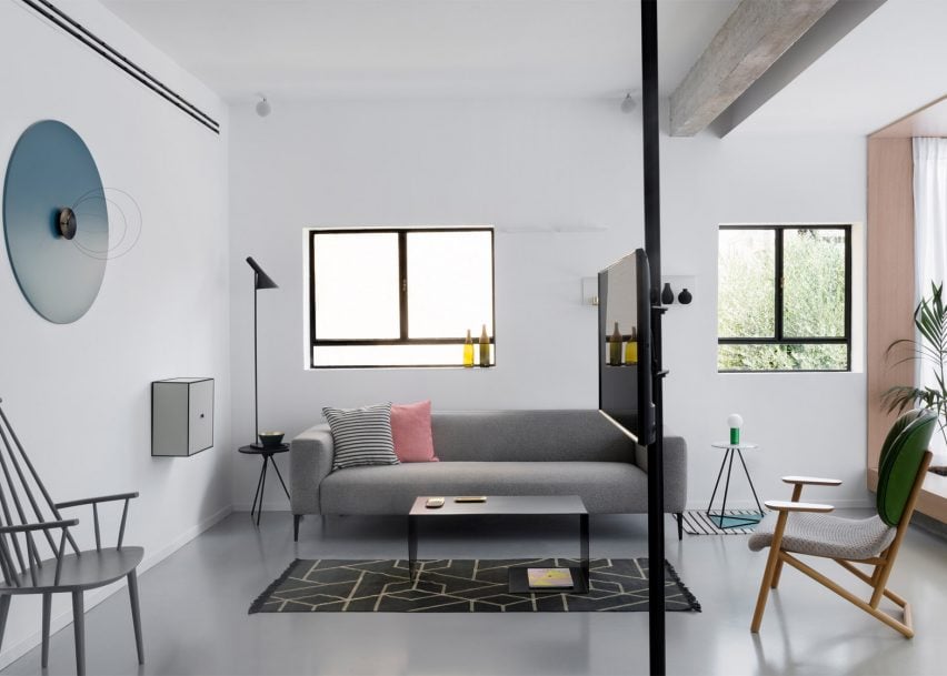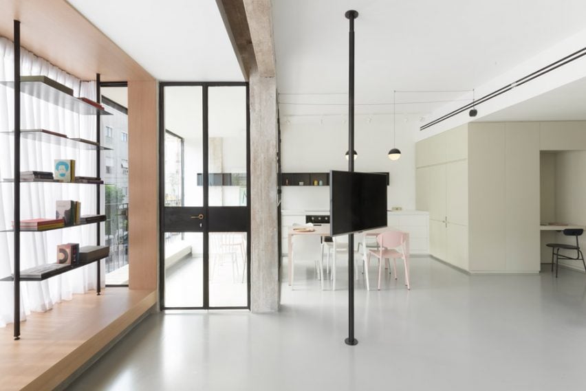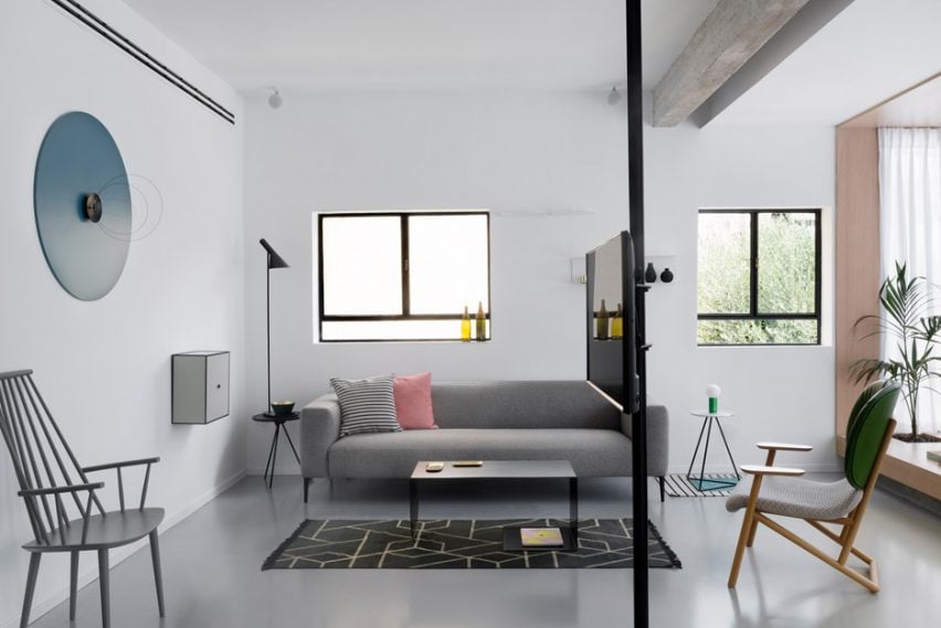 The otherwise light coloured Tel Aviv flat features strong door and window frames, a black pole that acts as a TV stand, and furniture that looks like line drawings.