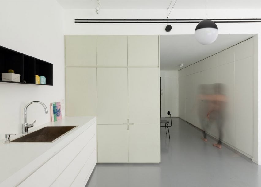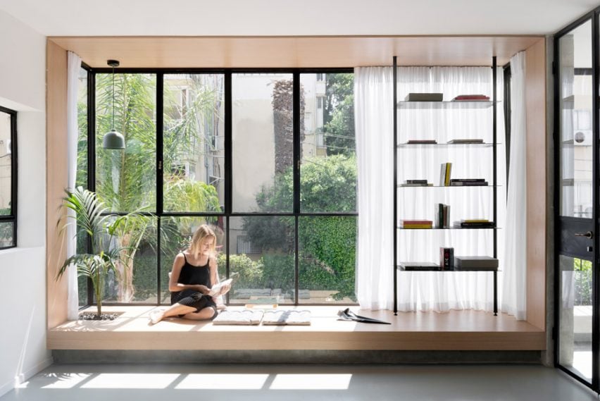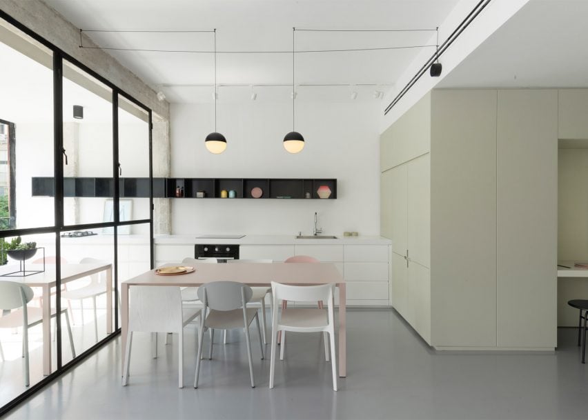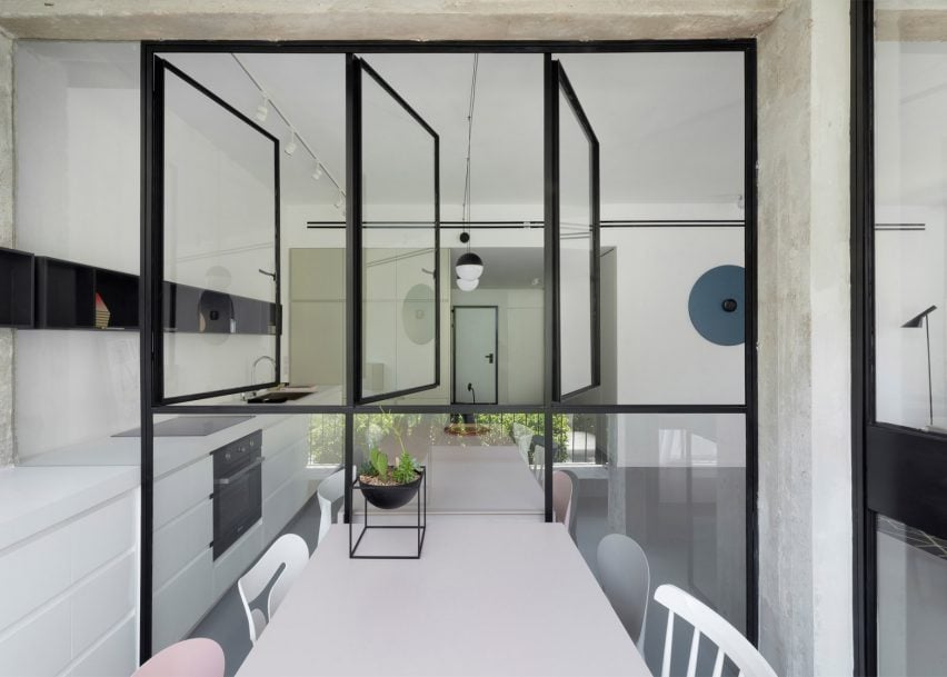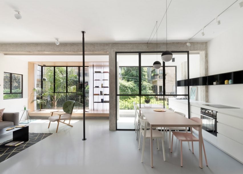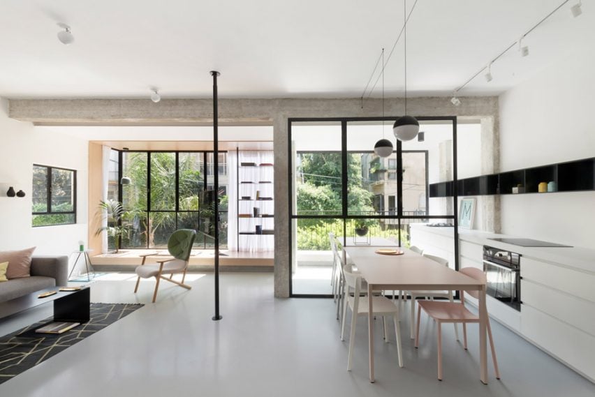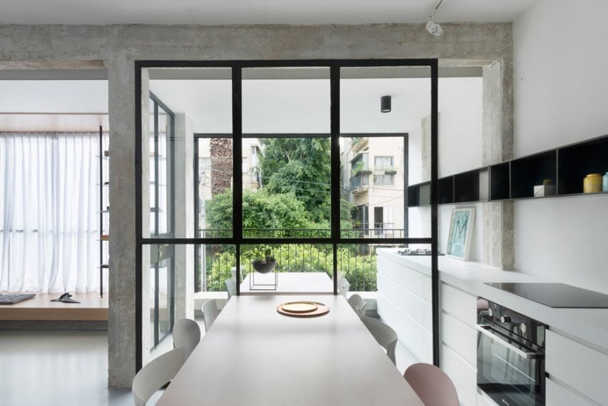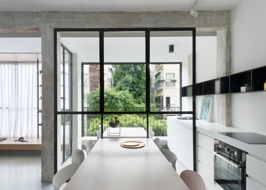 Interior designer Maayan Zusman and architect Amir Navon have transformed a rundown apartment in Israel into an airy space punctuated by delicate black frames and furnishings.