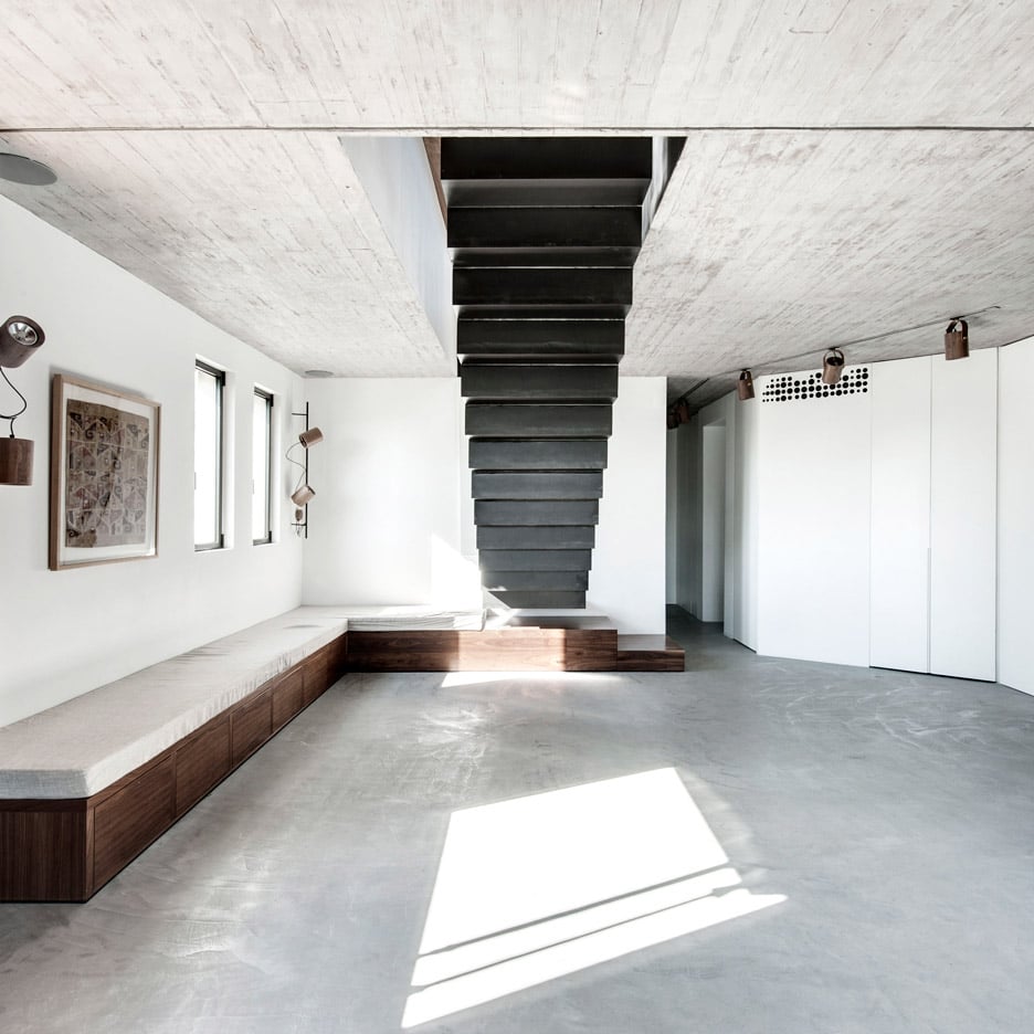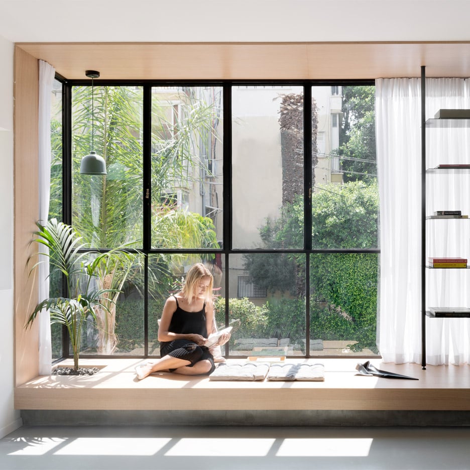 델아비브 아파트 인테리어의 특징은 밝은 컬러를 바탕으로 인상적인 블랙 프레임과 가구가 포인트로 적용된 공간 경험이다. 시선을 집중시키는 동시에 다양한 영역을 구분하는데 도움을 준다. 95m2 크기의 아파트는 두개의 침실이 배치되고, 각각 커튼으로 분리된 실내 욕실이 배치된다. 무엇보다 공간을 정의하는 창가자리의 코지한 윈도우시트는 백색공간 속 가장 따뜻한 장소로 제공된다.